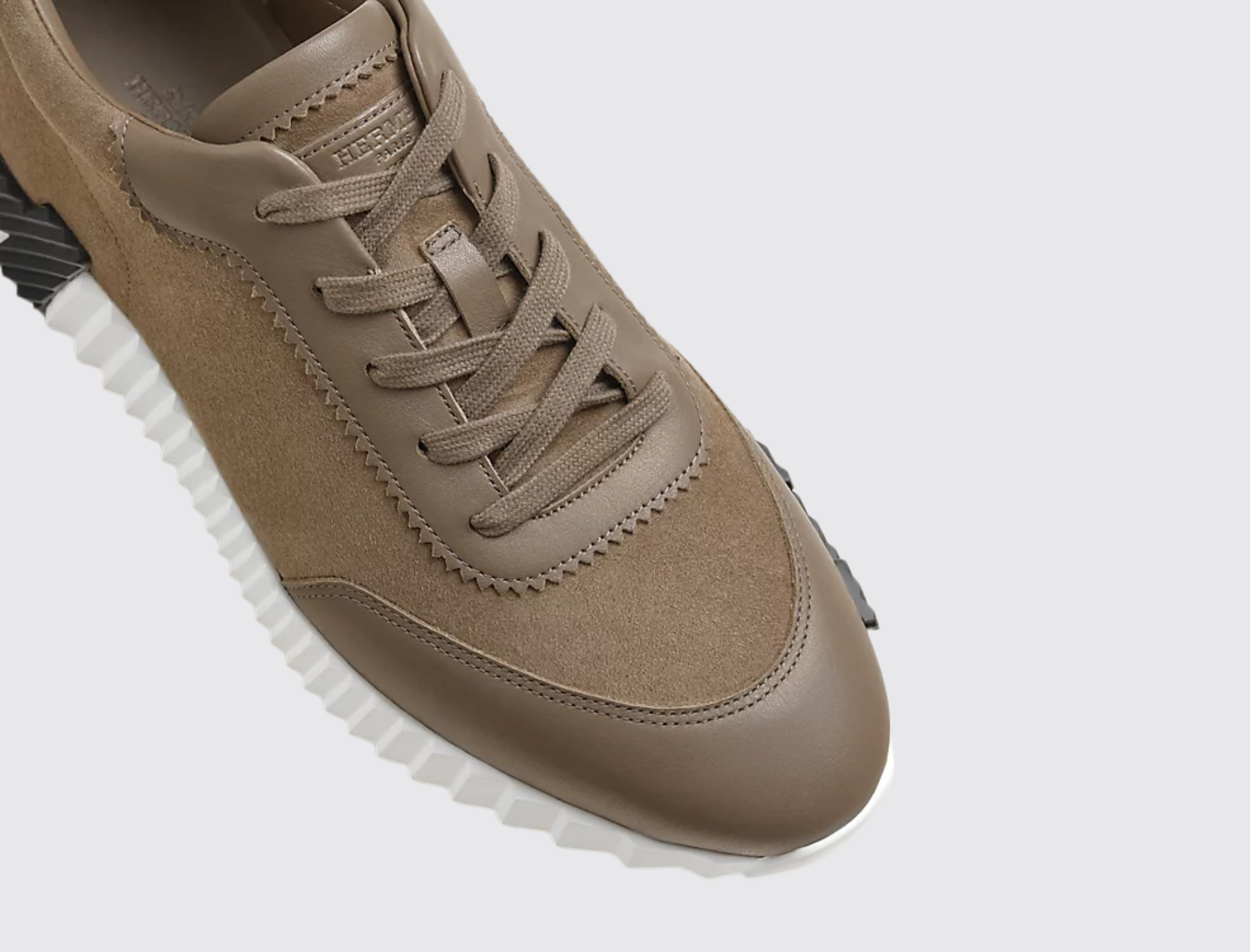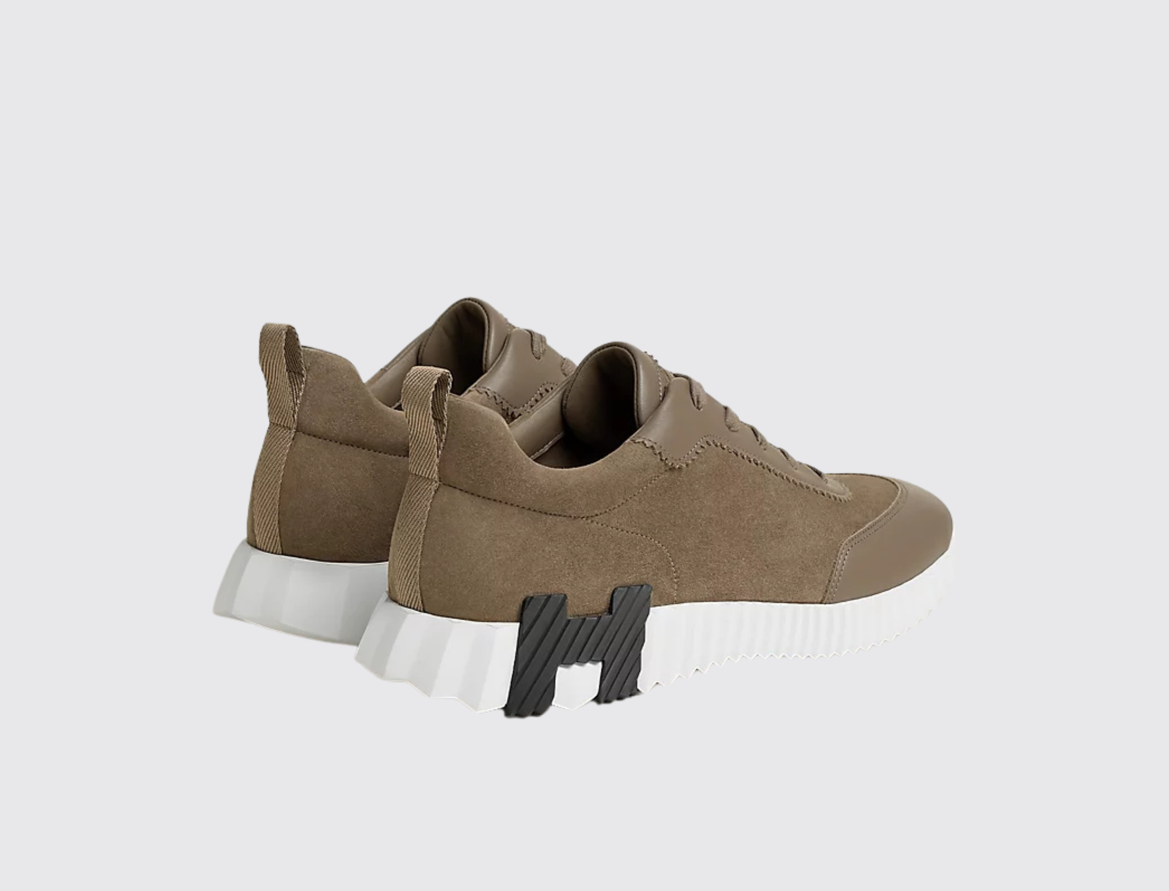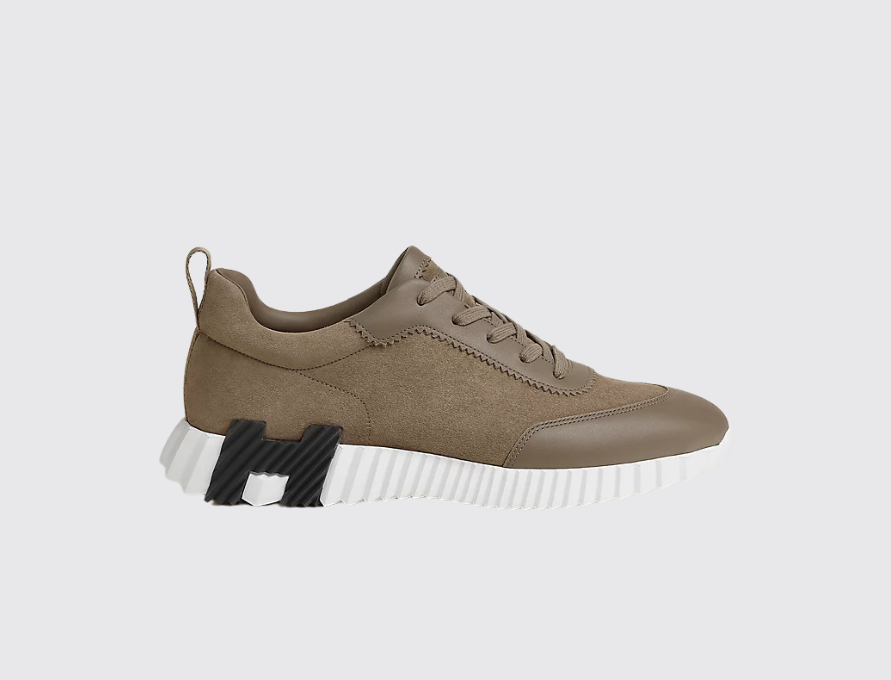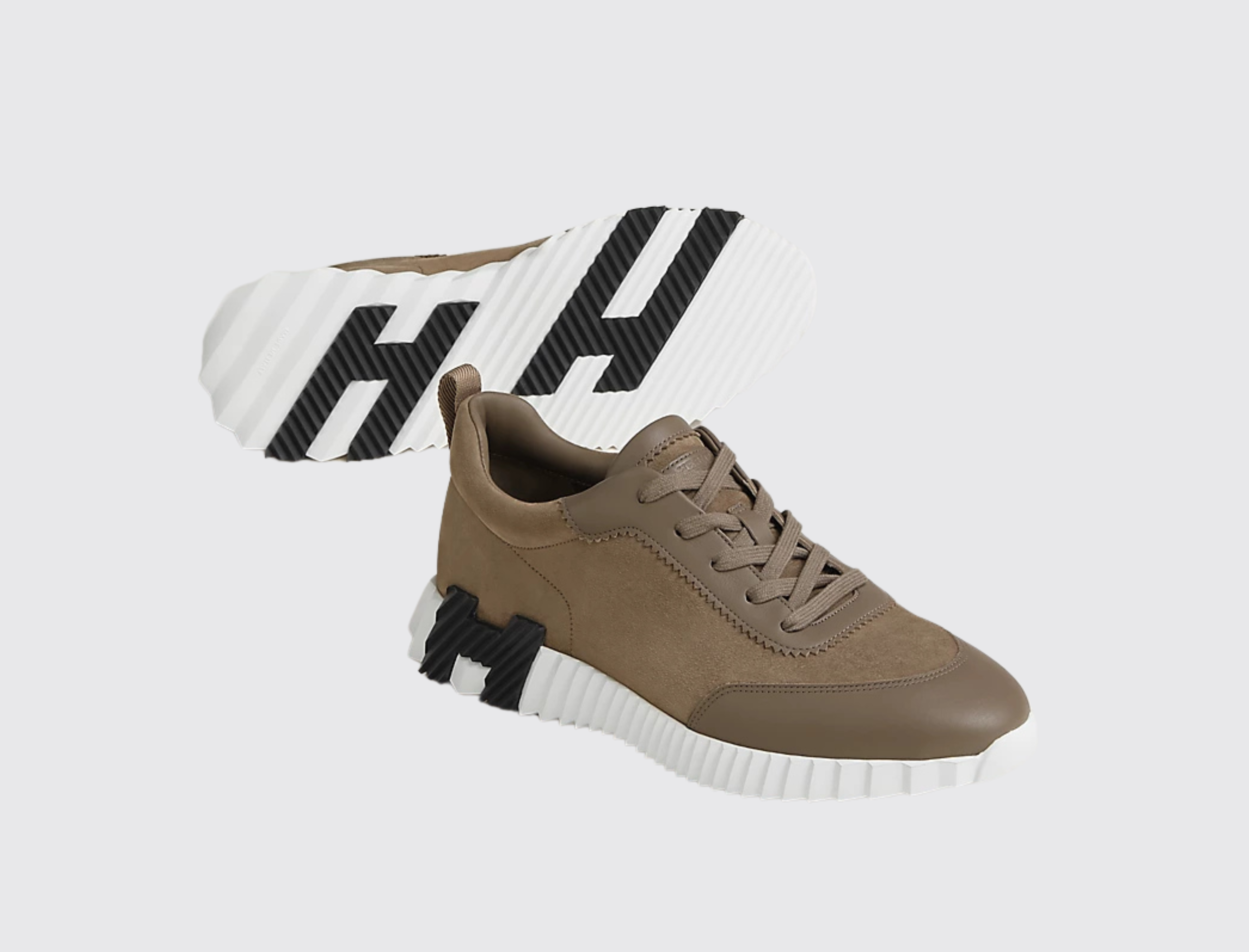 Showing a clean pair of heels, the Bouncing sneaker ventures into urban effervescence. So light that it no longer appears to touch the ground and full of untamed energy, it turns every moment into a high-speed adventure. Thinking big, it features a signature "H en biais" motif in a bold, oversized format.
