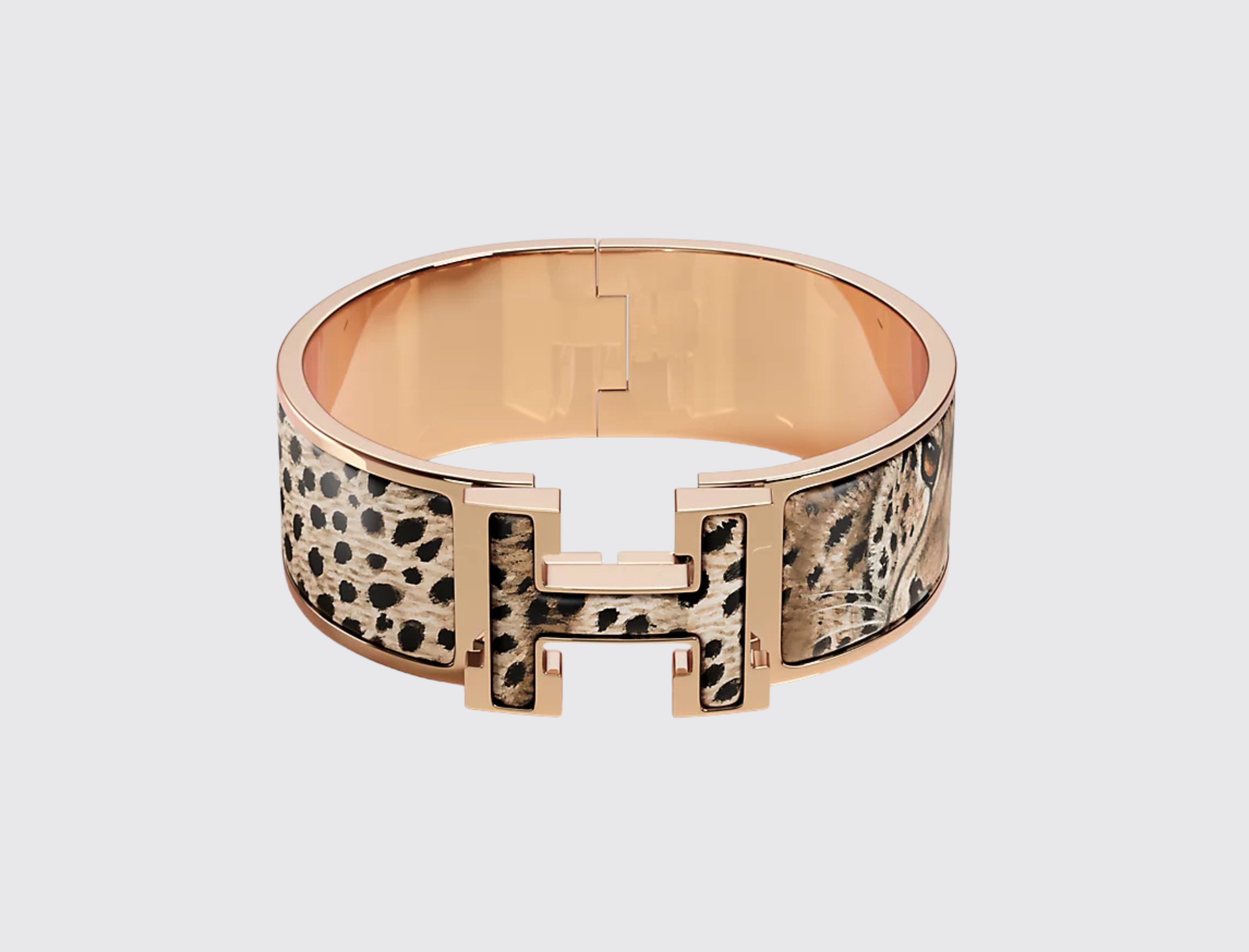 The Clic Clac H bracelet features a wide design with the classic Hermes H logo. It is adorned with unique printed enamel
