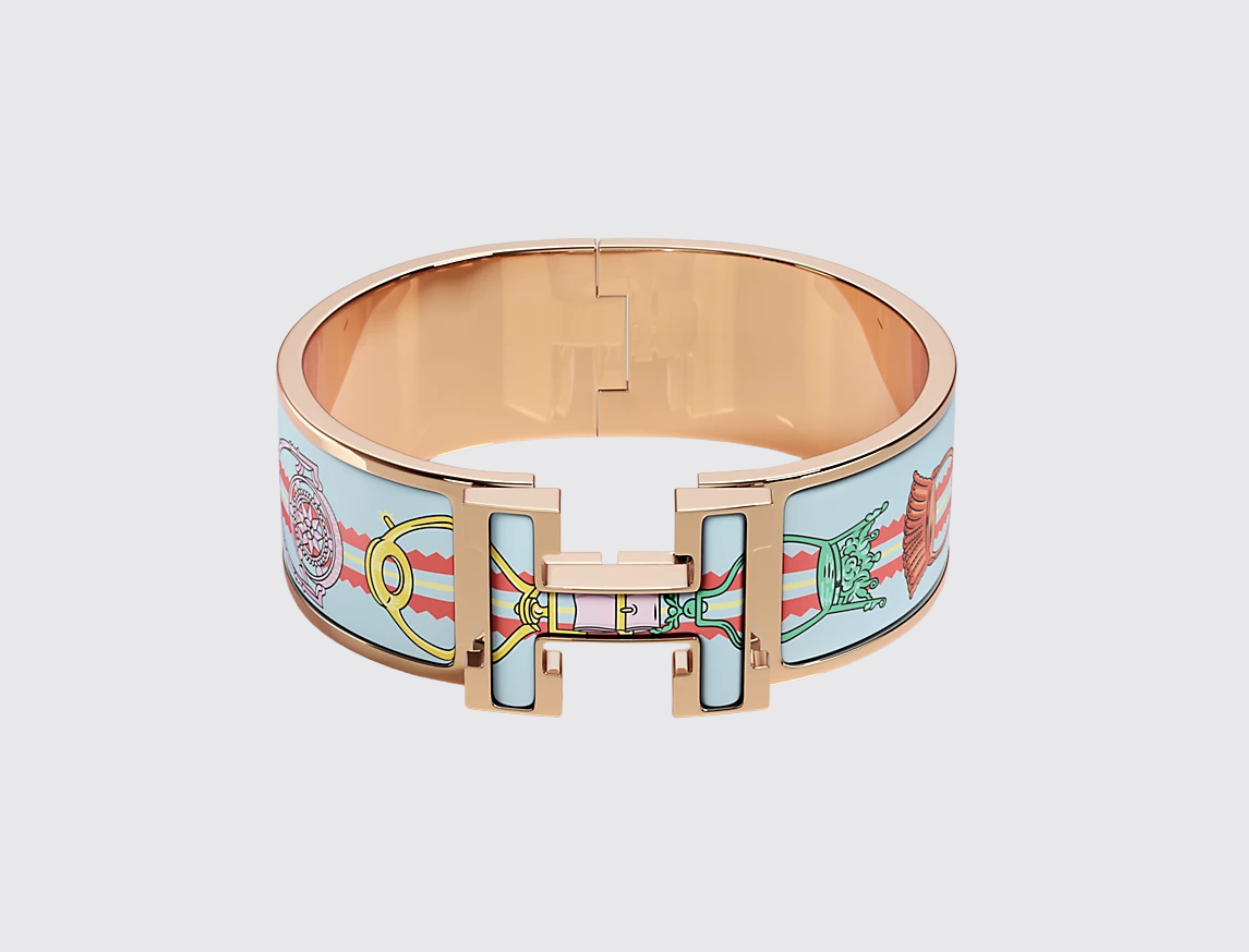 The Clic Clac H bracelet features a wide design with the classic Hermes H logo. It is adorned with unique printed enamel