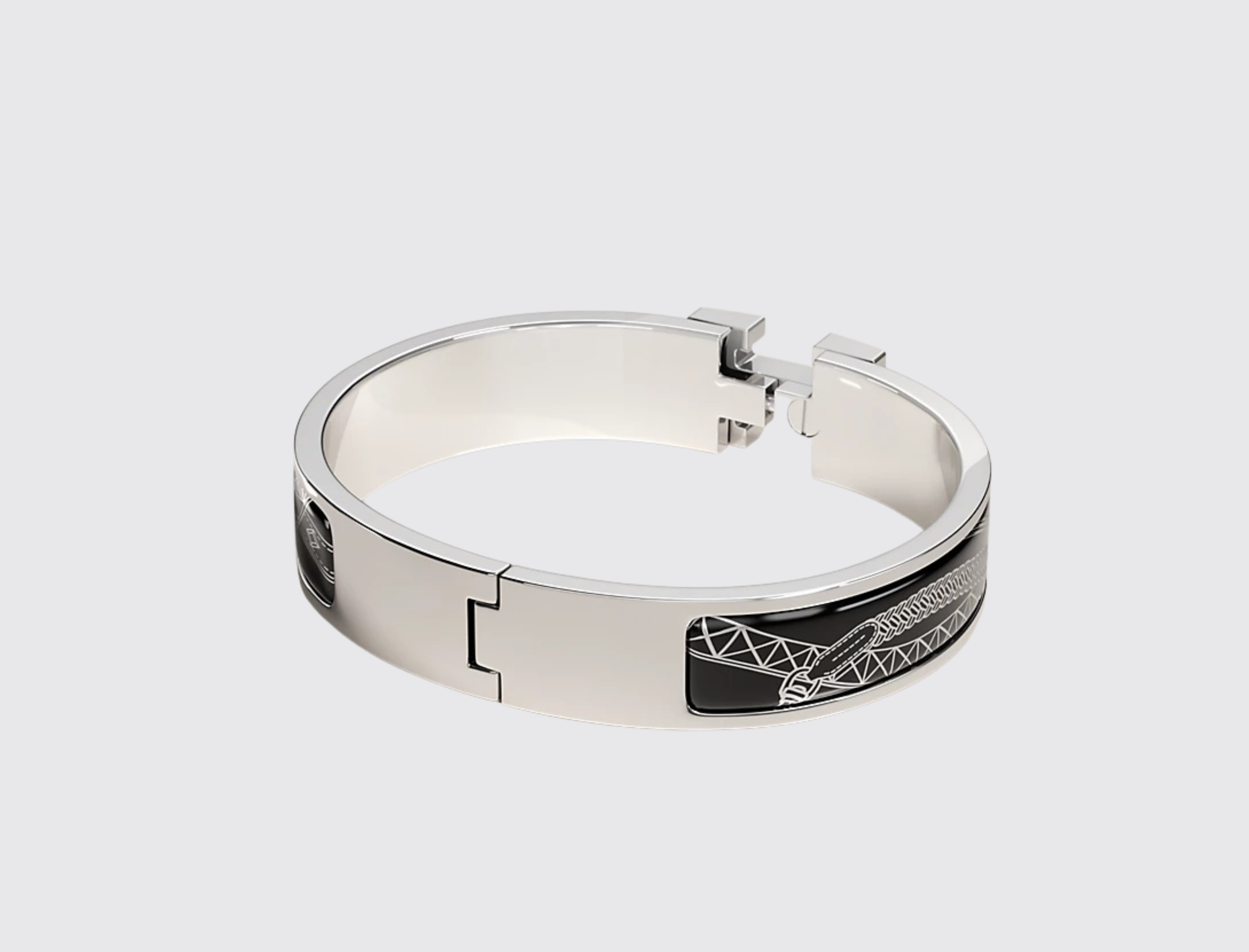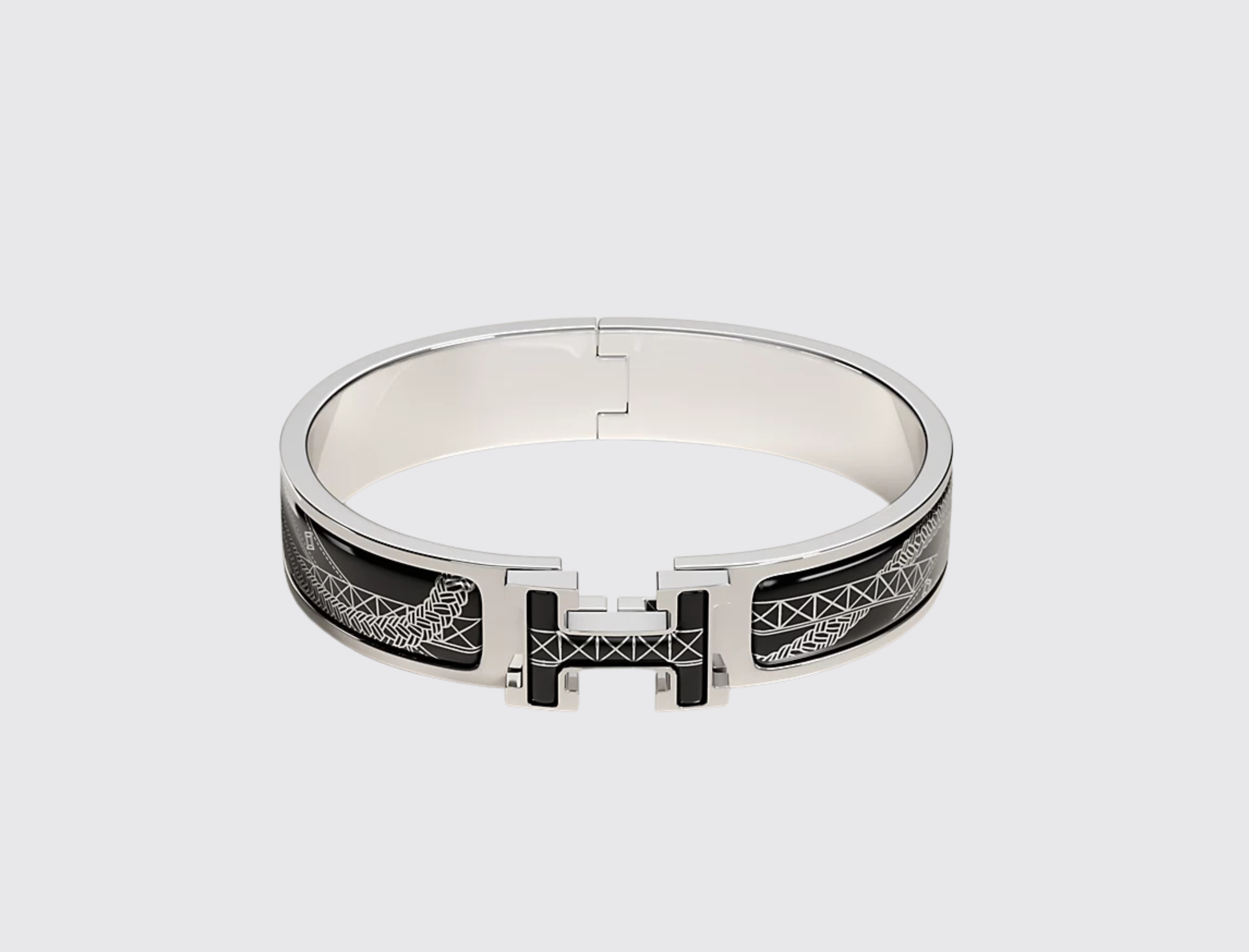 The Clic H Grand Apparat Bracelet features a narrow design adorned with the distinctive Jour de Casting printed enamel. Its innovative toggle clasp, shaped as an "H," ensures secure and elegant closure, combining refined craftsmanship with a sophisticated aesthetic.