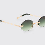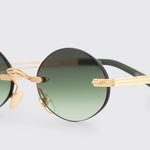 The Tussy II frame is made of yellow gold metal. It features green gradient nylon lenses with matching temple tips.