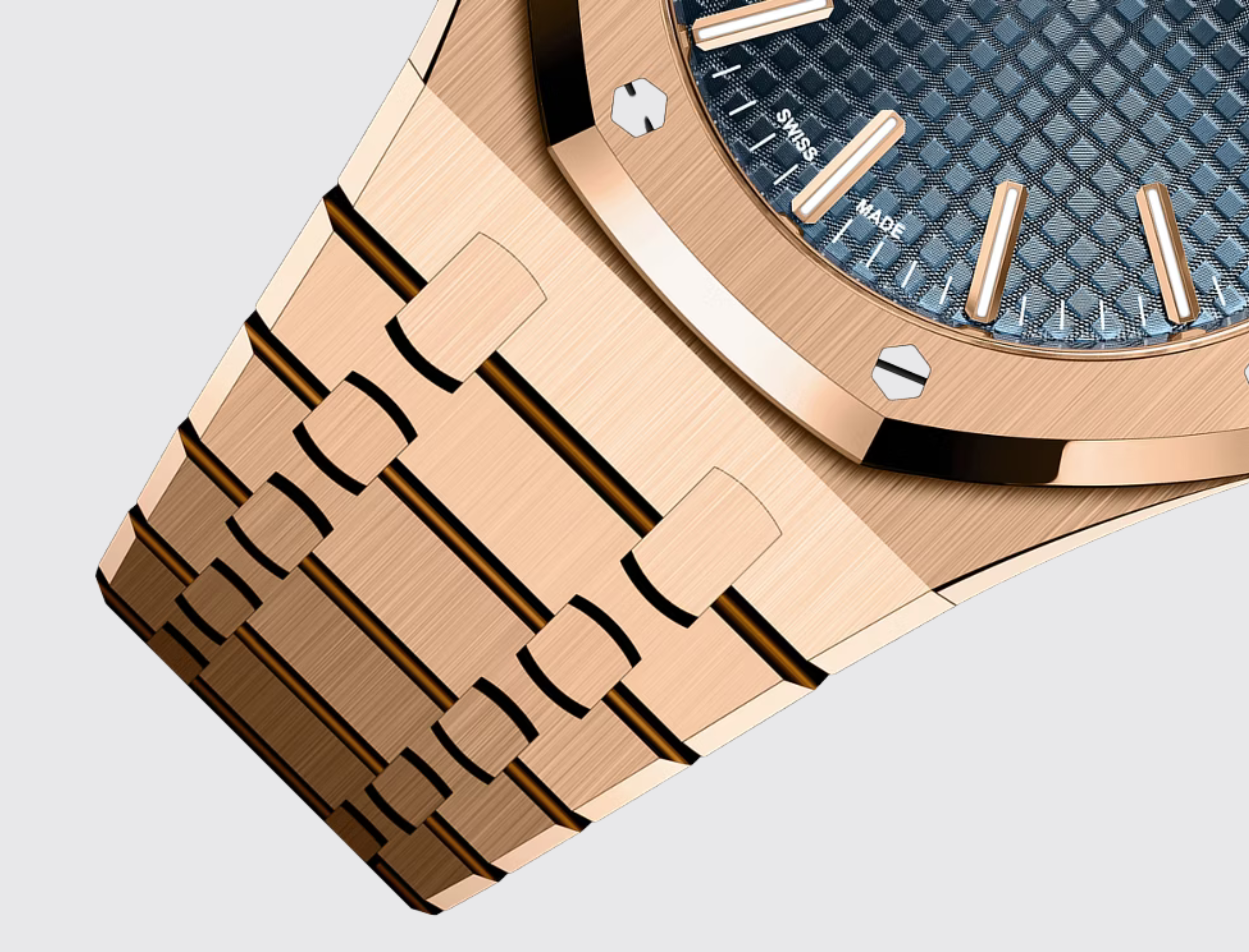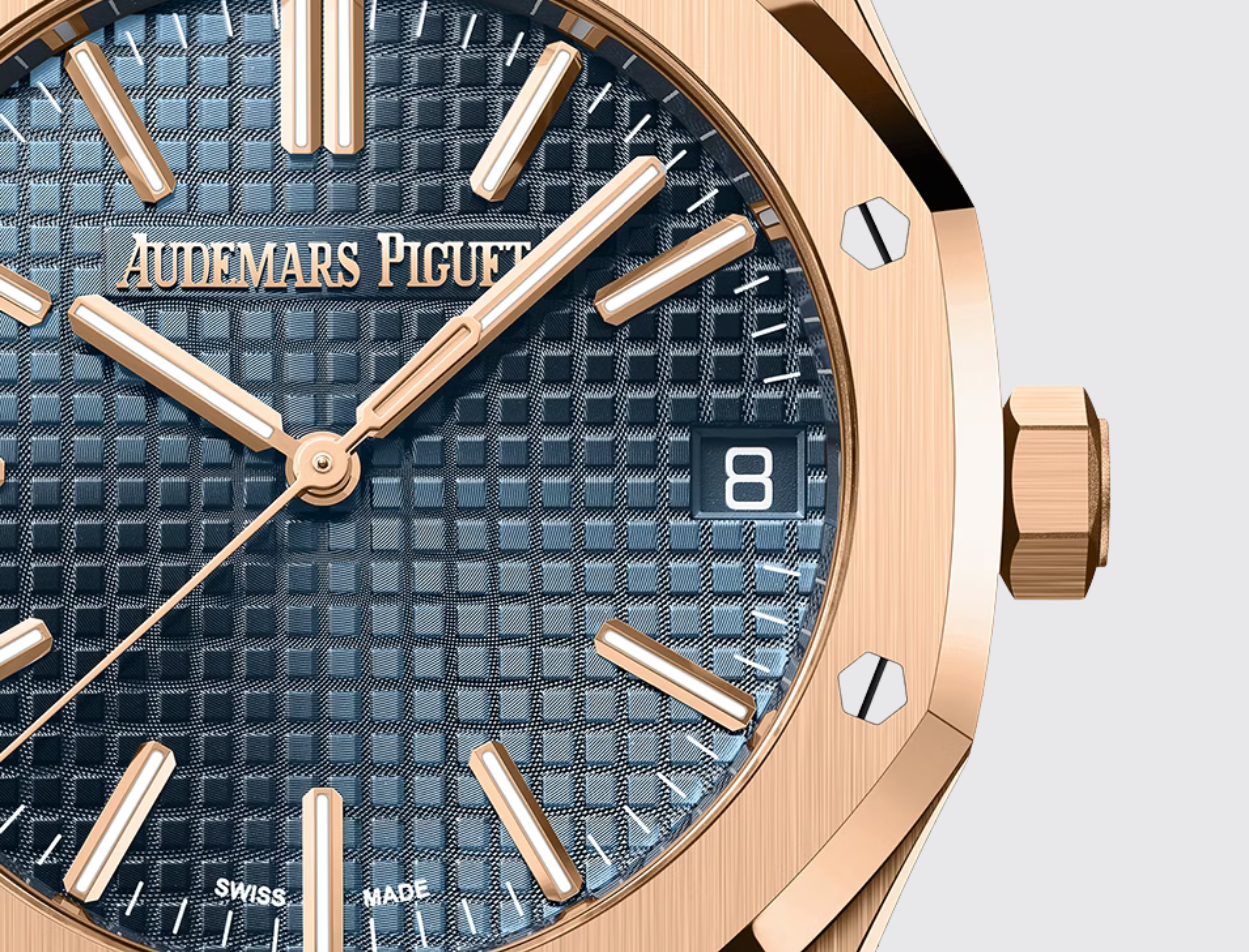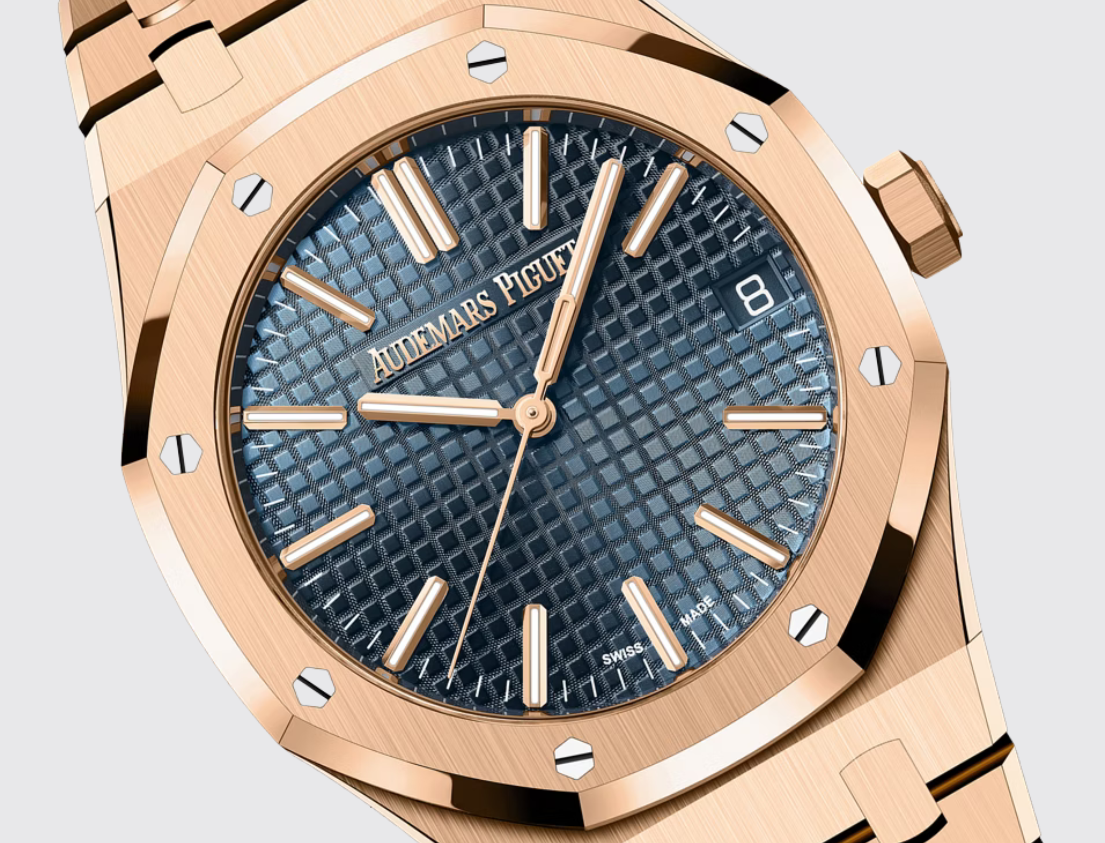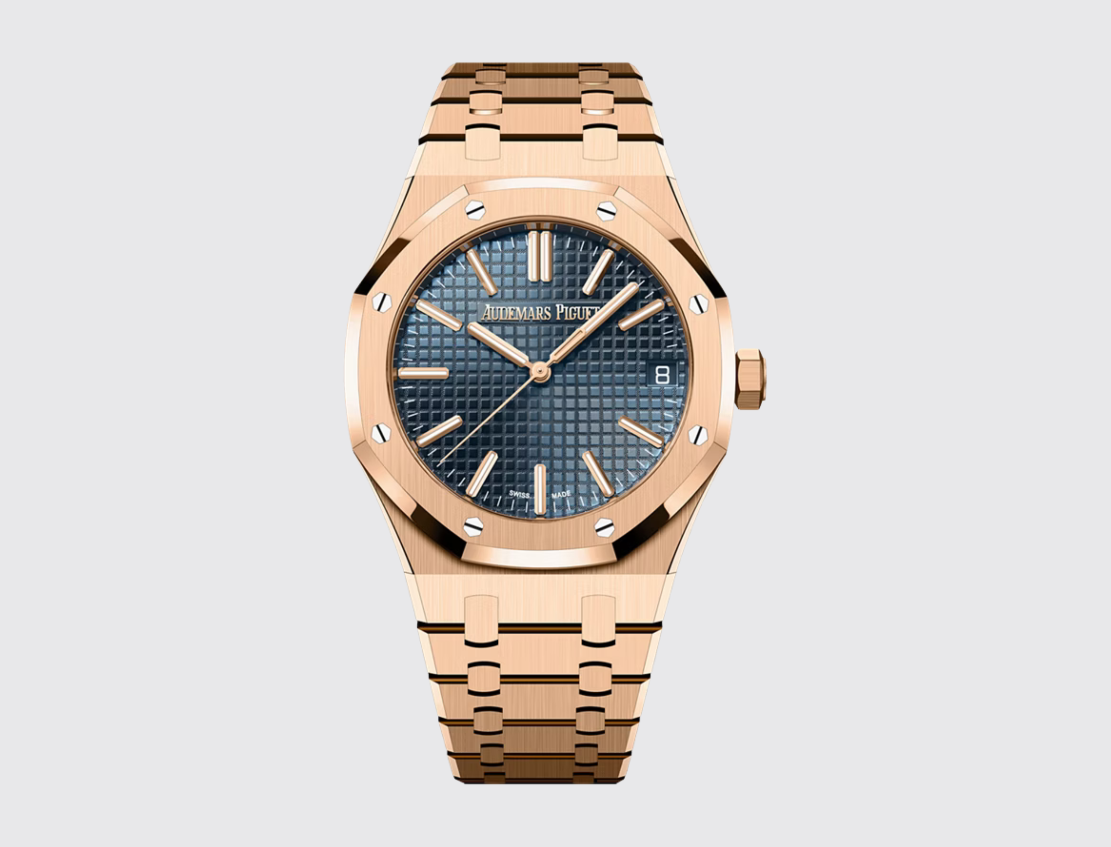 This 18-carat pink gold 41 mm Royal Oak Selfwinding is enriched with a "Grande Tapisserie" dial in the iconic "Bleu Nuit, Nuage 50" shade of the 1972 model. It also showcases the collection’s latest design evolution.