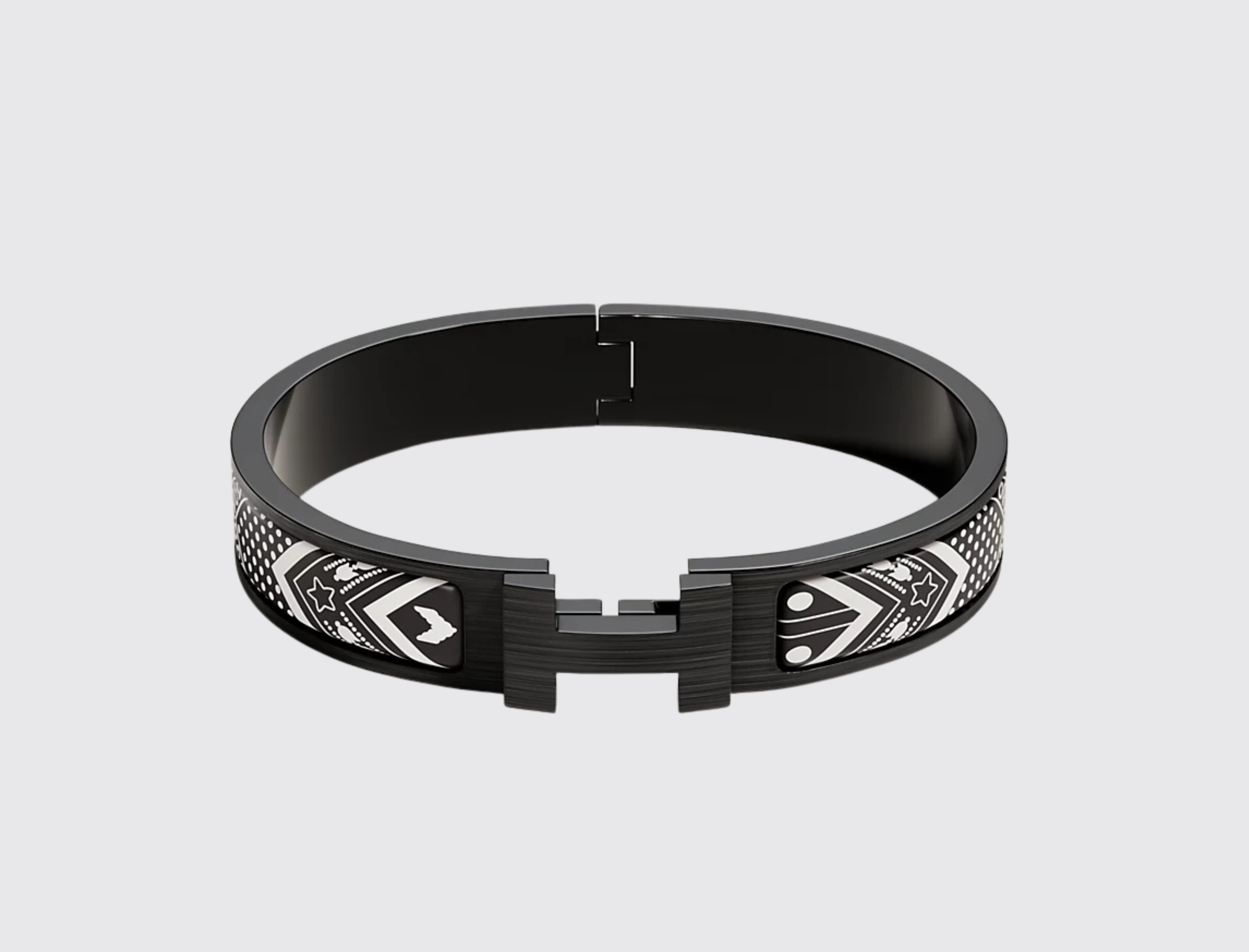 The Clic Clac H bracelet features a slim design with the classic Hermes H logo. It is adorned with unique printed enamel.