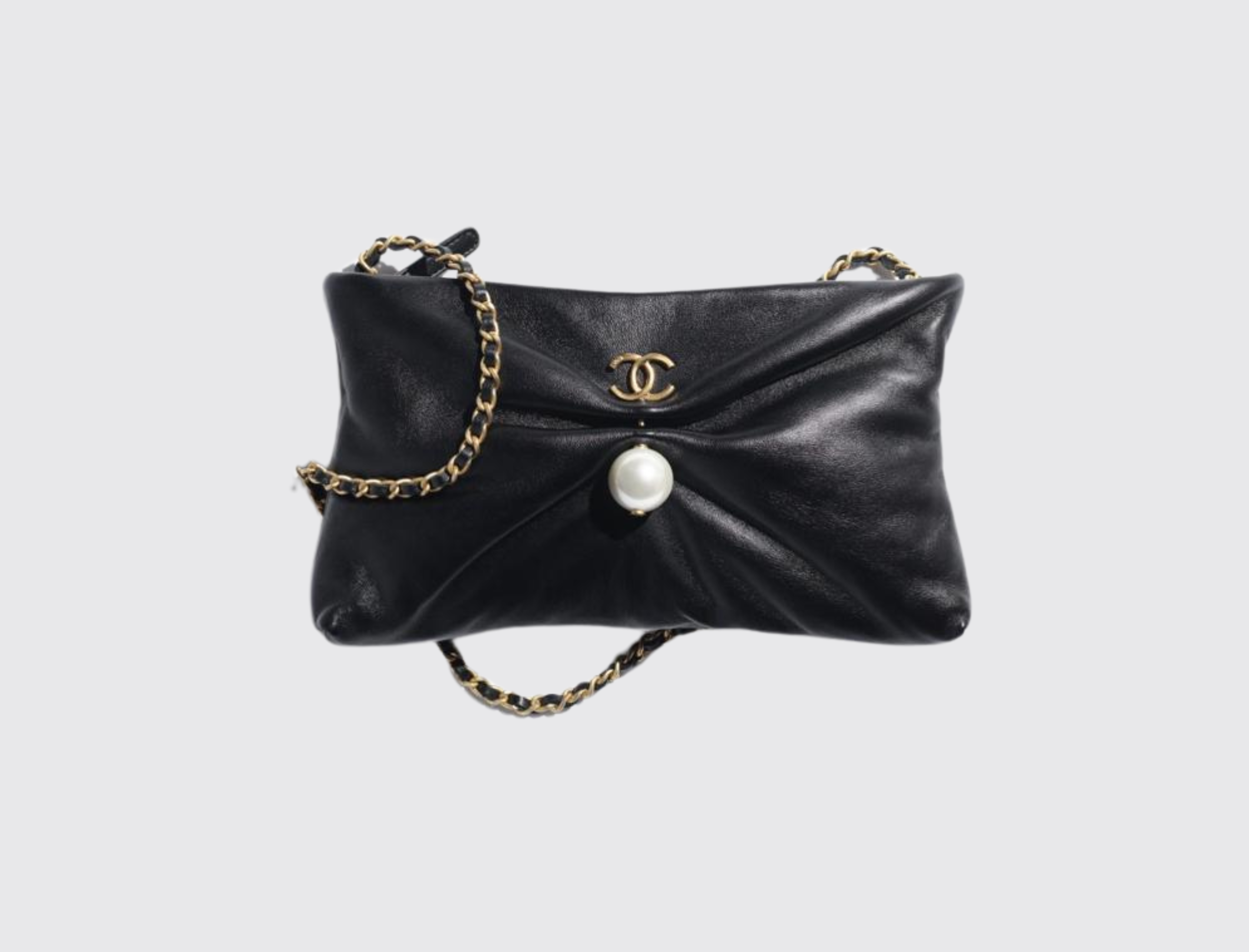 The Chanel Clutch is a chic accessory, blending practicality with luxury. This statement bag features a compact design with a signature shiny leather finish, the classic Chanel chain strap, and the iconic brand logo.