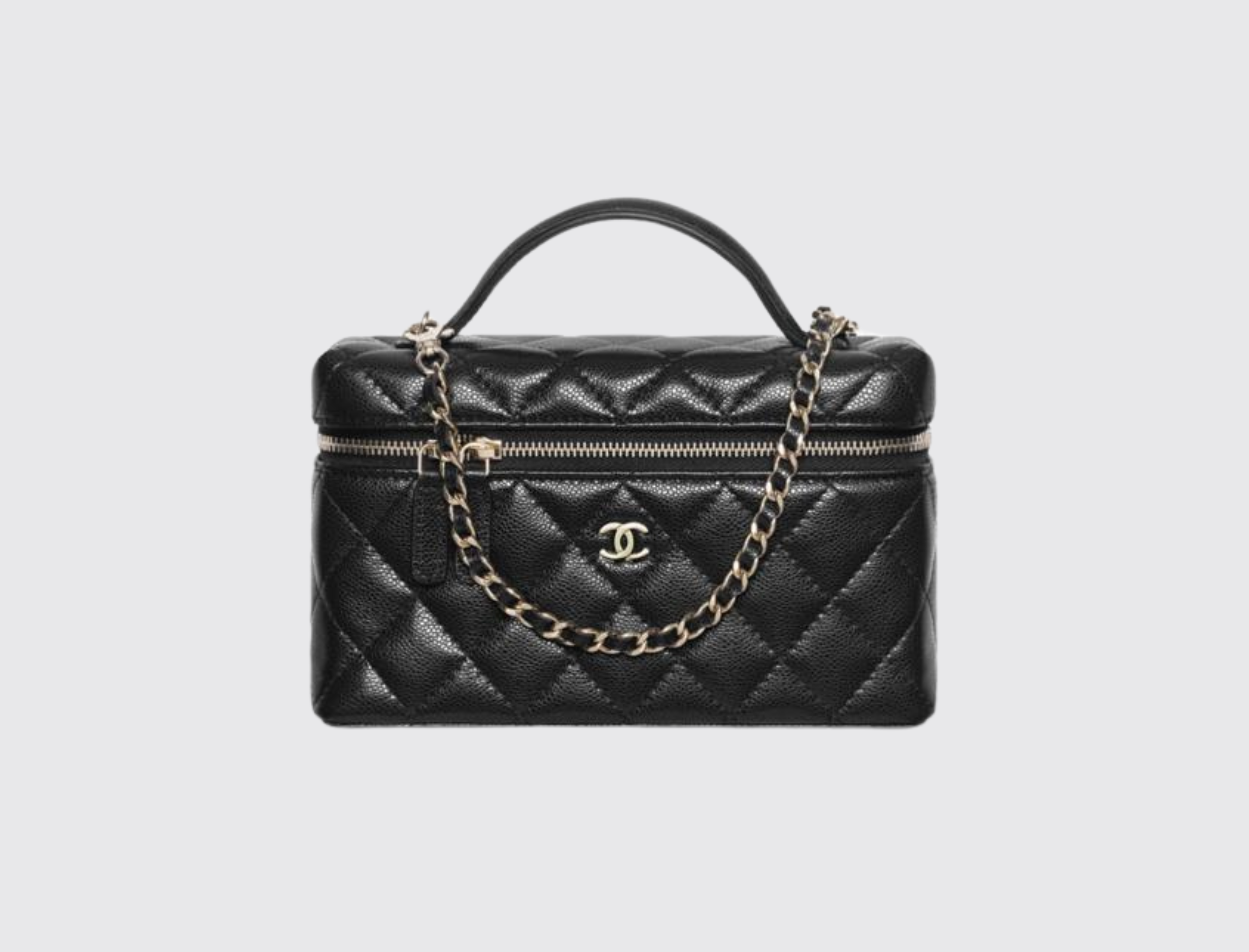 The Chanel Vanity is a chic accessory, blending practicality with luxury. This structured bag features a compact design with a signature quilted leather finish, the classic Chanel chain strap, and the iconic brand logo.