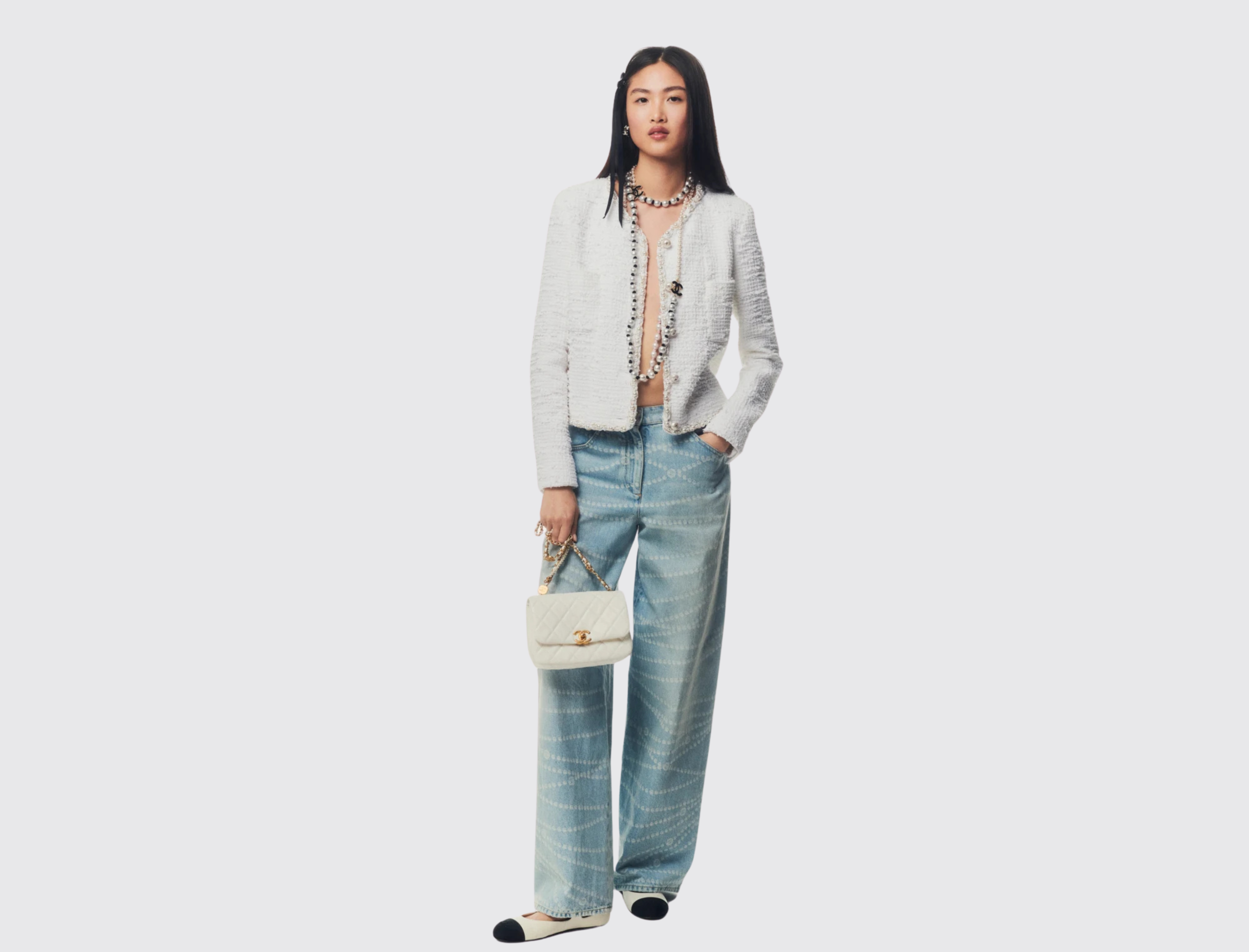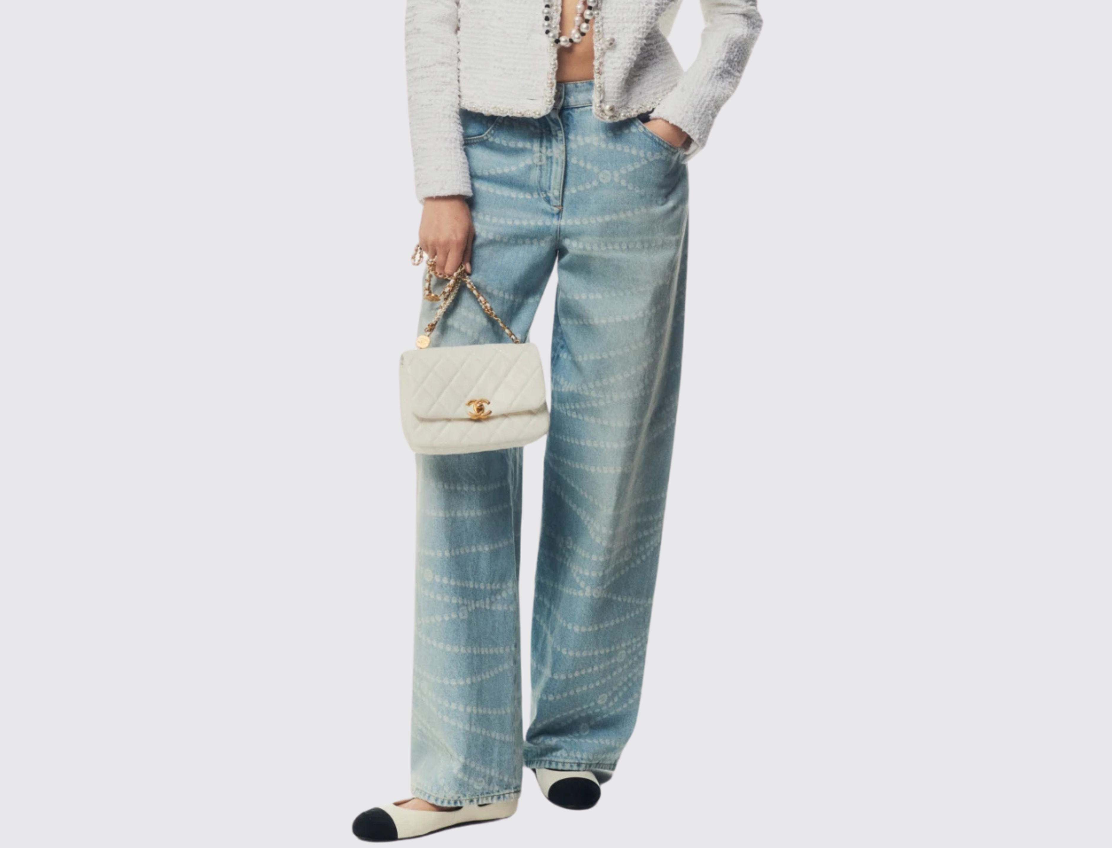 Crafted from washed denim with a unique printed design, these Chanel jeans redefine casual luxury. The relaxed fit and signature detailing make them a timeless statement piece, effortlessly blending style and comfort.