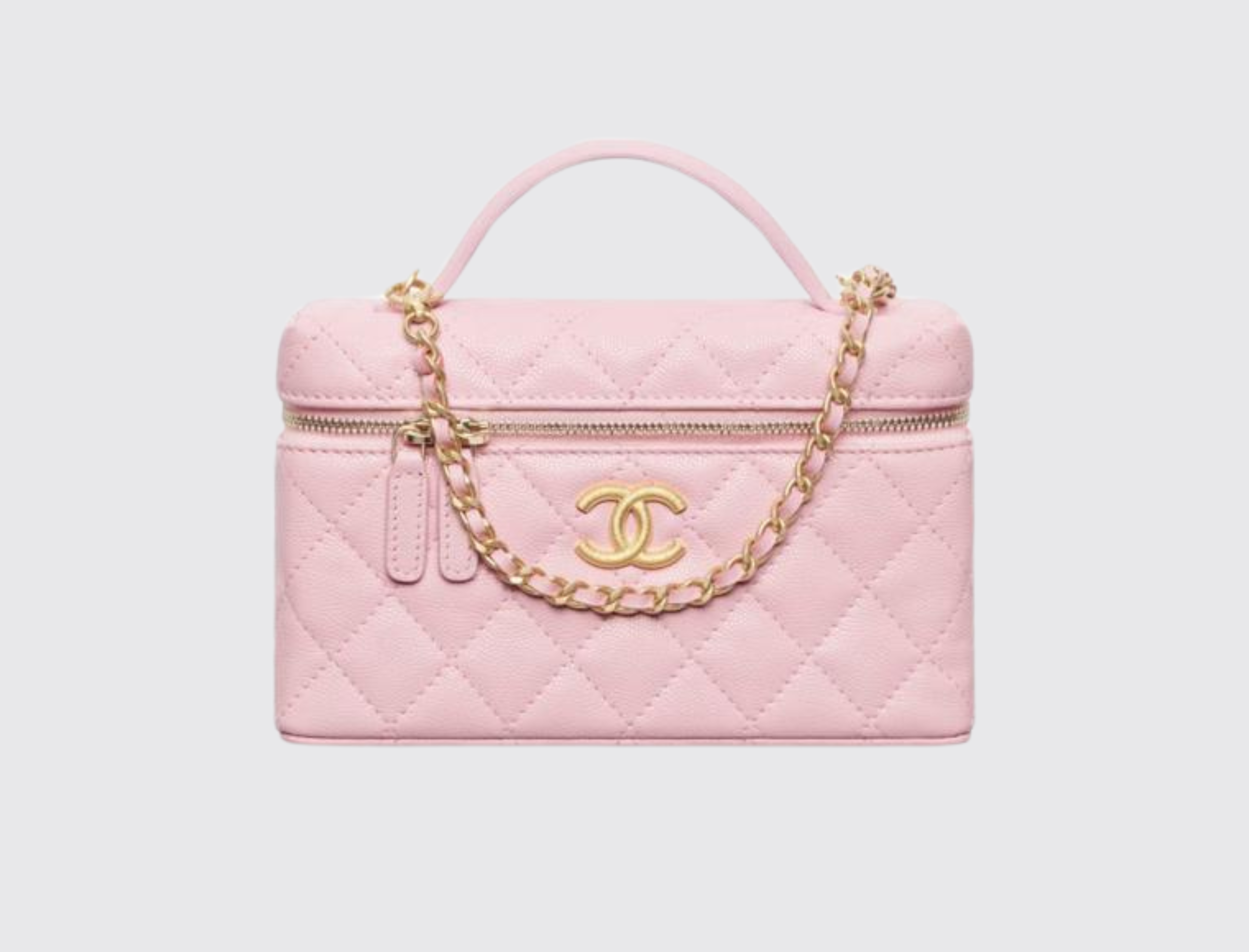 The Chanel vanity is a chic accessory, blending practicality with luxury. This structured bag features a compact design with a signature quilted leather finish, the classic Chanel chain strap, and the iconic brand logo.