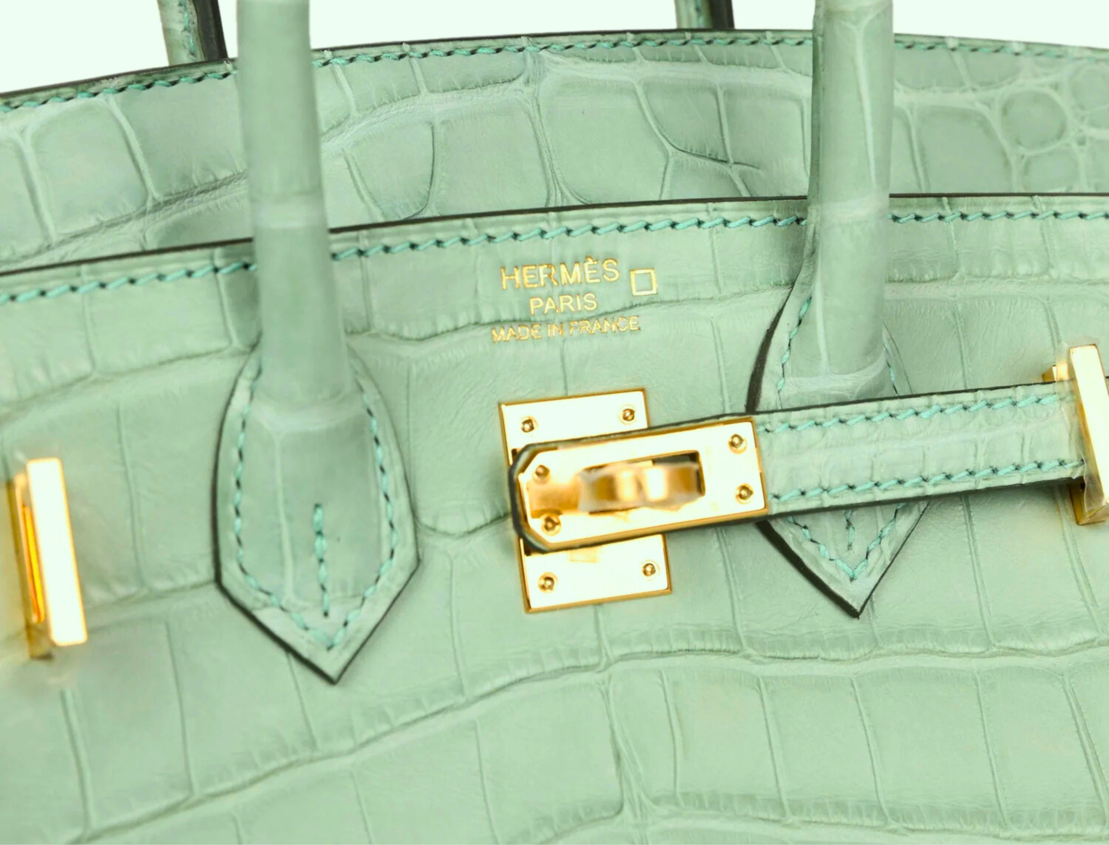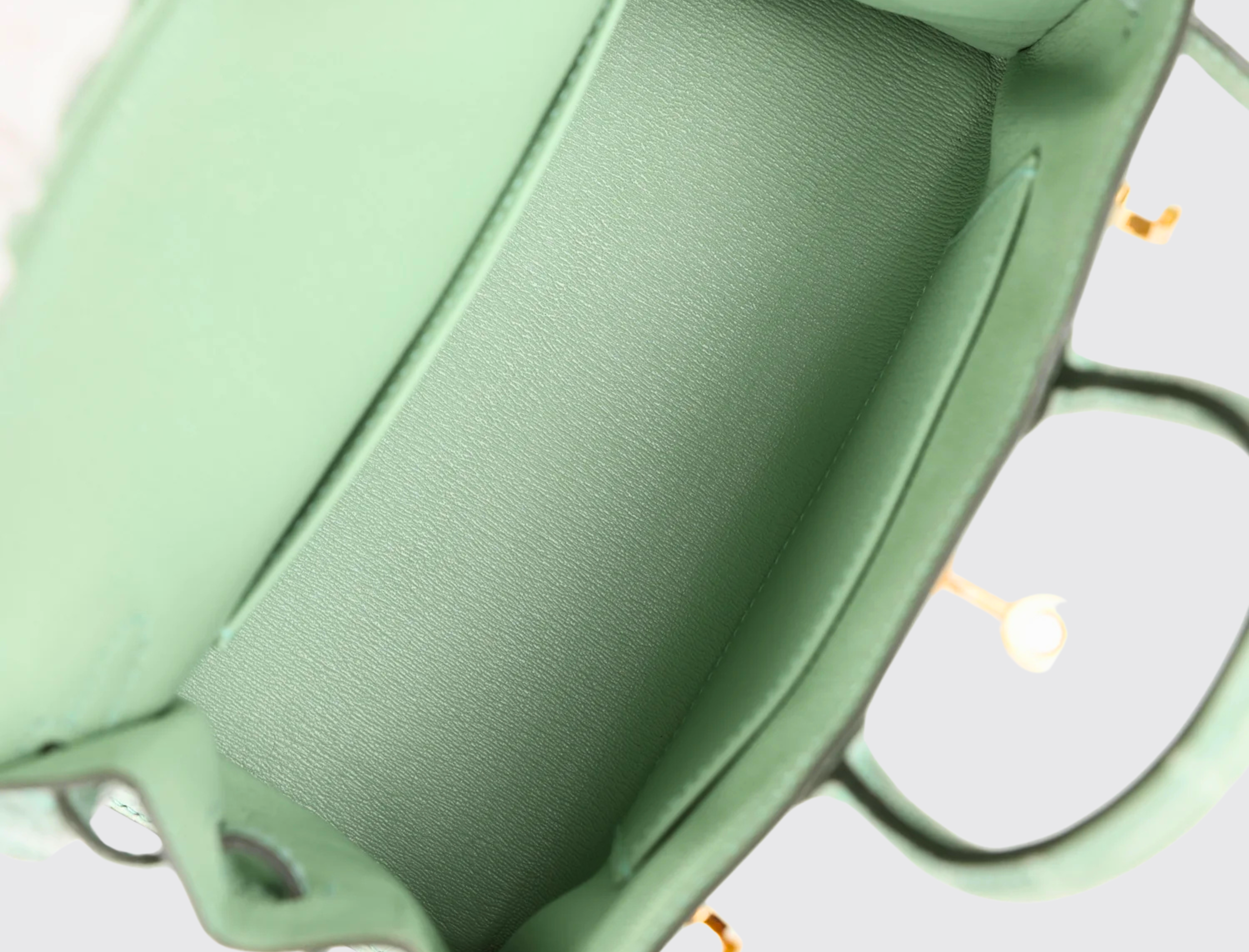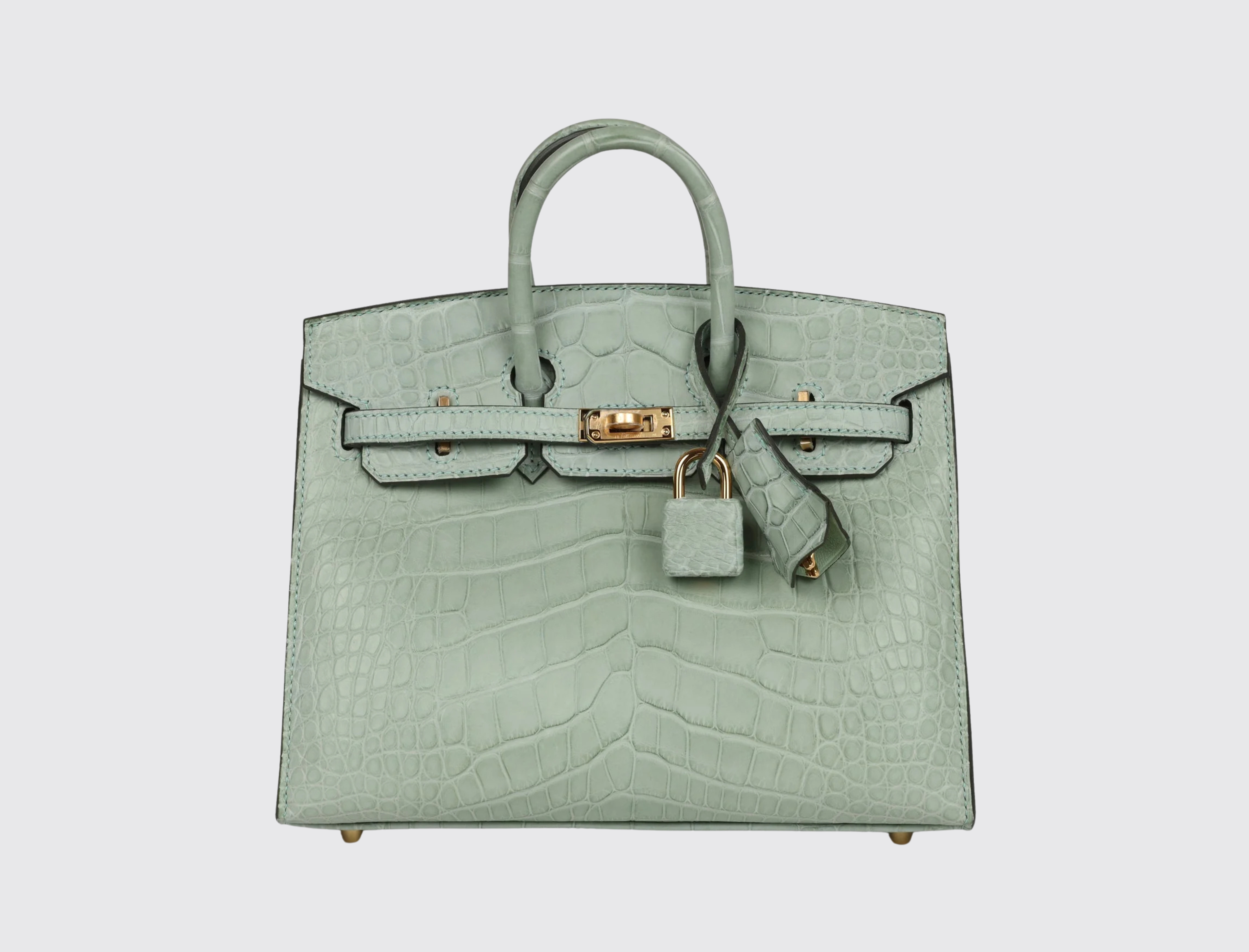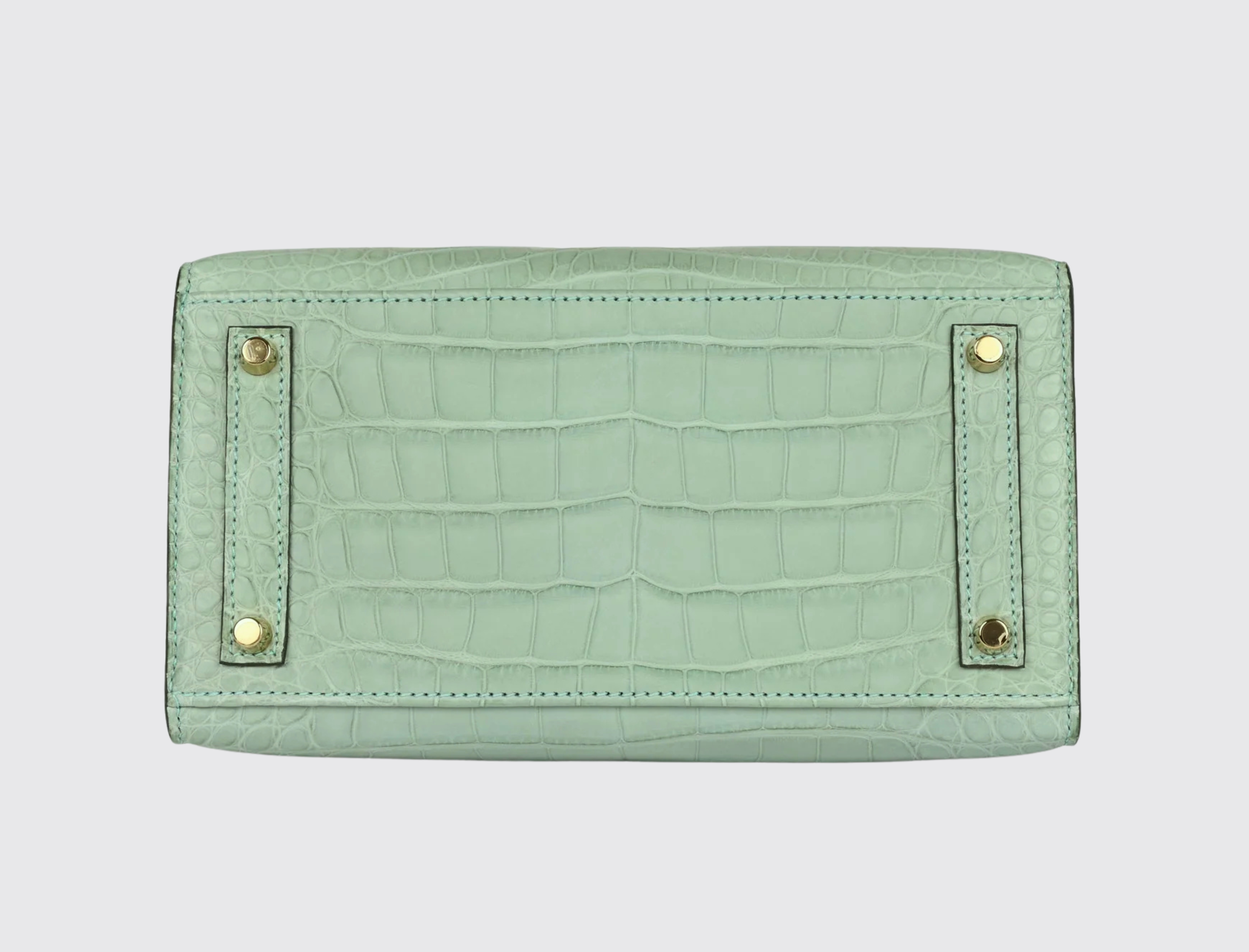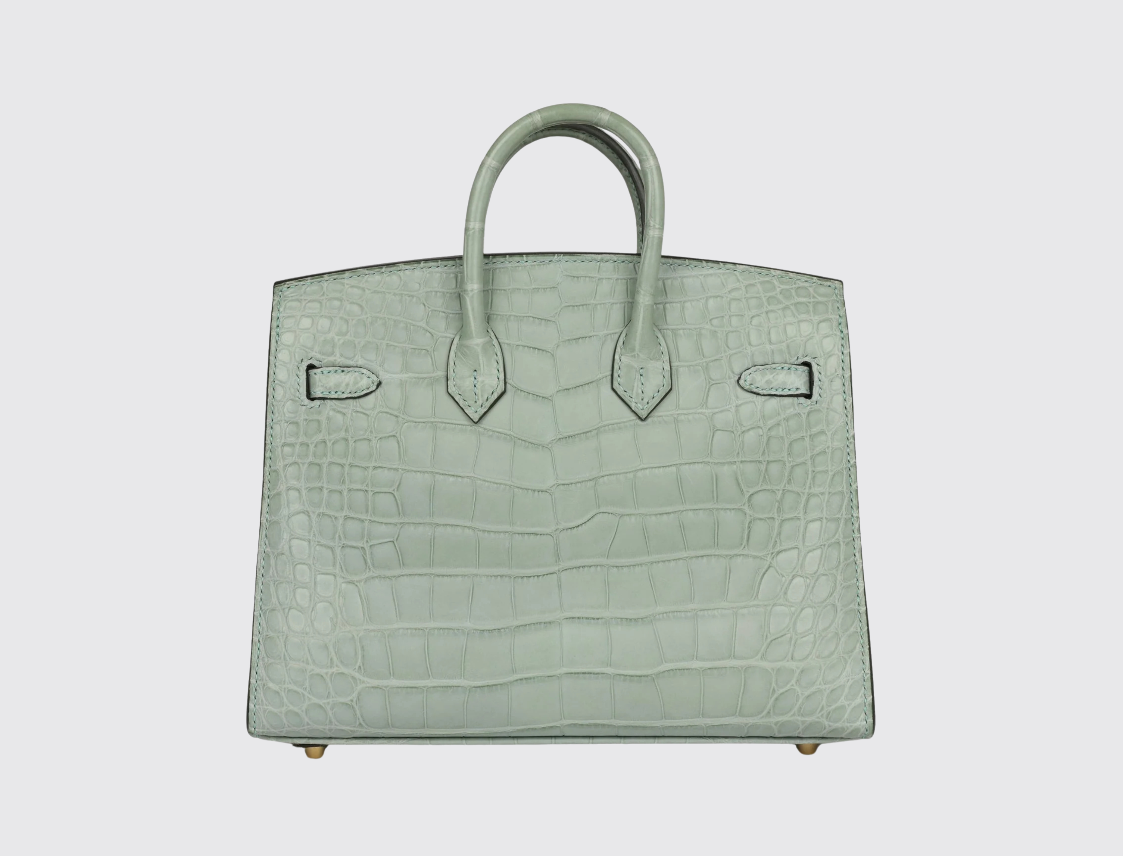 The Hermes Birkin 20 is a compact yet iconic symbol of luxury and craftsmanship. In the sophisticated vert d'eau color, this bag offers a chic and versatile look, perfect for both day and evening wear.