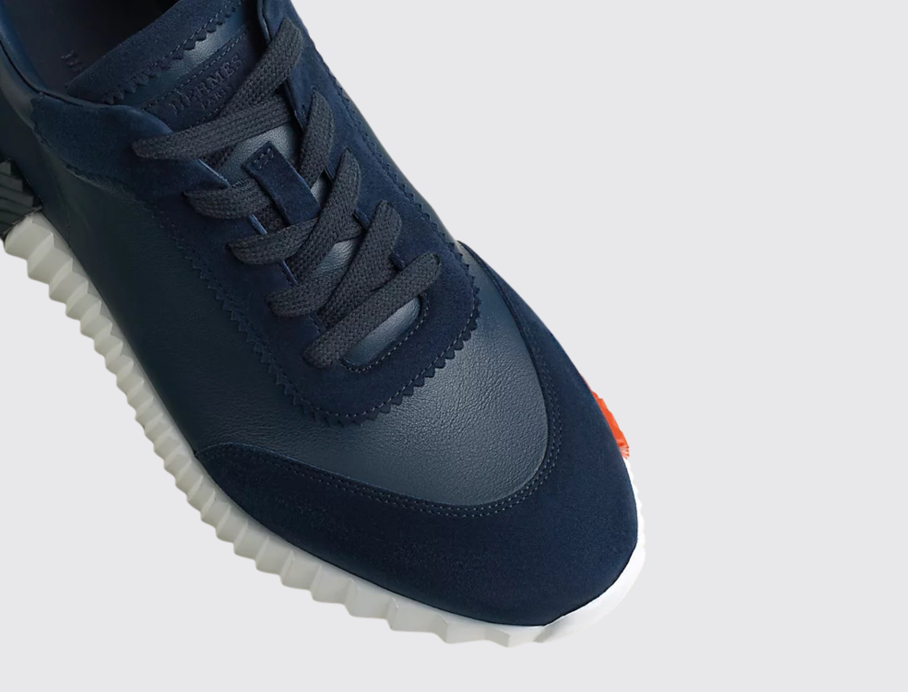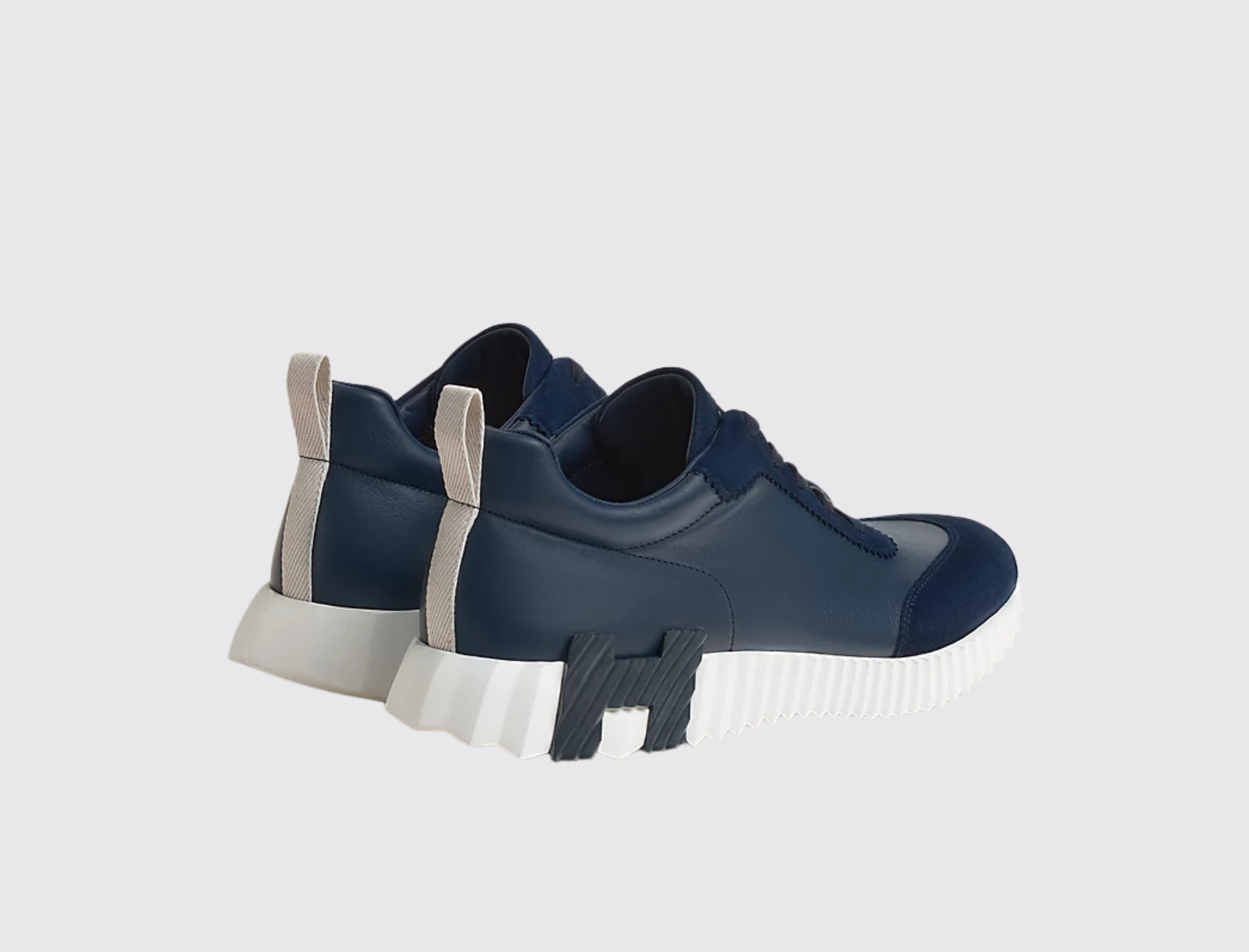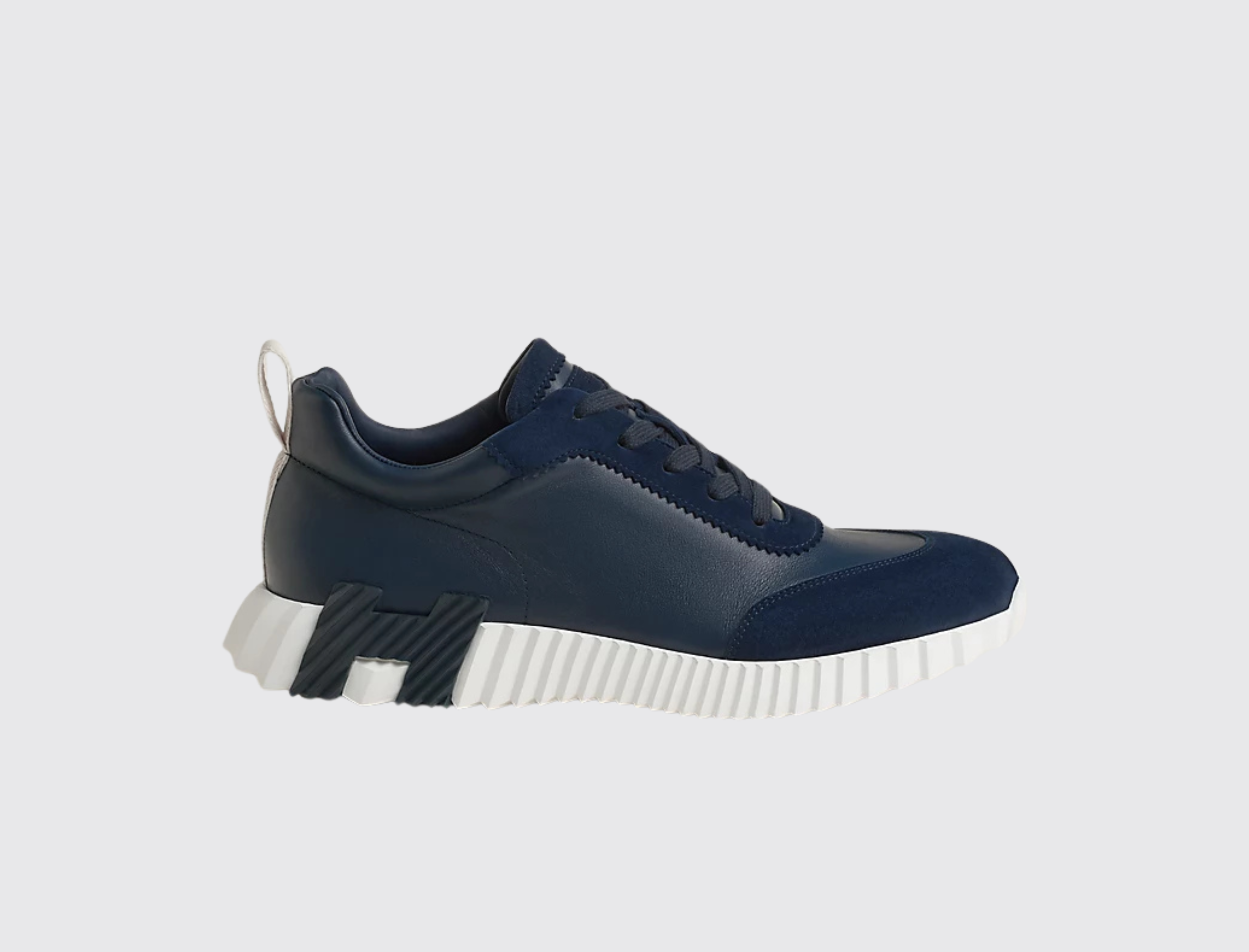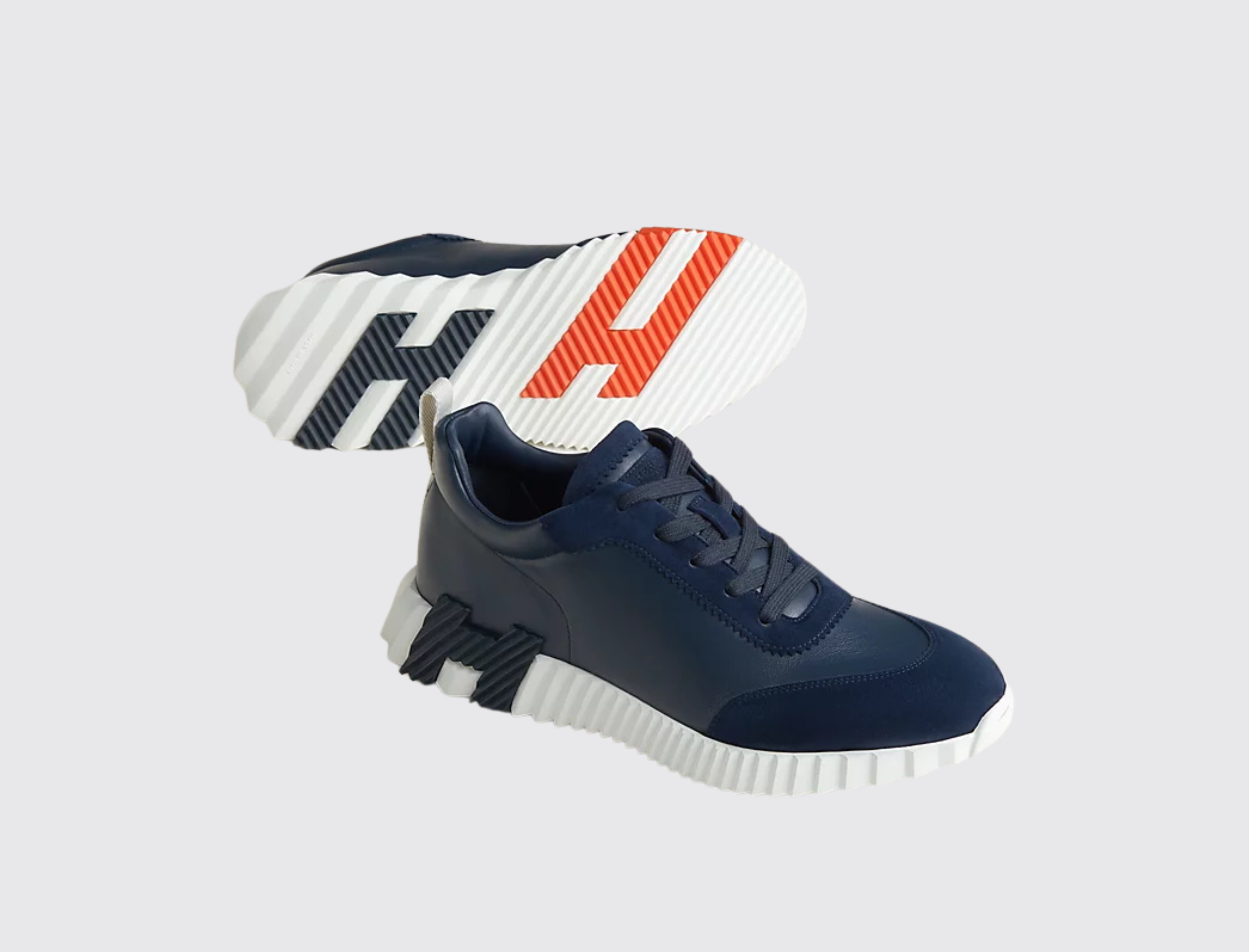 Showing a clean pair of heels, the Bouncing sneaker ventures into urban effervescence. So light that it no longer appears to touch the ground and full of untamed energy, it turns every moment into a high-speed adventure. Thinking big, it features a signature "H en biais" motif in a bold, oversized format.