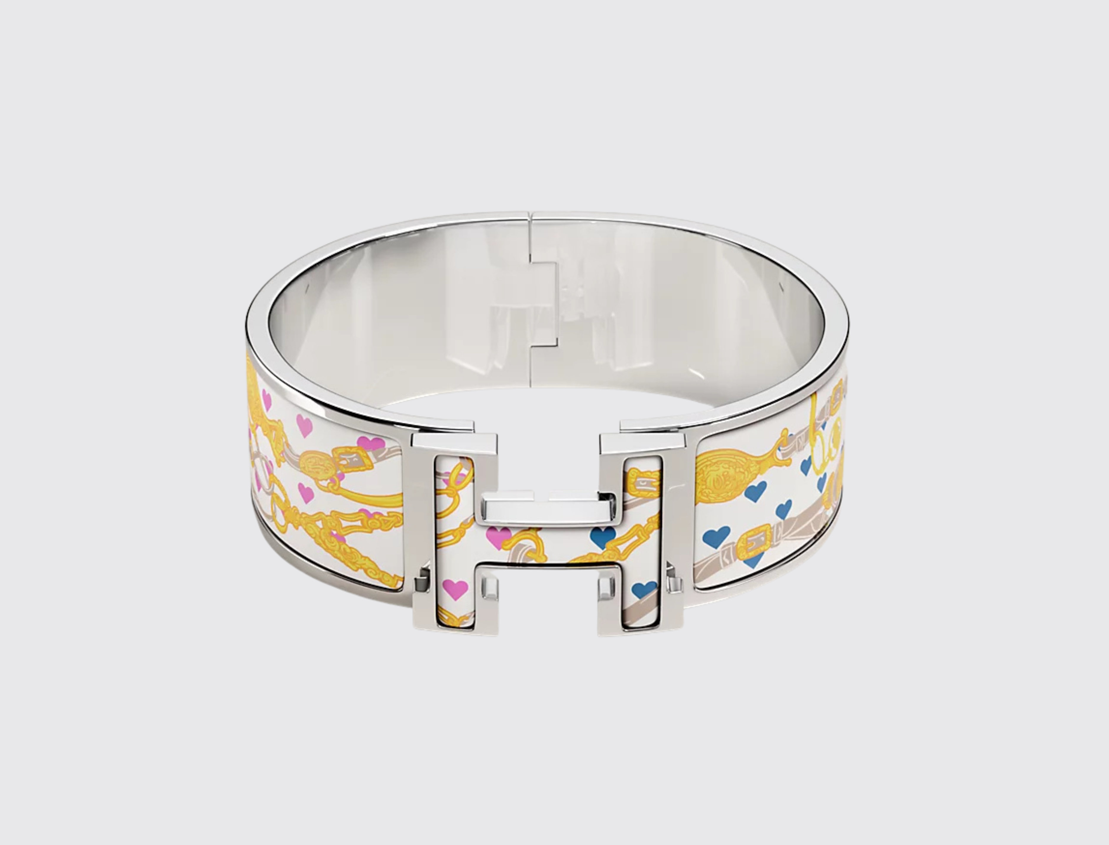 The Clic Clac H bracelet features a wide design with the classic Hermes H logo. It is adorned with unique printed enamel.