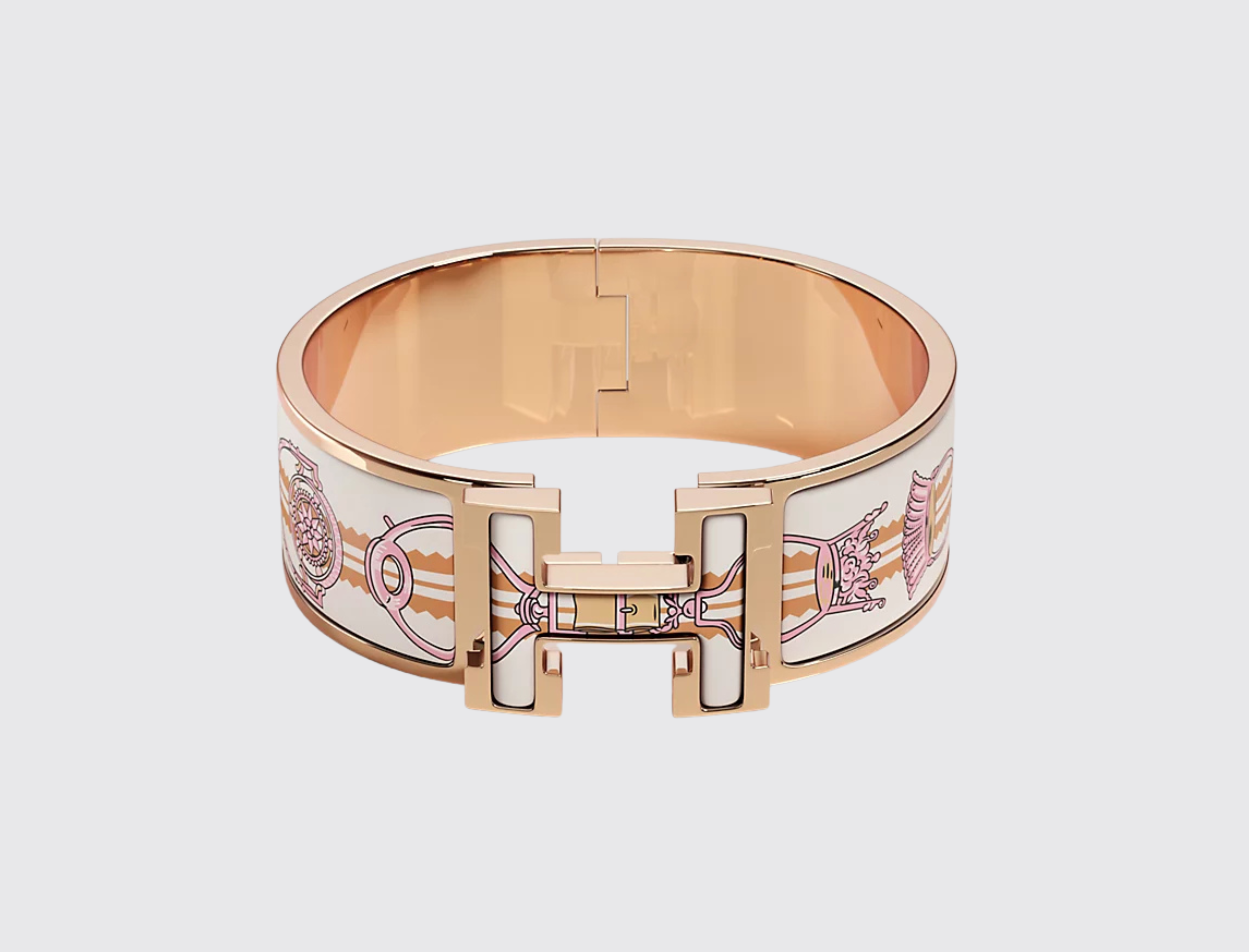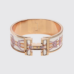 The Clic Clac H bracelet features a wide design with the classic Hermes H logo. It is adorned with unique printed enamel