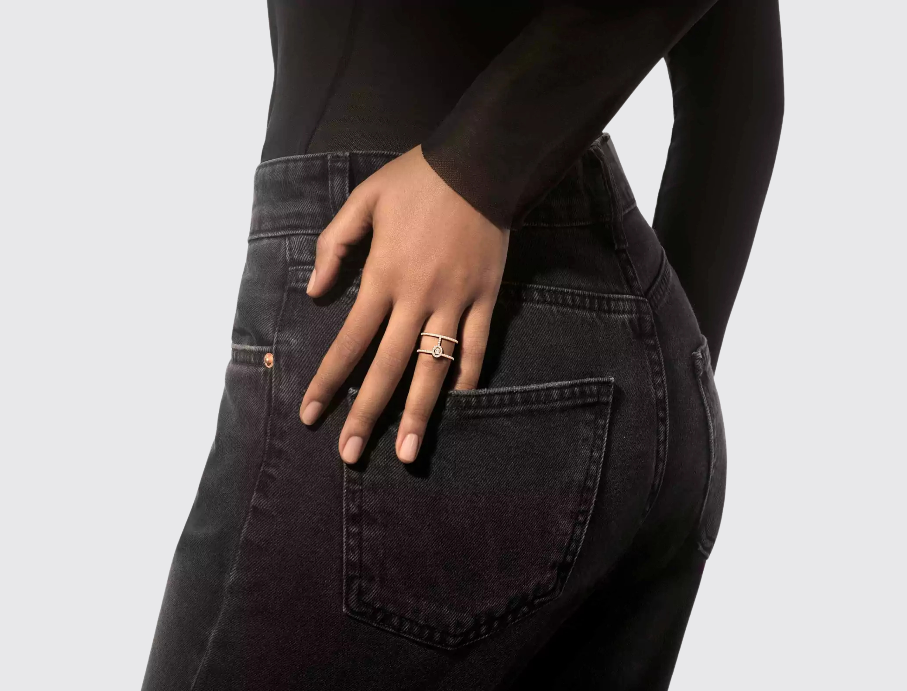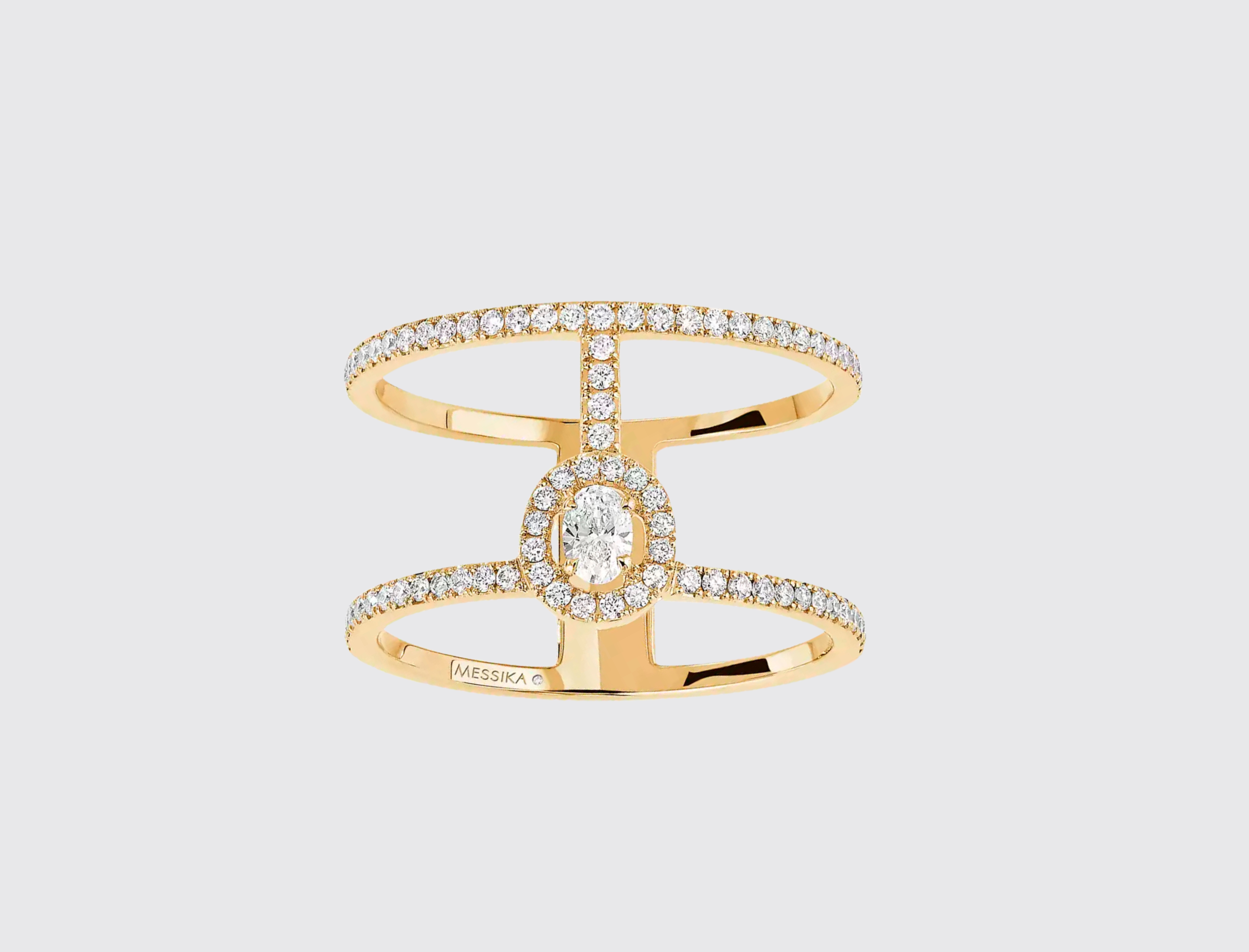 This openwork structure provides a unique setting for an oval cut central diamond and a diamond set entourage. The two rows pavé design exudes both timelessness and boldness, making it the perfect choice for contemporary, original, and light-loving women.
