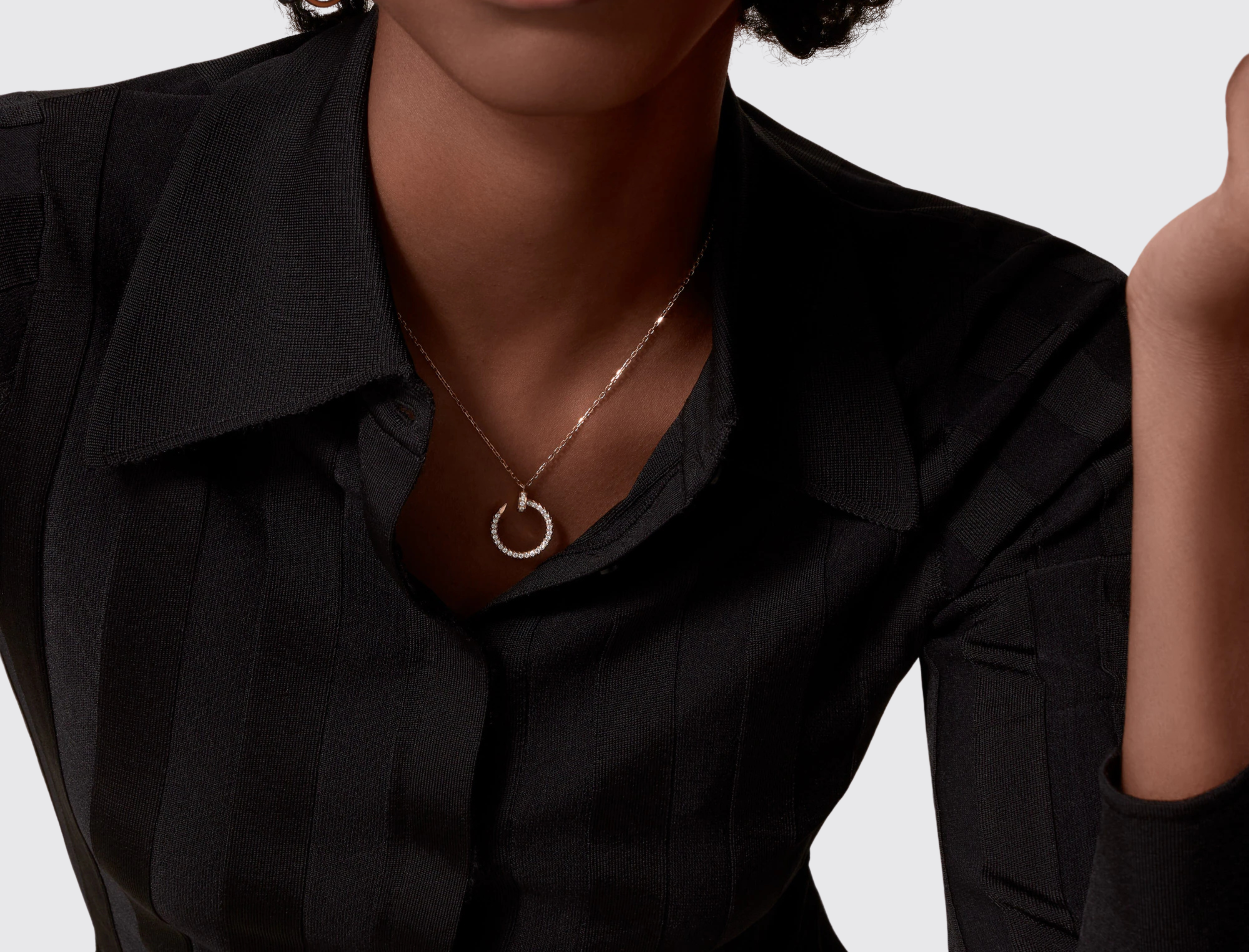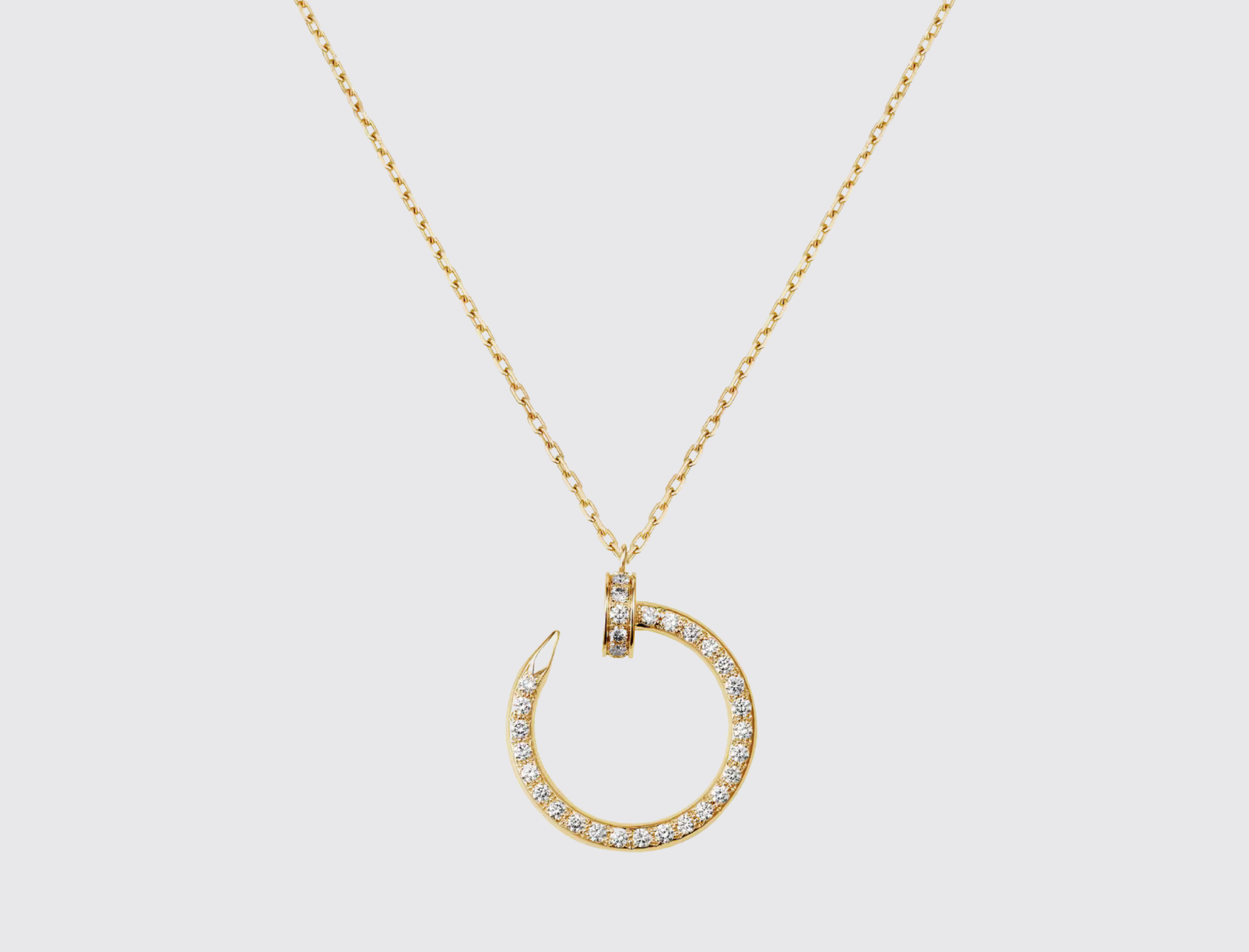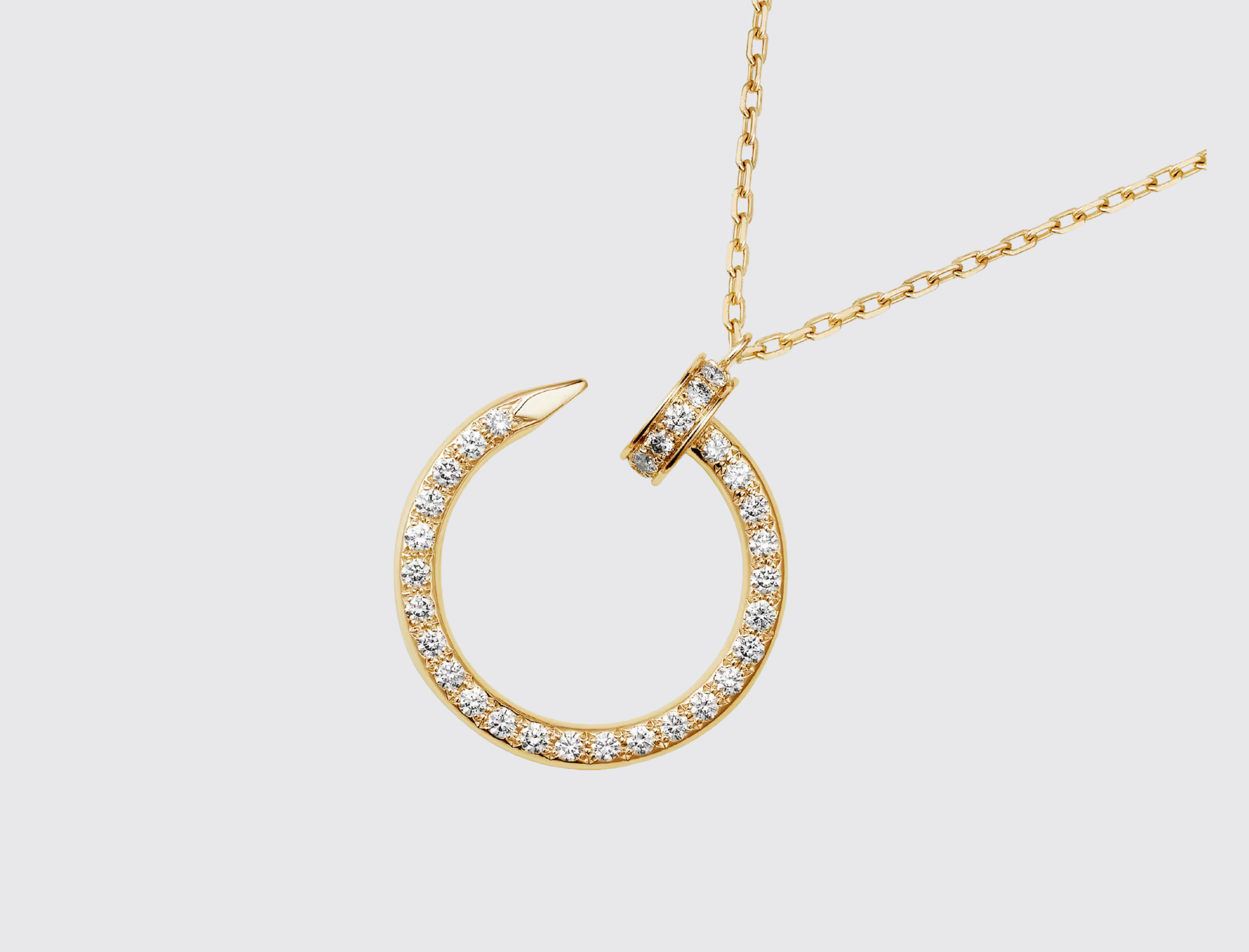 The Cartier Juste un Clou pendant with diamonds is a bold reinterpretation of a simple nail, transformed into a luxurious statement piece. Crafted in 18K gold and adorned with brilliant-cut diamonds, this pendant embodies Cartier's flair for turning everyday objects into elegant jewelry.