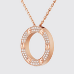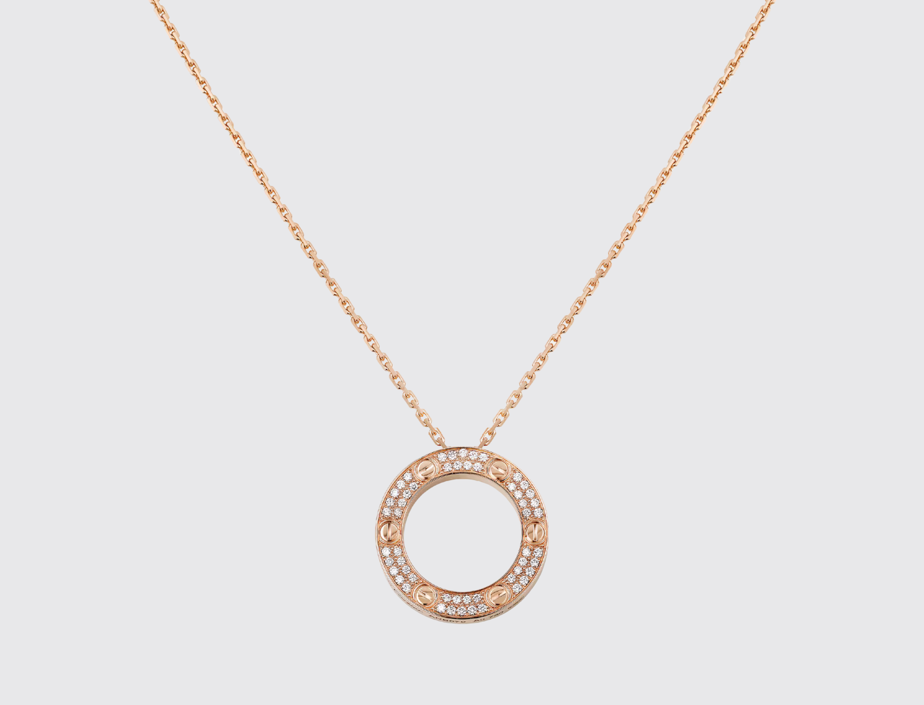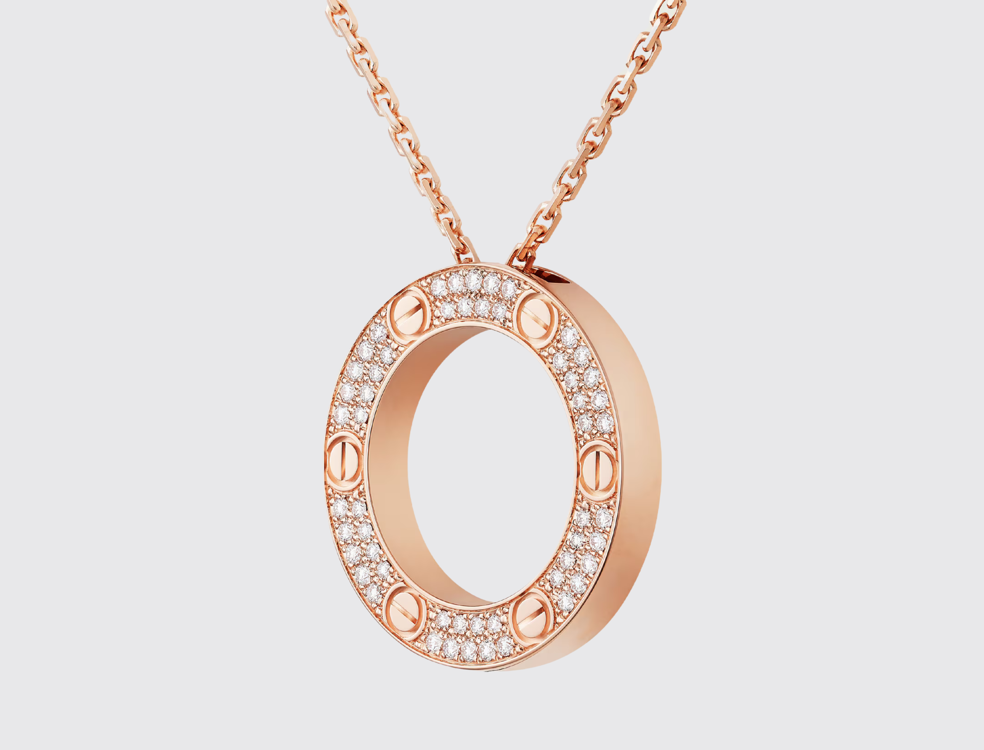 The Cartier LOVE pendant, pavé is a radiant expression of enduring affection, blending the iconic screw motif with the brilliance of diamonds. Crafted in 18K gold, these necklaces are available in various sizes and gold tones, each adorned with meticulously set brilliant-cut diamonds.