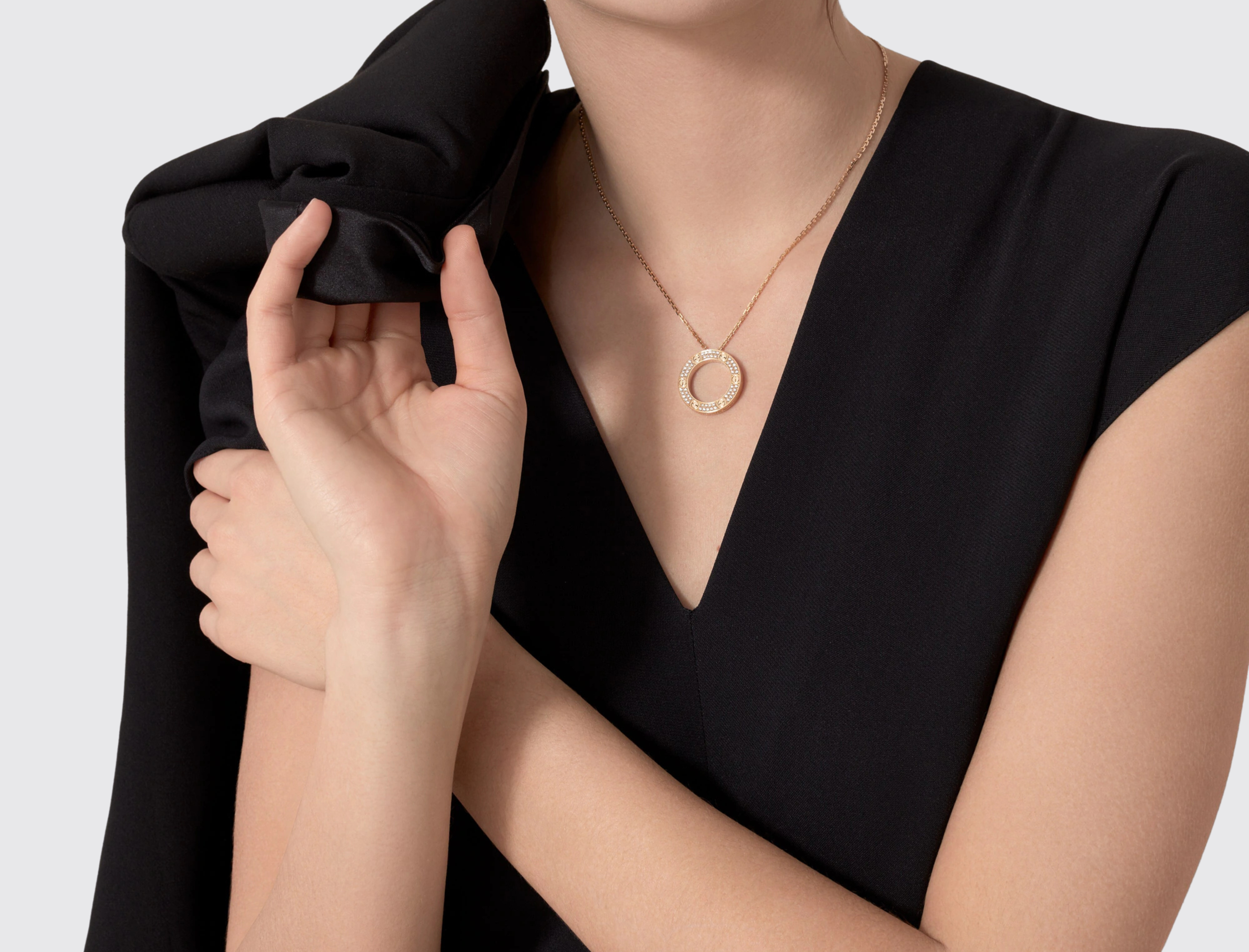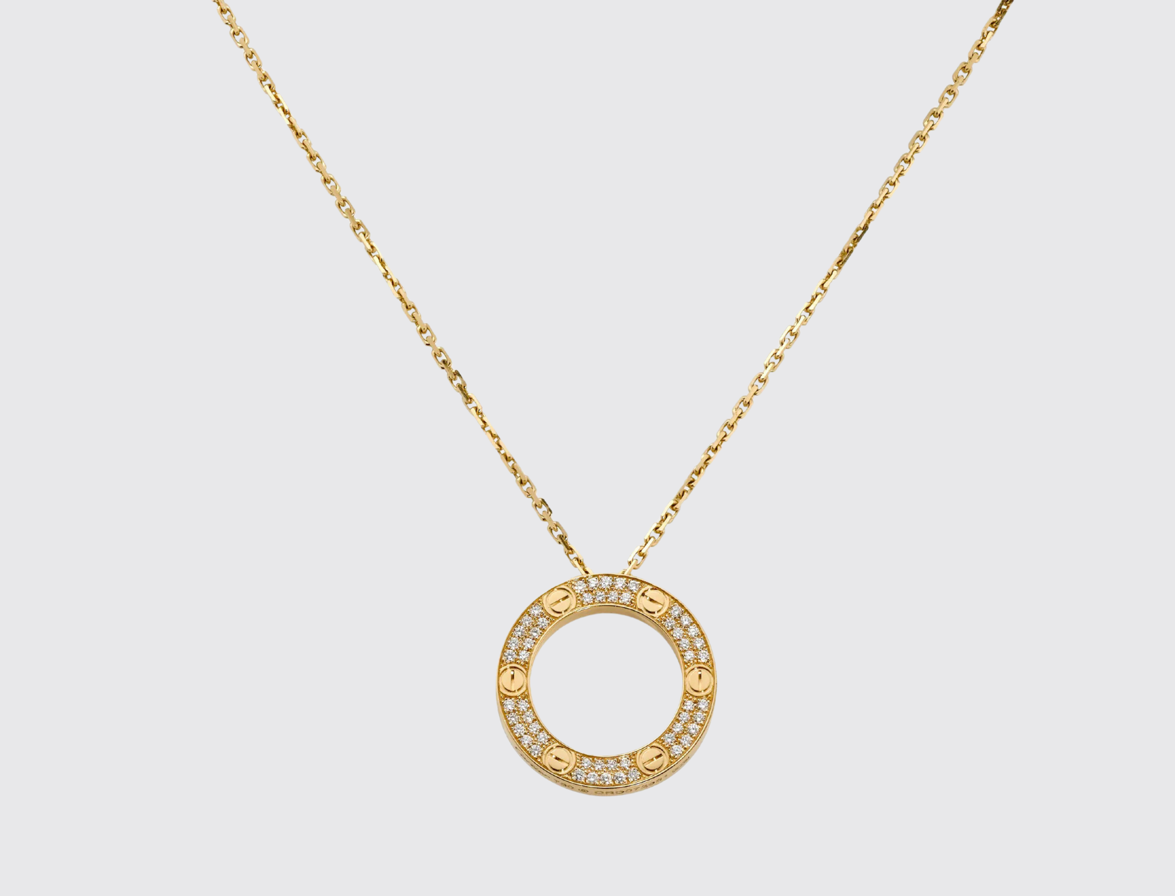 The Cartier LOVE pendant, pavé is a radiant expression of enduring affection, blending the iconic screw motif with the brilliance of diamonds. Crafted in 18K gold, these necklaces are available in various sizes and gold tones, each adorned with meticulously set brilliant-cut diamonds.