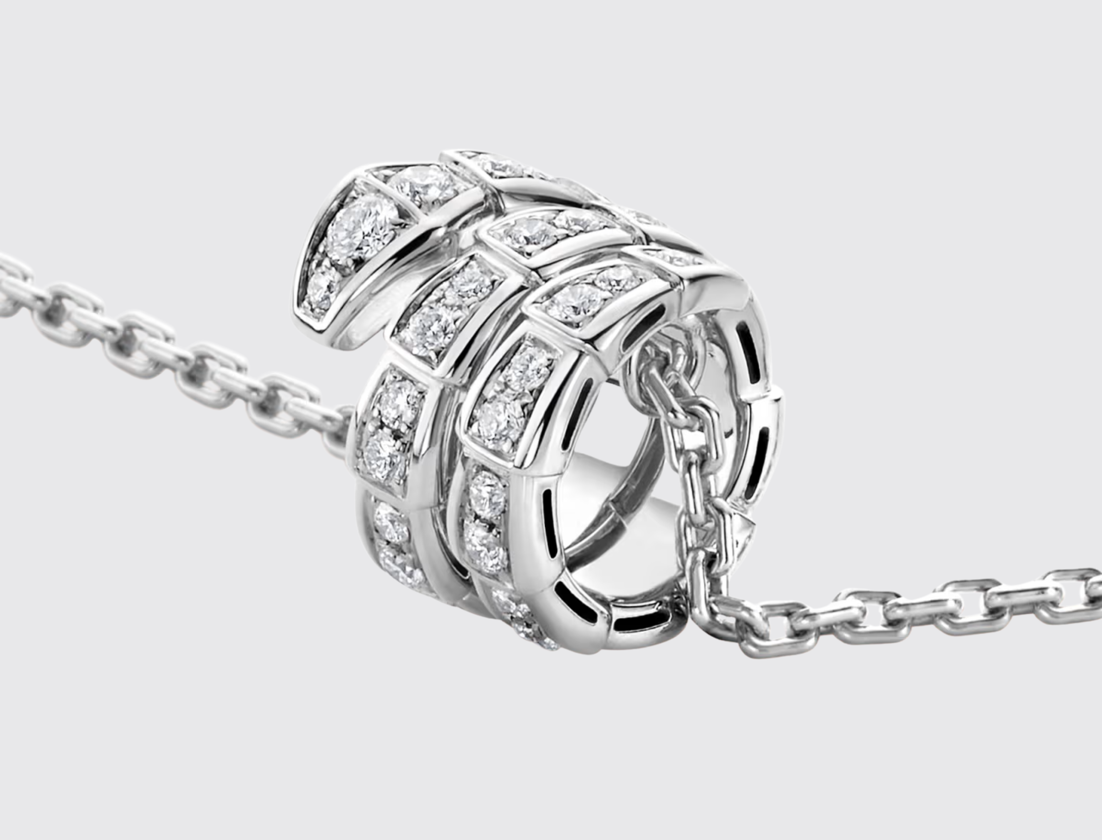 The Serpenti Seduttori Necklace by Bvlgari is a pendant necklace set with full pavé diamonds. Its versatile design offers endless styling options, inspiring strength and confidence through change.