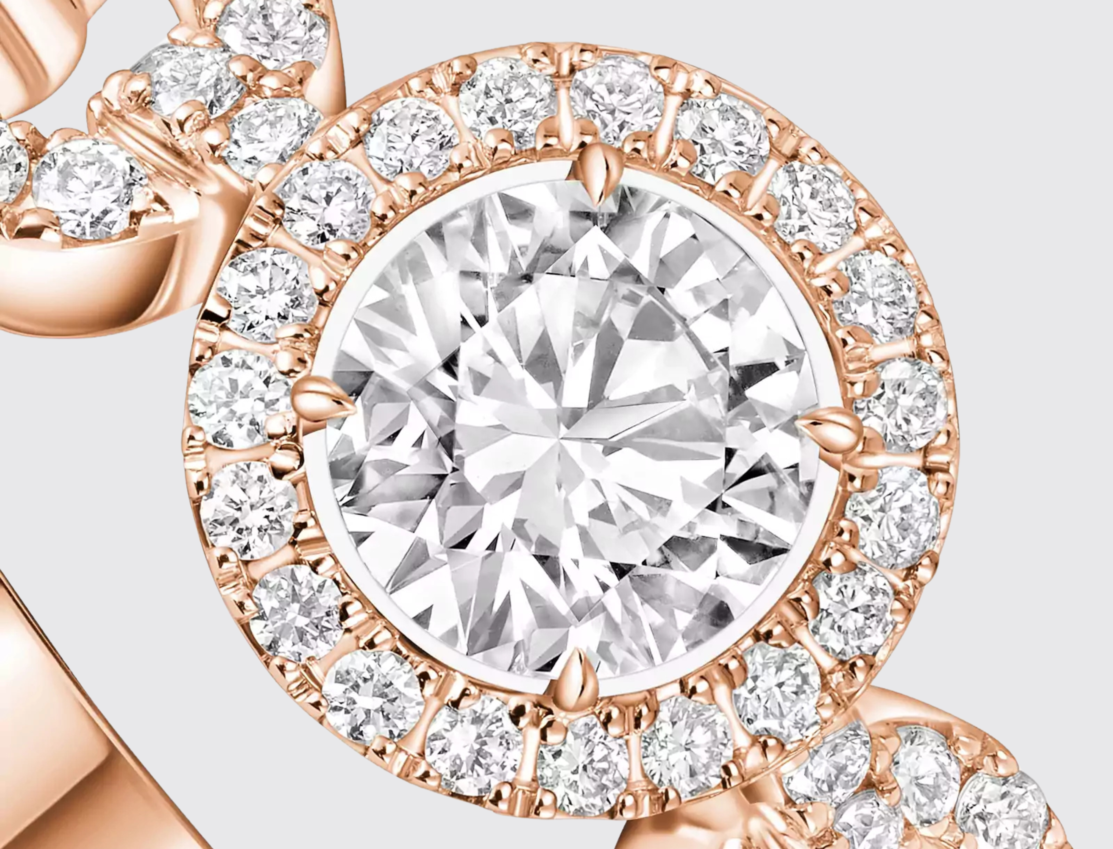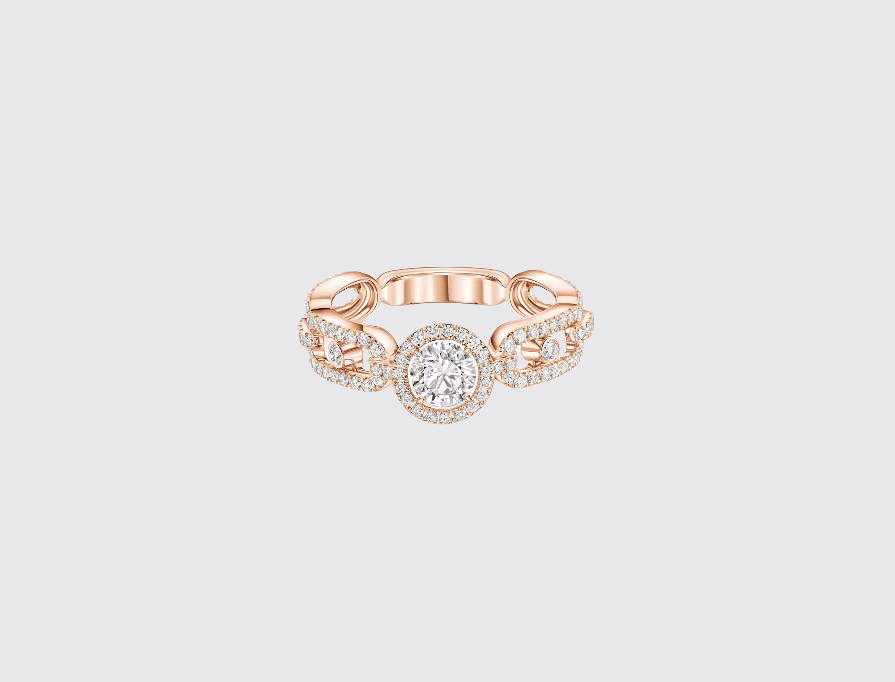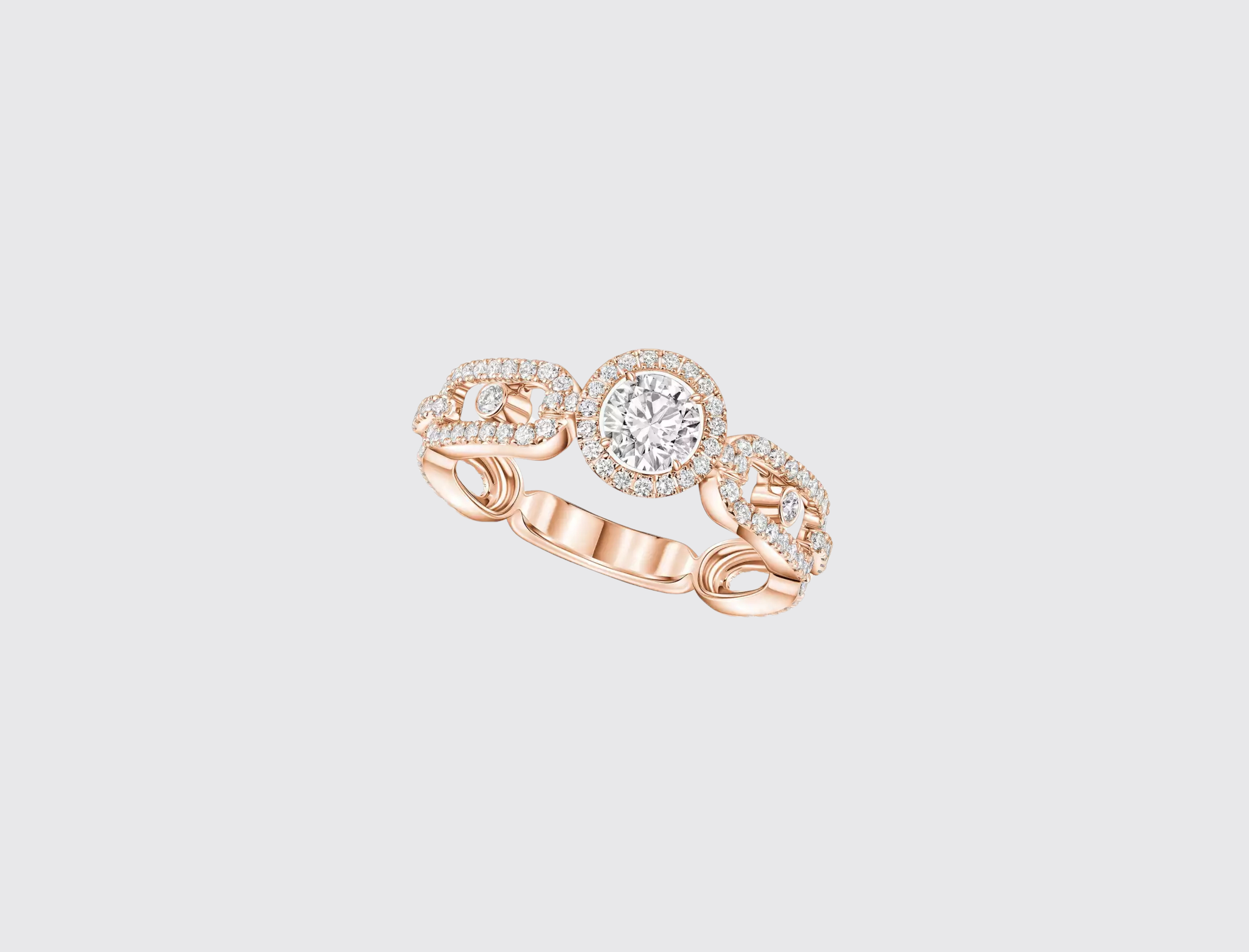 The Messika Maison's signature engagement ring. The moving diamonds on the ring band lend this pink gold jewel an original, and decidedly modern design, for those looking for a unique way to symbolise their engagement. A daring pink gold diamond ring enhanced by a precious 0.30 carat brilliant-cut diamond, surrounded by a halo of diamonds for incomparable sparkle.