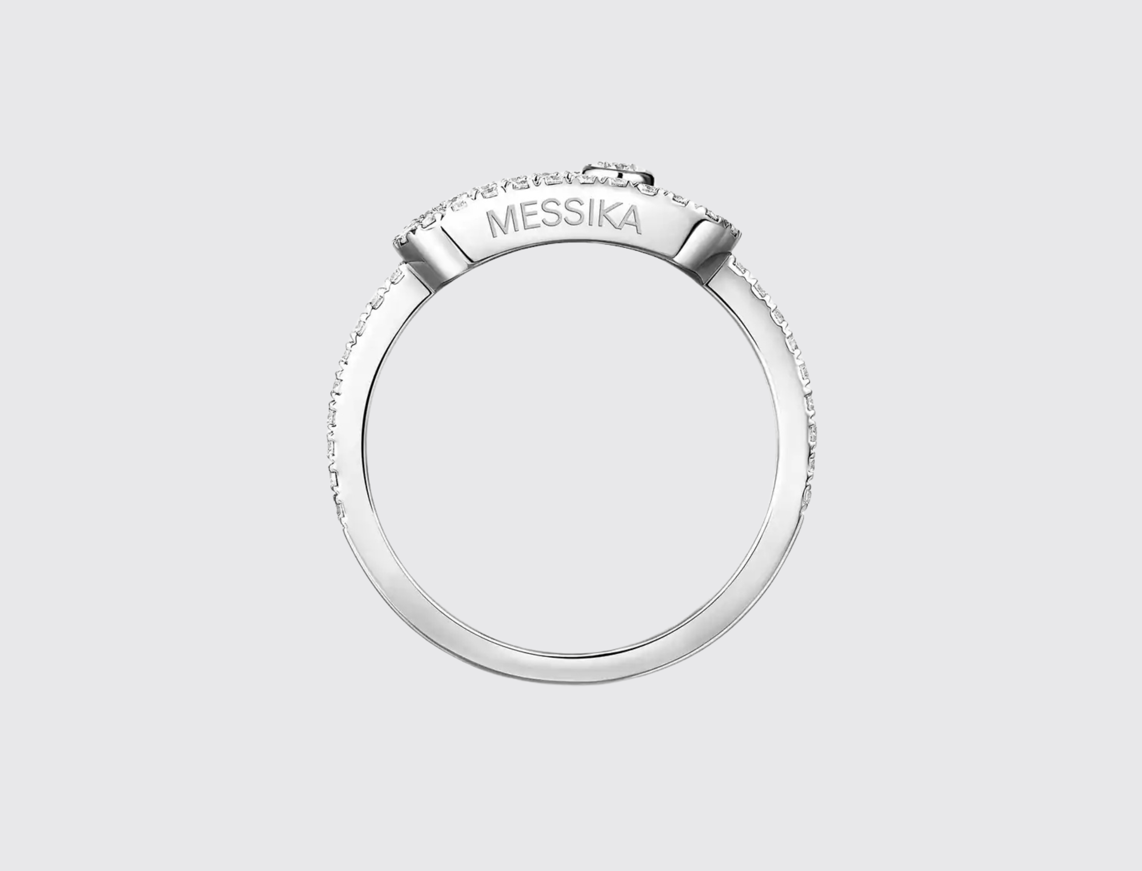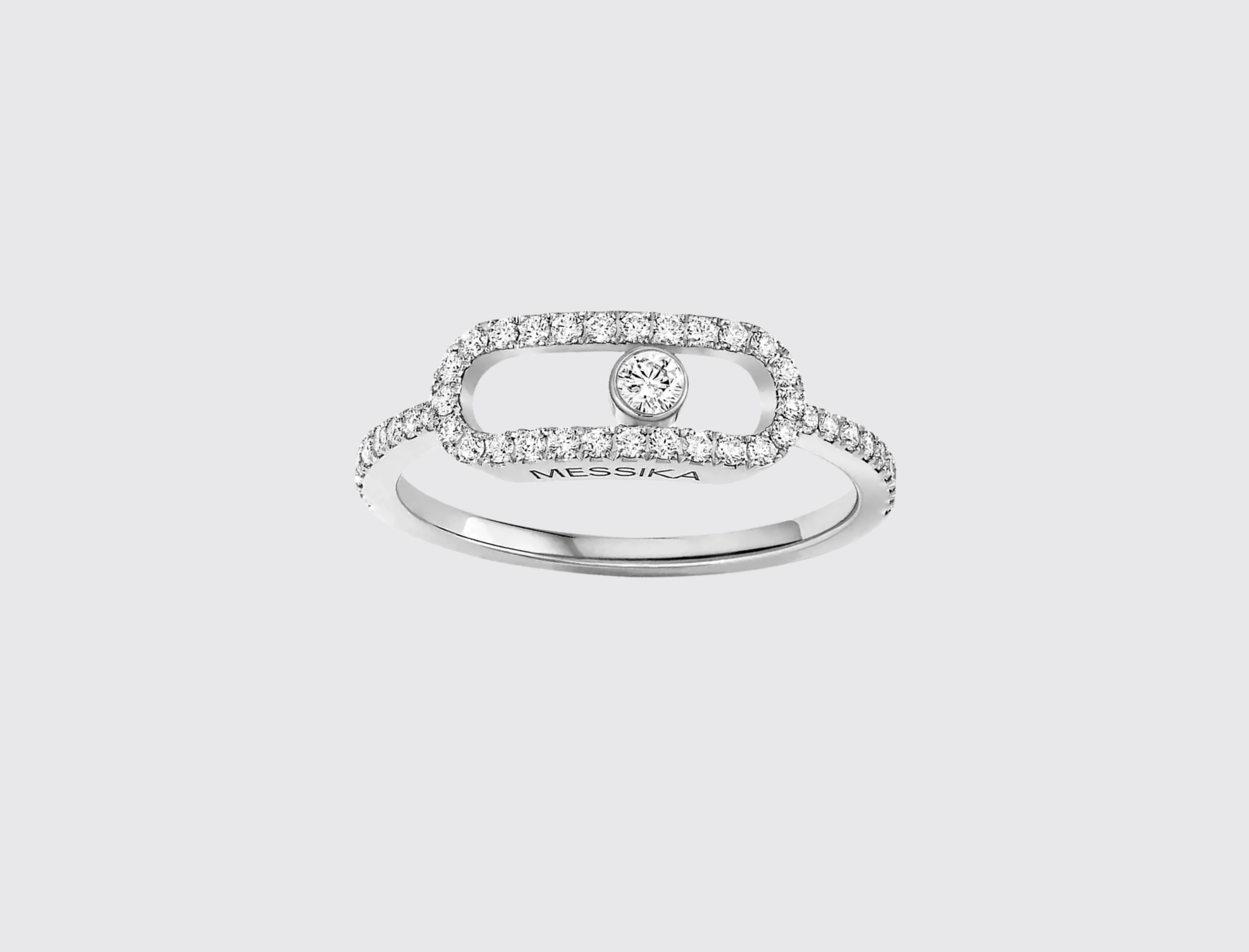 The new Move Uno large model diamond ring gives new dimension to the iconic Messika design. Discover its delicate and sensual openwork, its central moving diamond symbolising freedom and its oversized proportions that cover the width of the finger with bold presence. This white gold model works perfectly with all skin tones, from the lightest to the darkest.