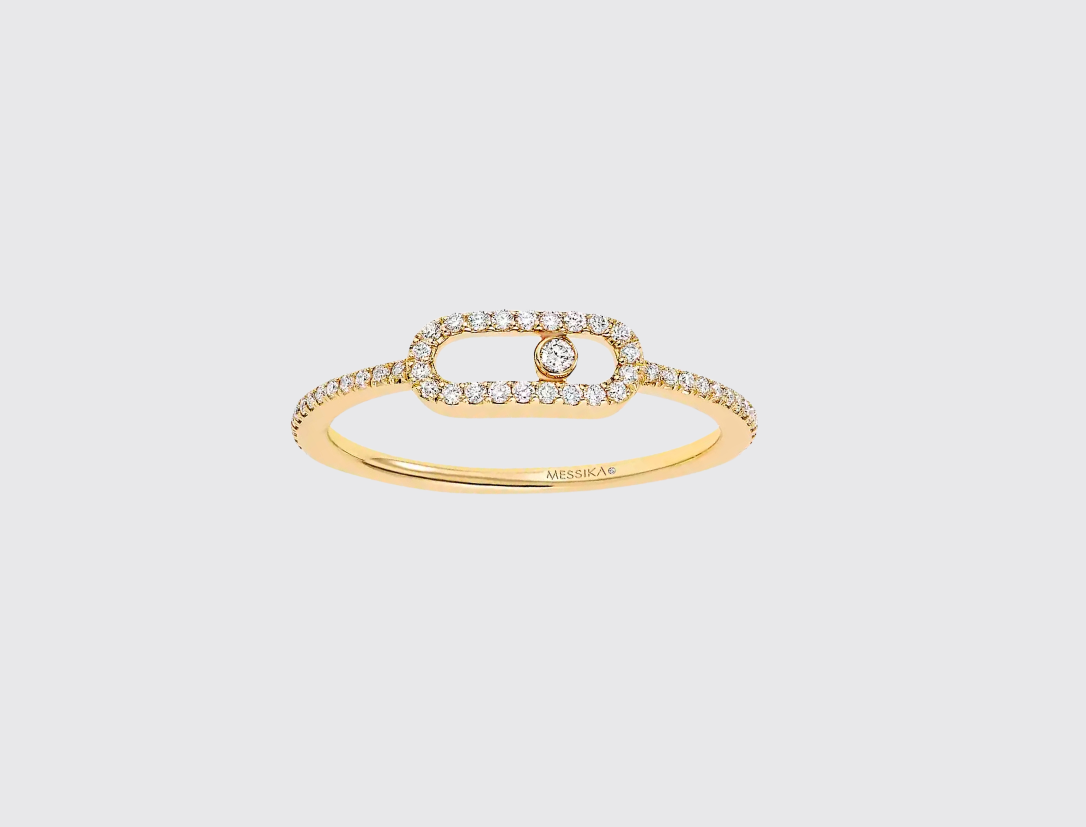This Move Uno yellow gold pavé diamond ring, icon of Messika House, is ideal to wear everyday or for a gift to a beloved one. This yellow gold pavé diamond ring can be worn alone or stacked with another Move Uno ring in pink gold or white gold.