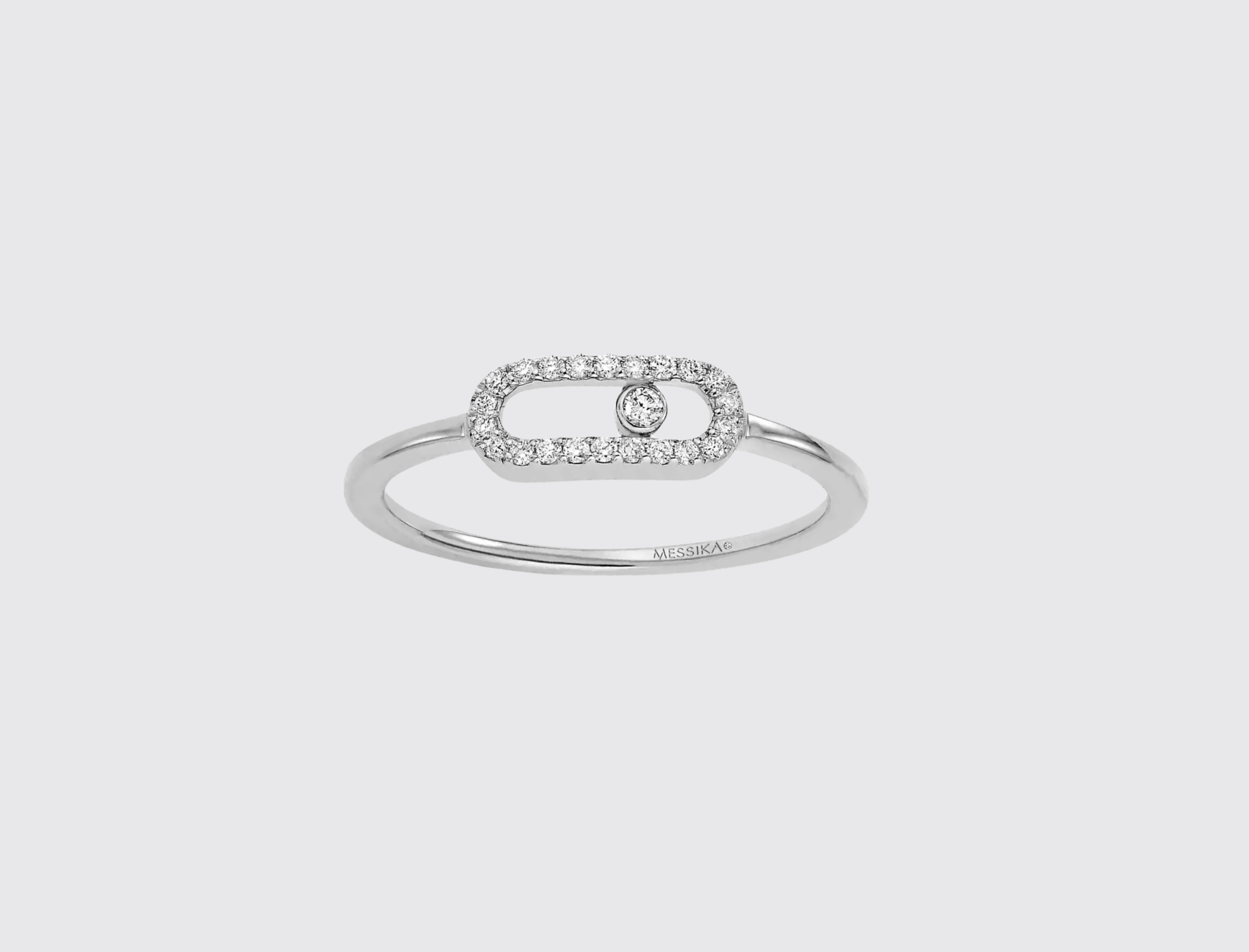 This 18 carat white gold pavé diamond band for women, fully handcrafted and set with one brilliant cut diamond, is part of Move jewelry collection, the signature of Messika House. A fine minimalist style jewel, the ideal companion for everyday. The white gold diamond ring Move Uno can be worn alone or stacked with another Move Uno ring. Choose a modern and audacious white gold pavé diamond ring and discover online all our diamond rings for women.