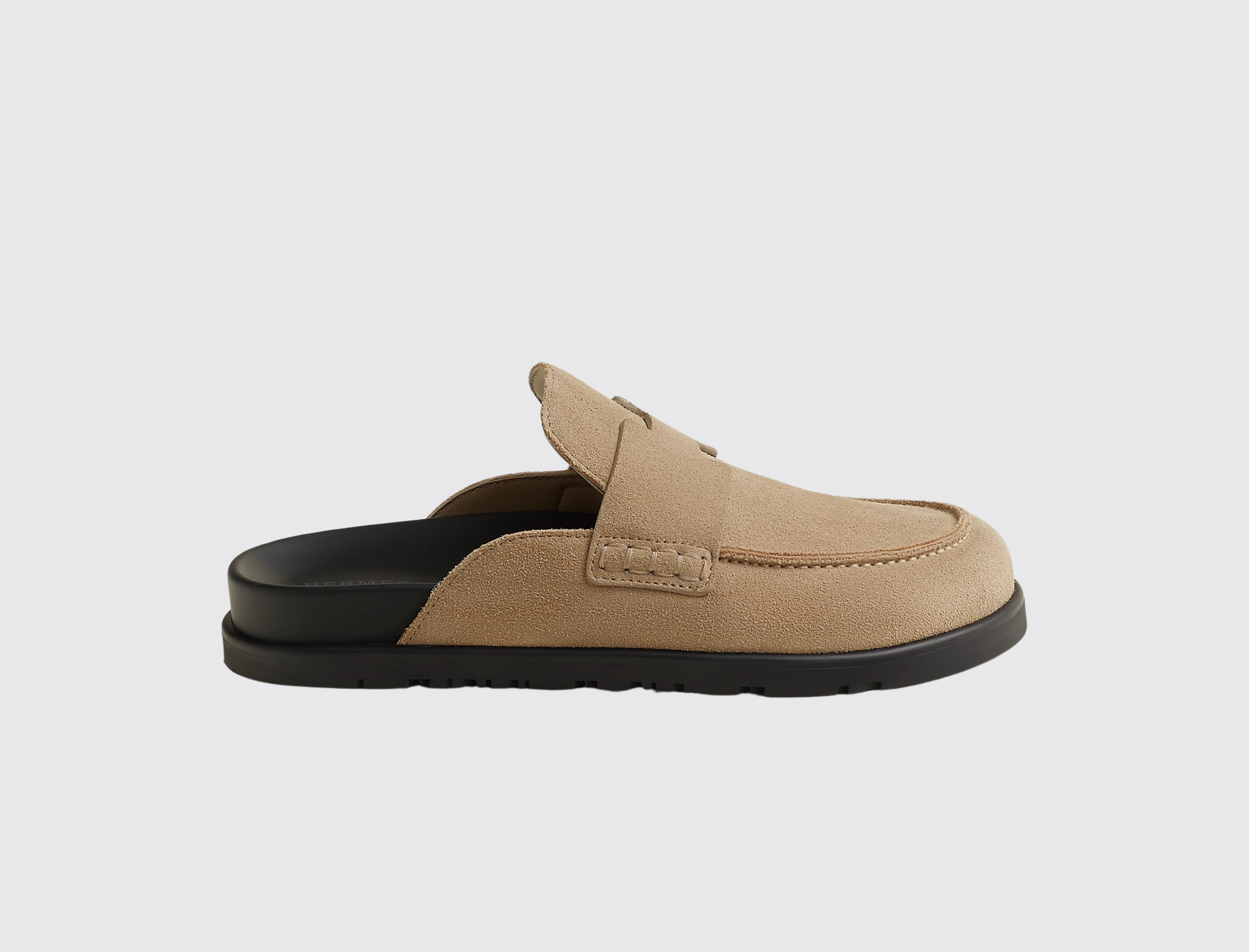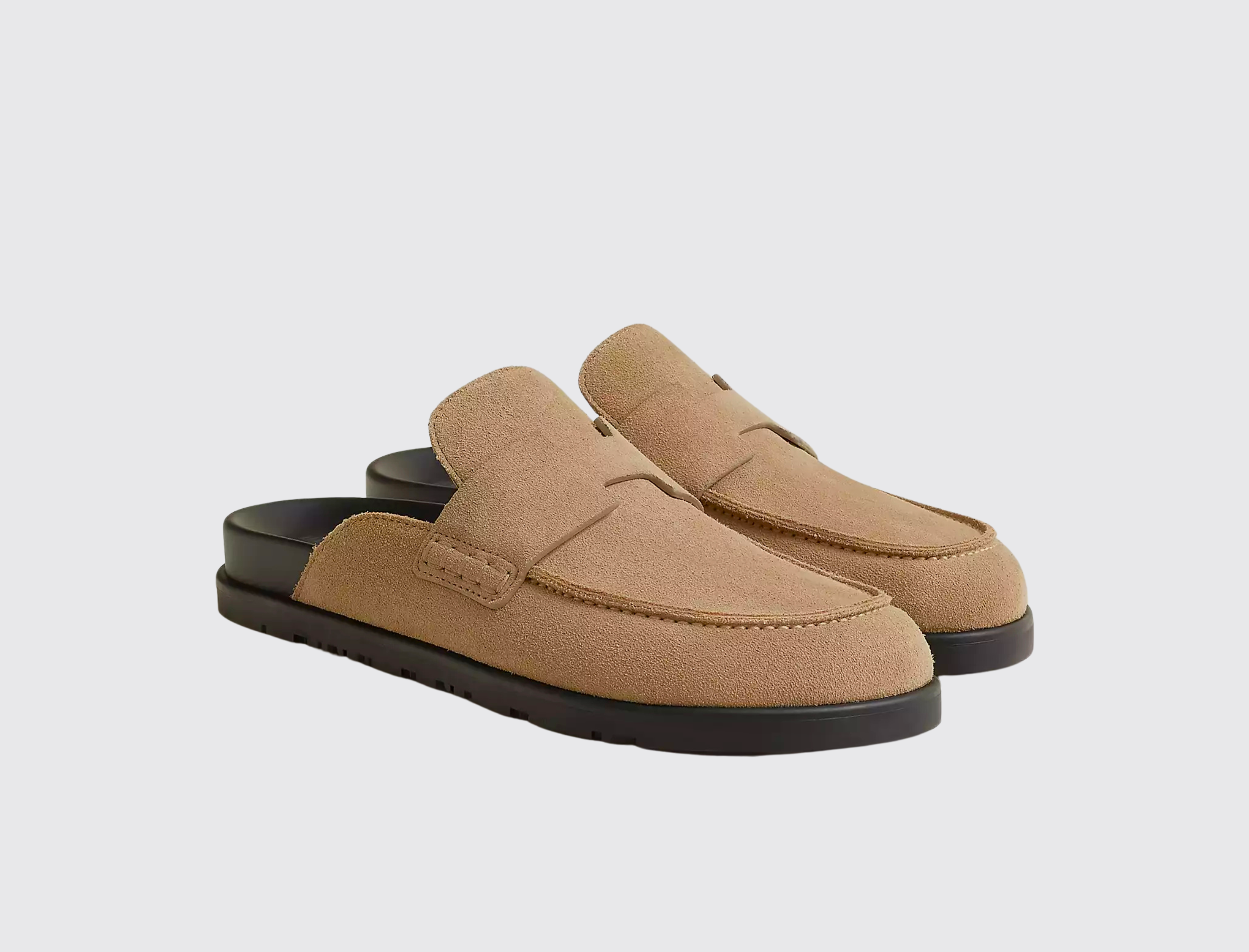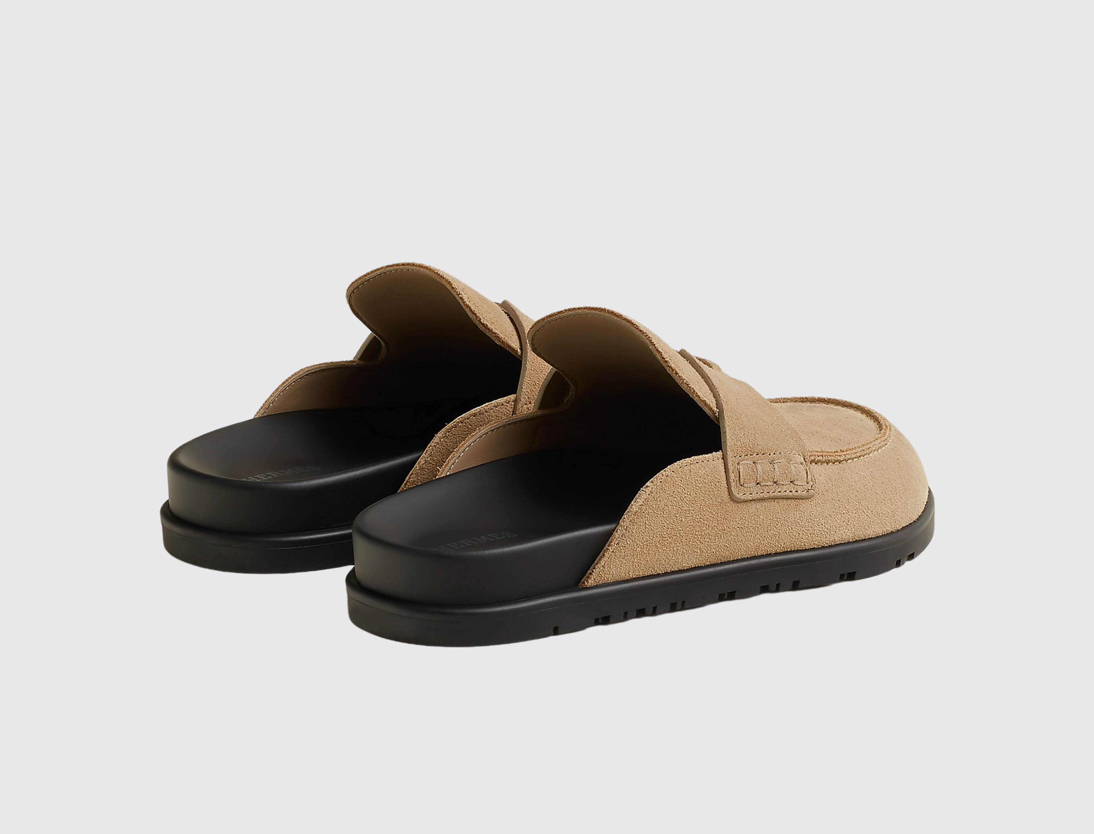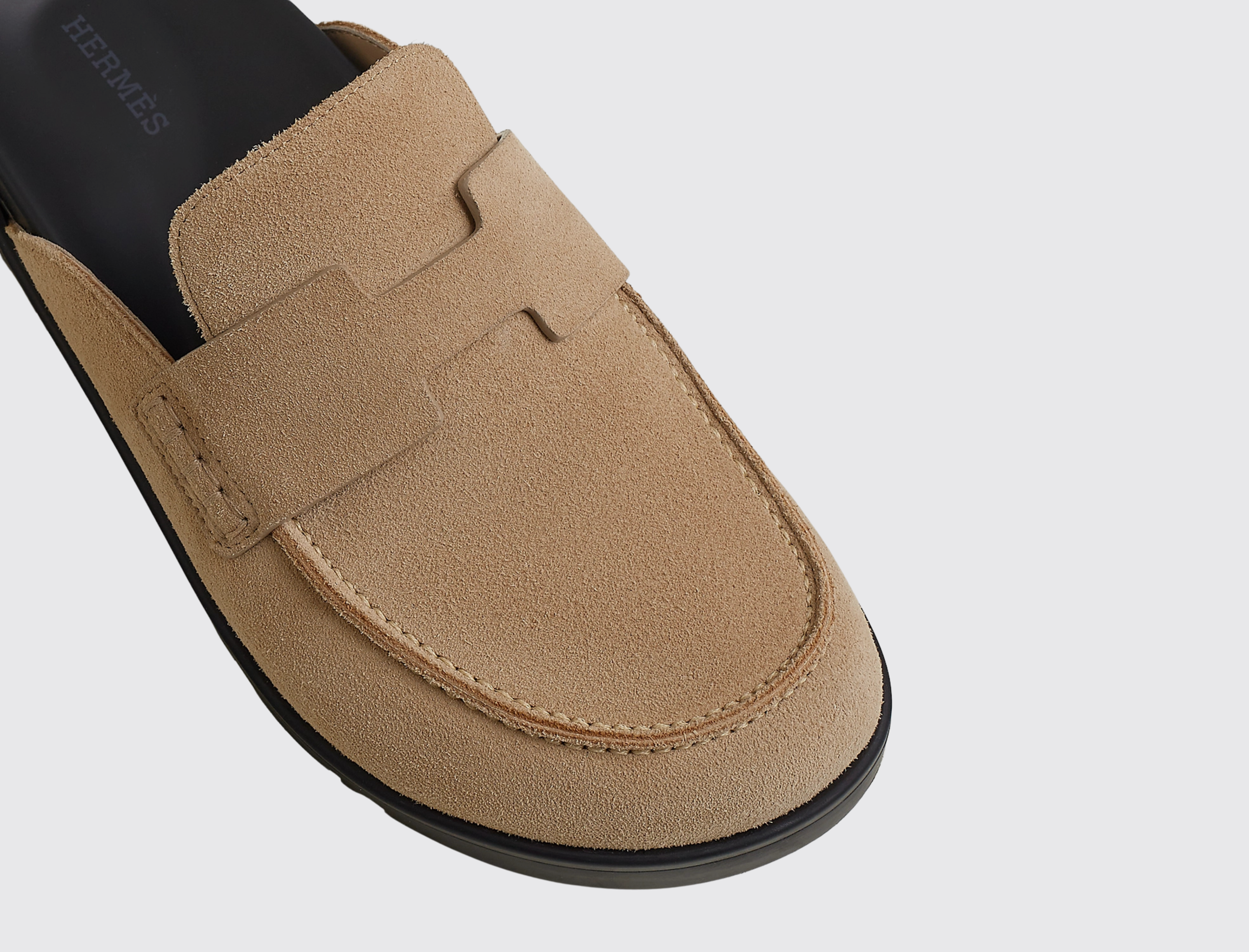 Crafted from soft suede calfskin leather, the Go Mules feature a classic loafer design with a rounded toe. The mules are adorned with a signature "H" cut-out detail on the front, adding a touch of elegance.