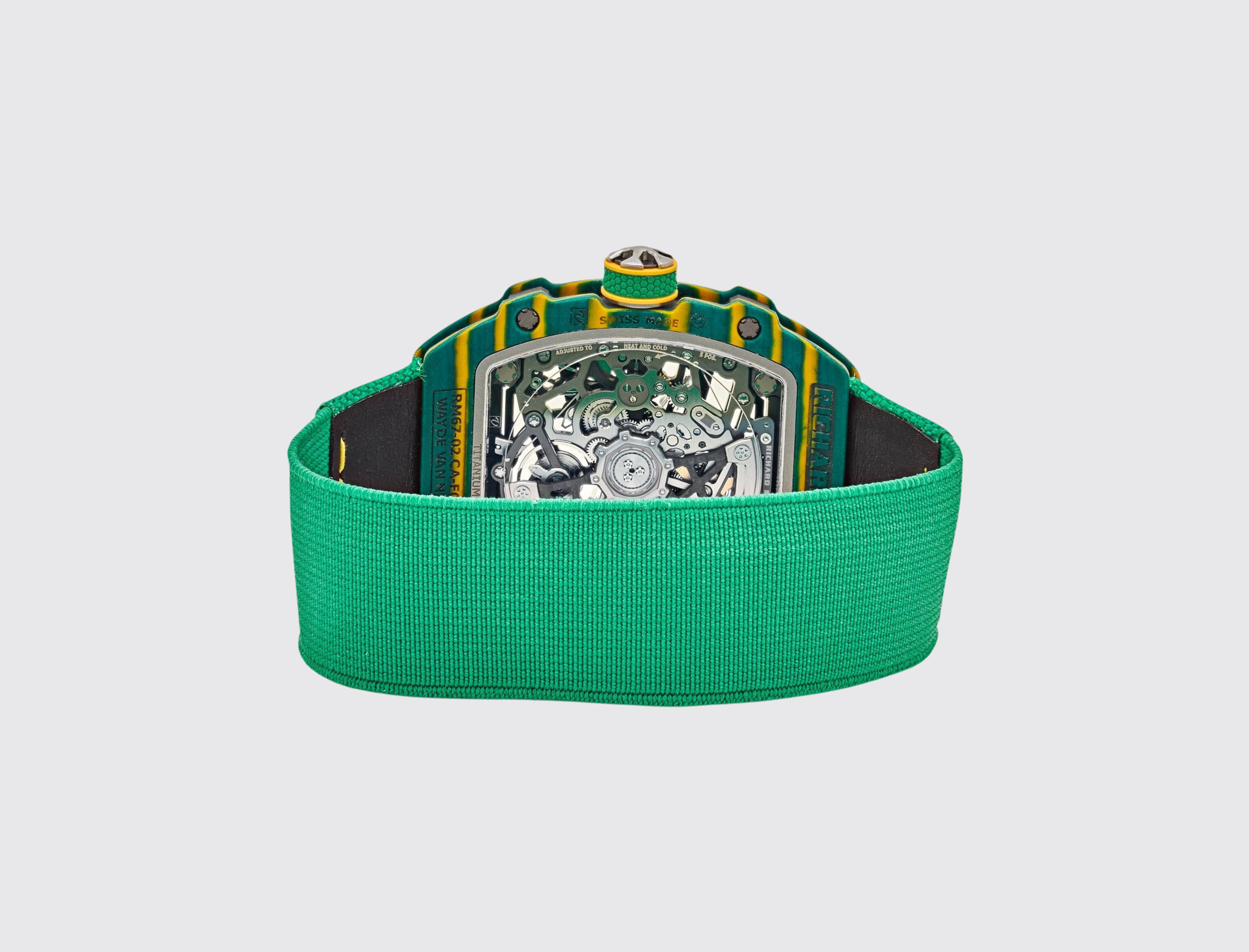 The RM 67-02 weighs a mere of 32 grams, thanks to the combination of TPT® composite materials, grade 5 titanium and the elastic wristband, the lightest strap ever created by the brand.