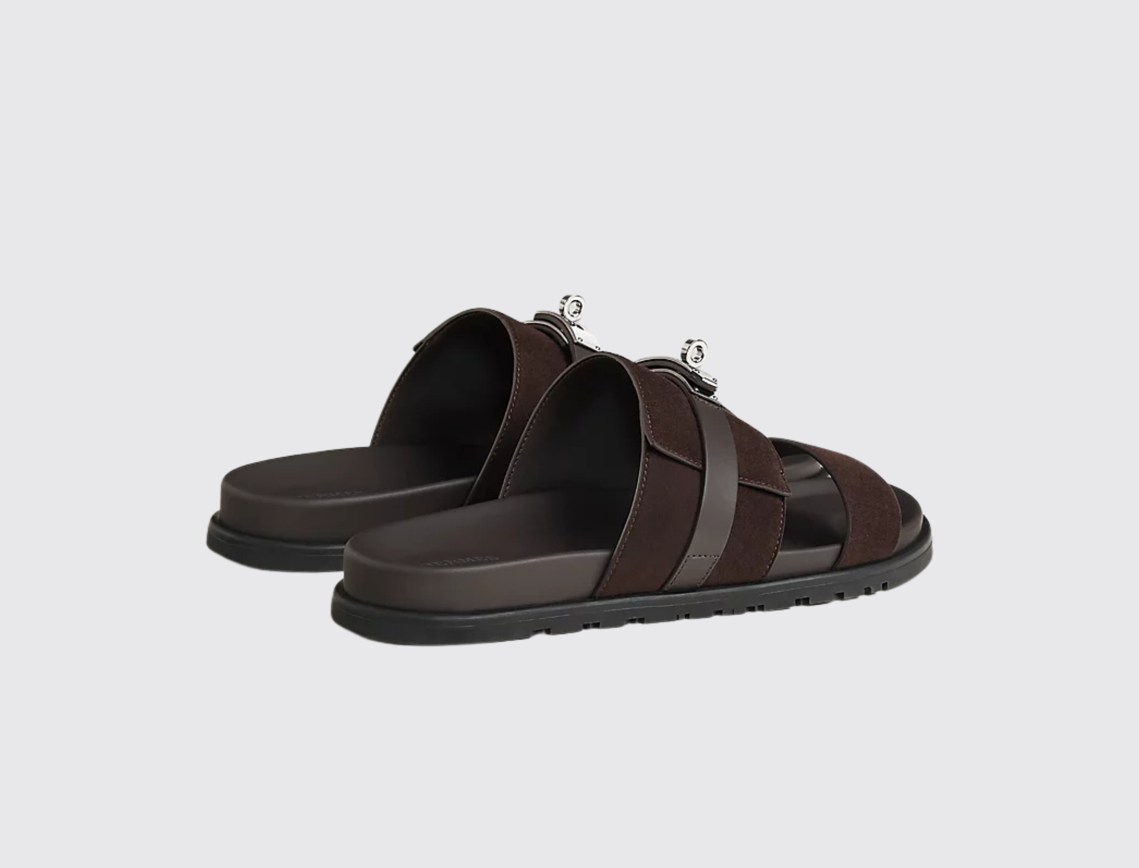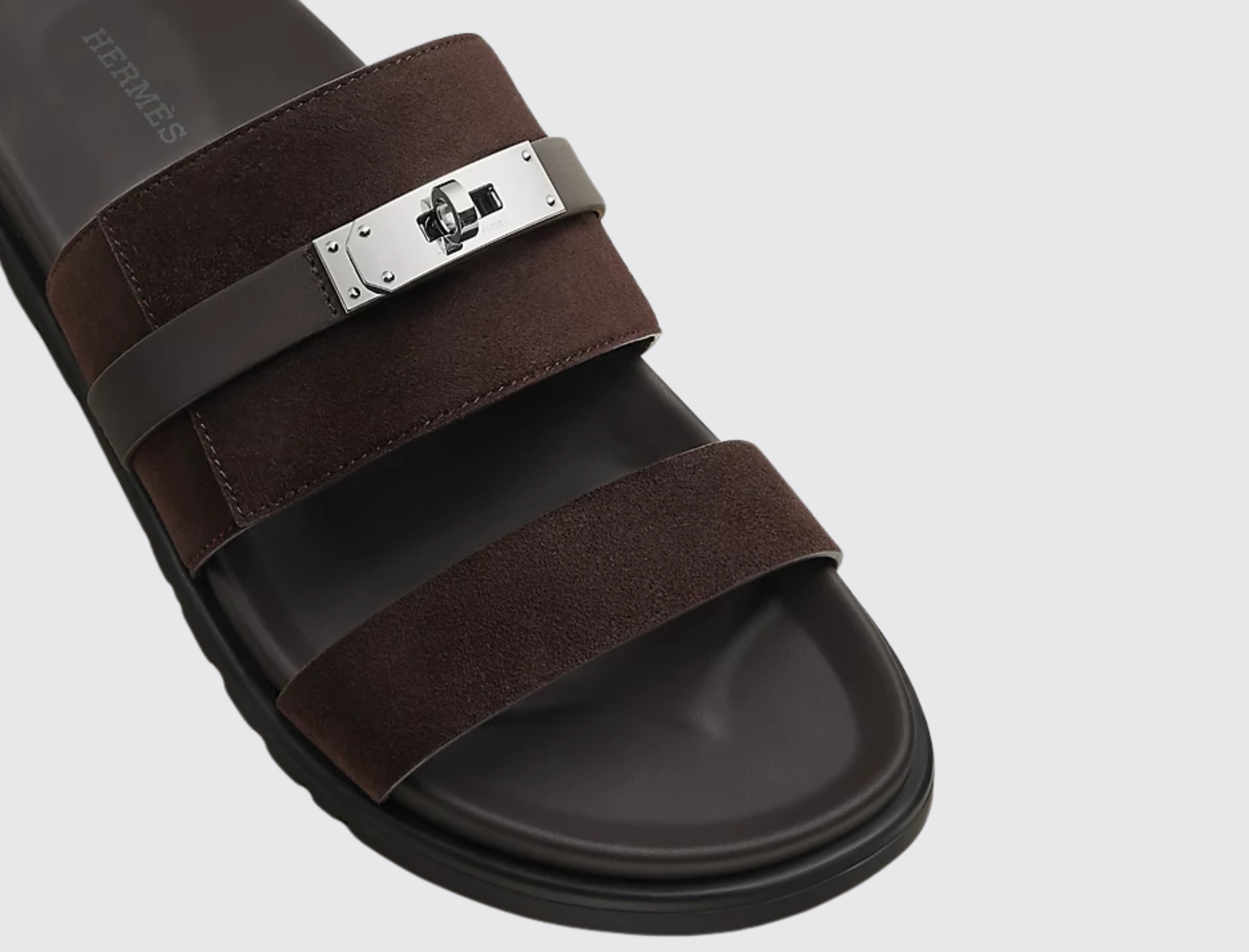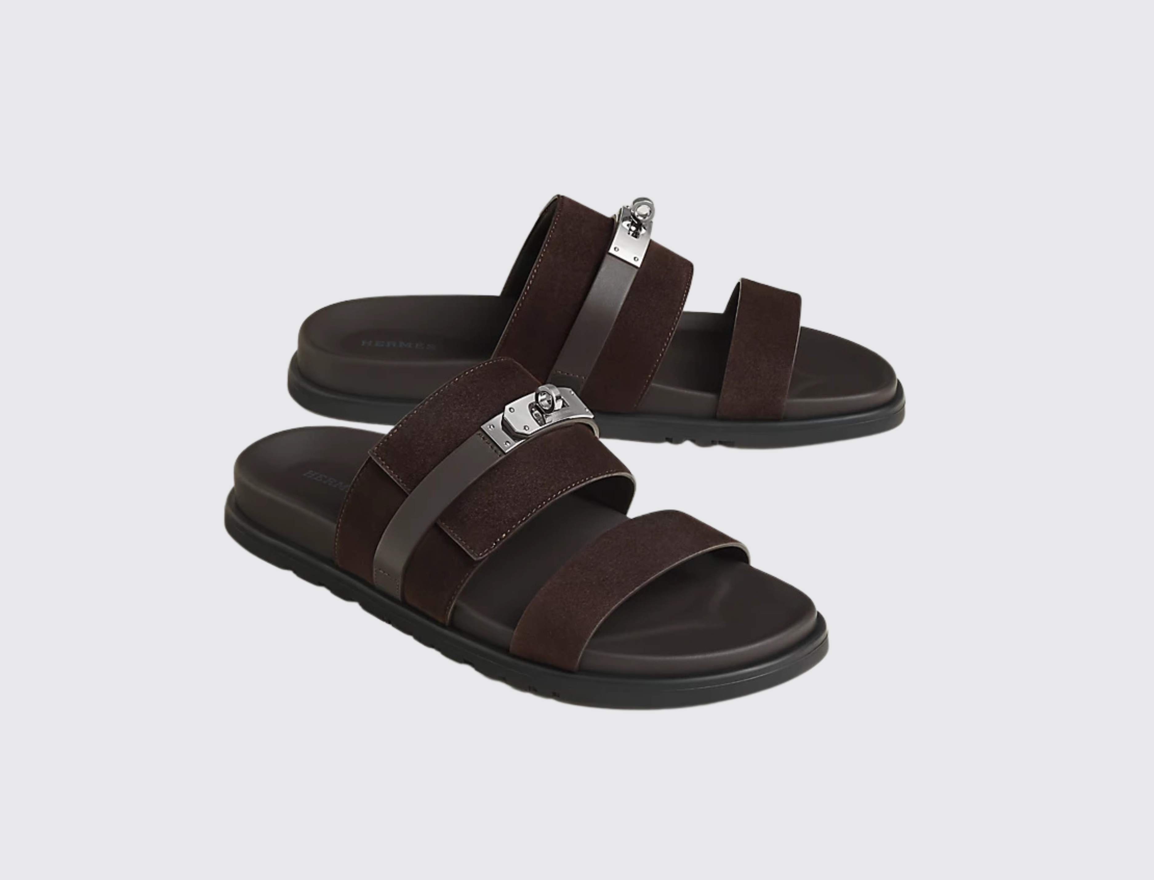 The Hermès Jackson Sandals for men combine sleek calfskin leather with a molded rubber sole and a signature Kelly buckle, delivering a modern, structured look with everyday comfort.