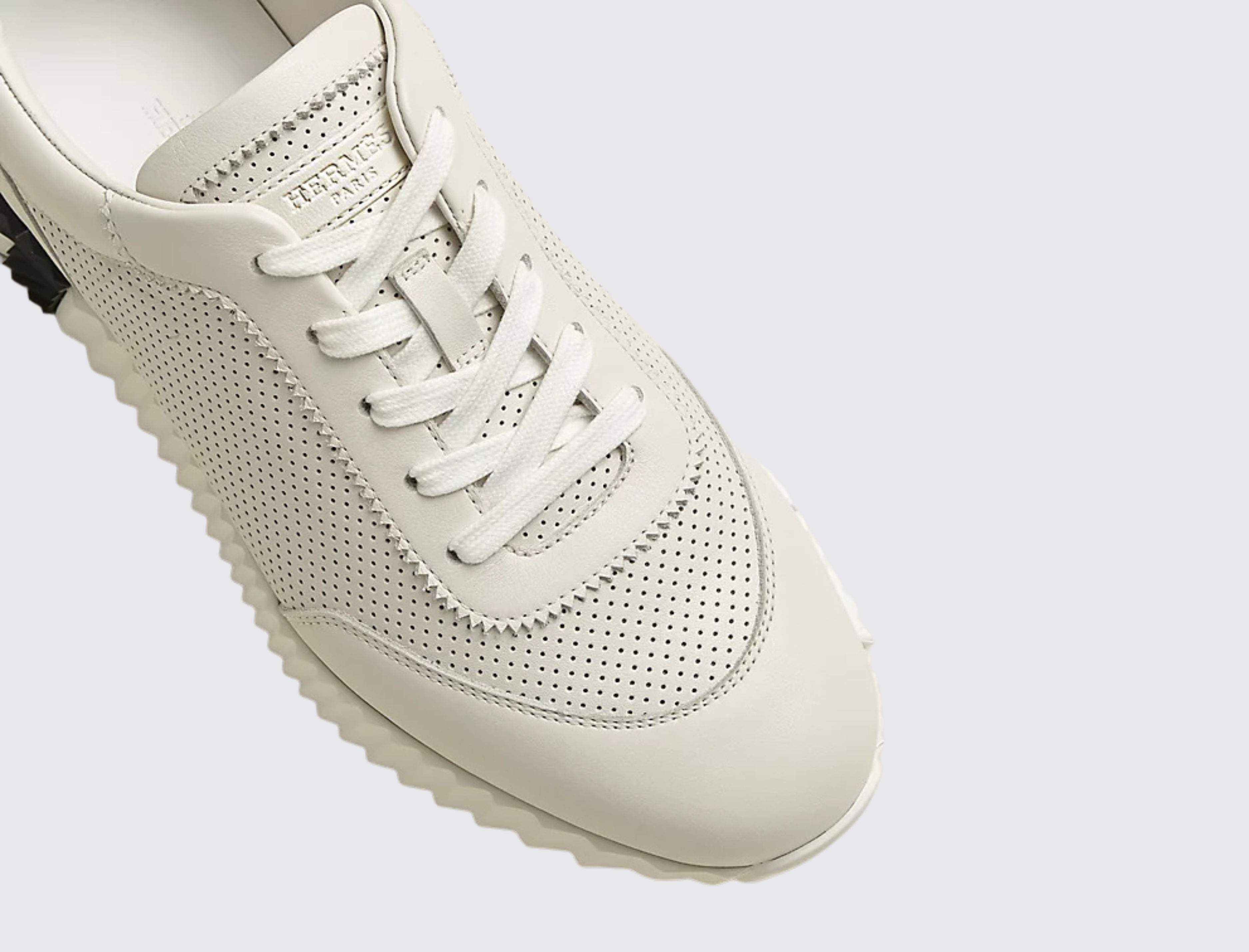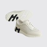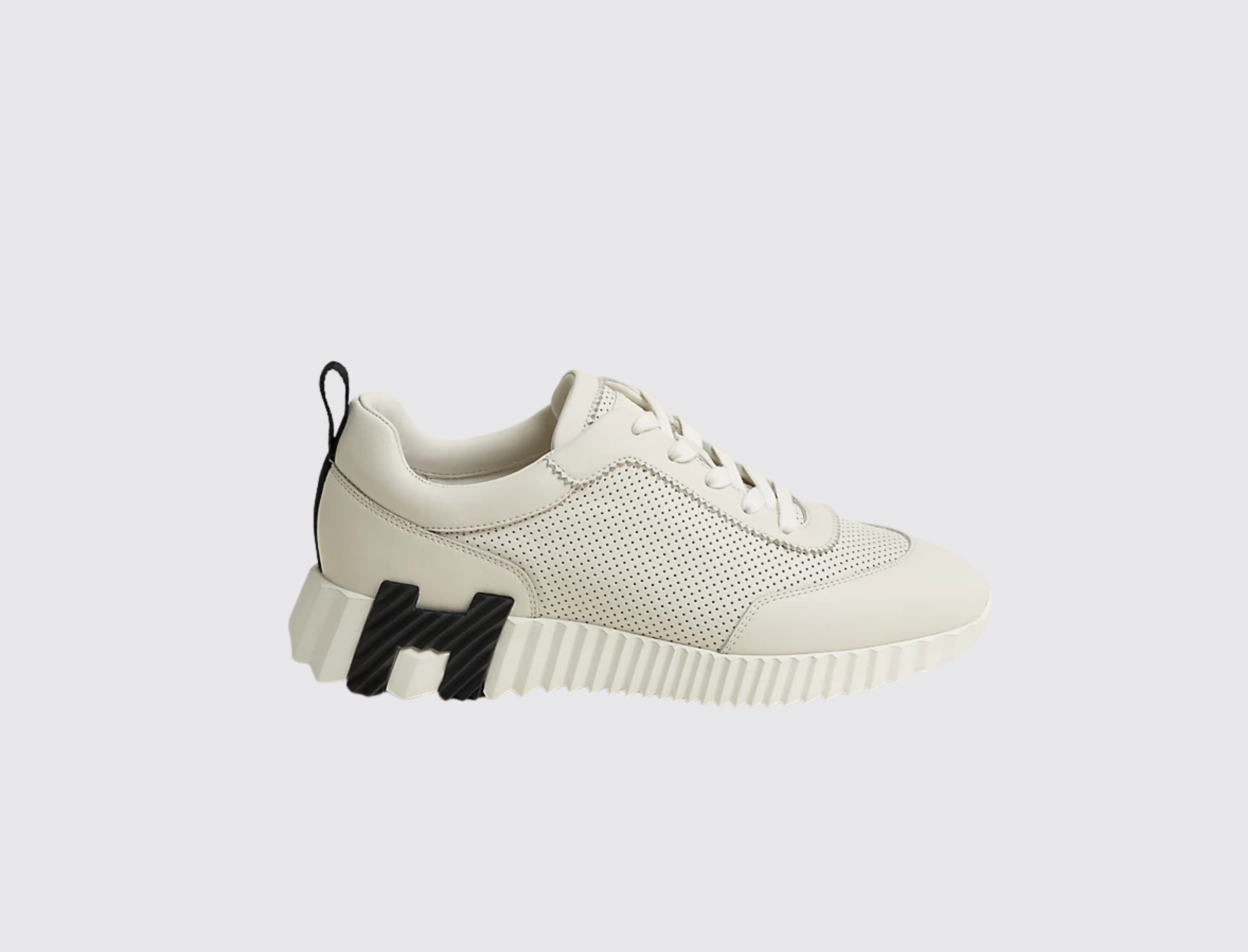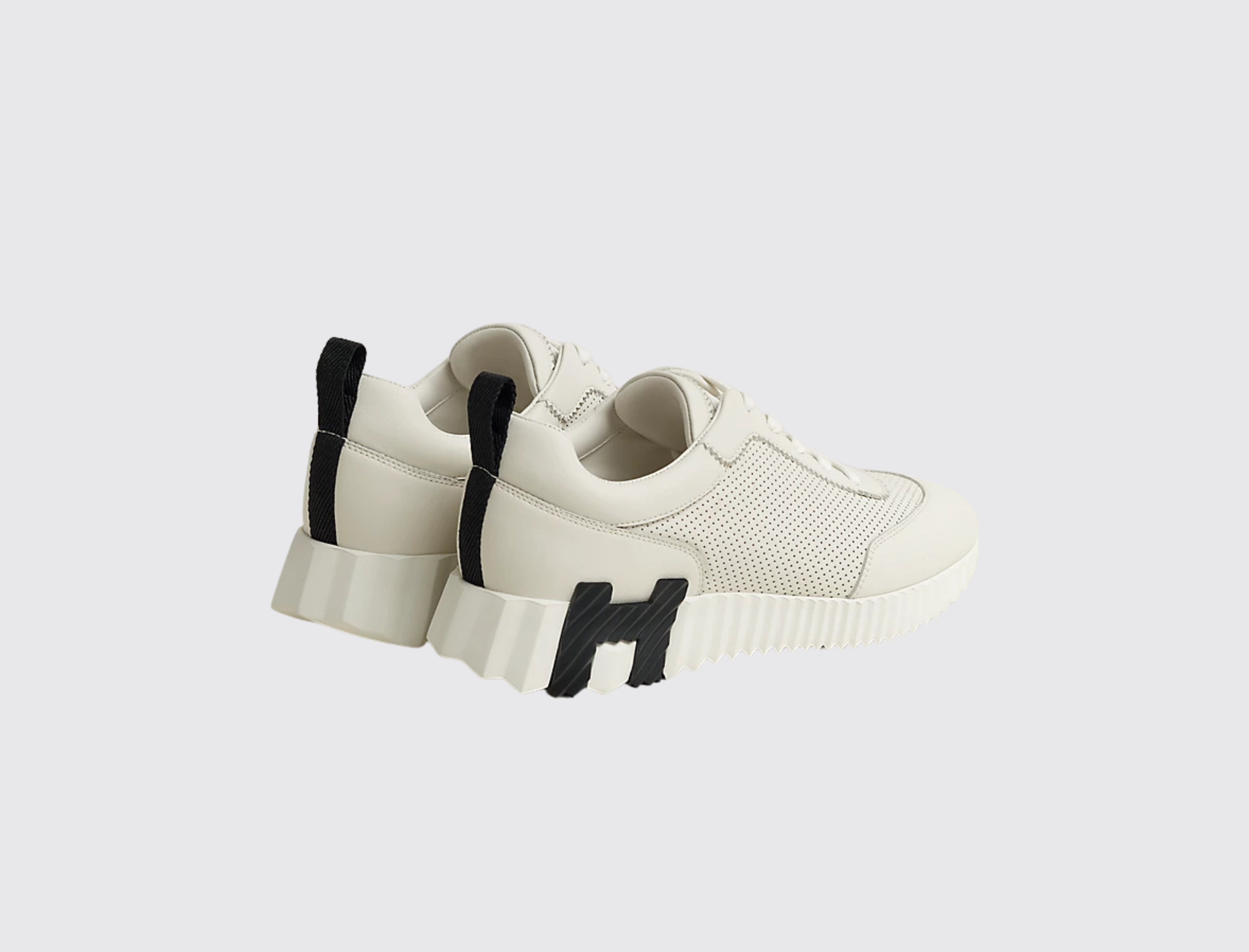 Showing a clean pair of heels, the Bouncing sneaker ventures into urban effervescence. So light that it no longer appears to touch the ground and full of untamed energy, it turns every moment into a high-speed adventure. Thinking big, it features a signature "H en biais" motif in a bold, oversized format.