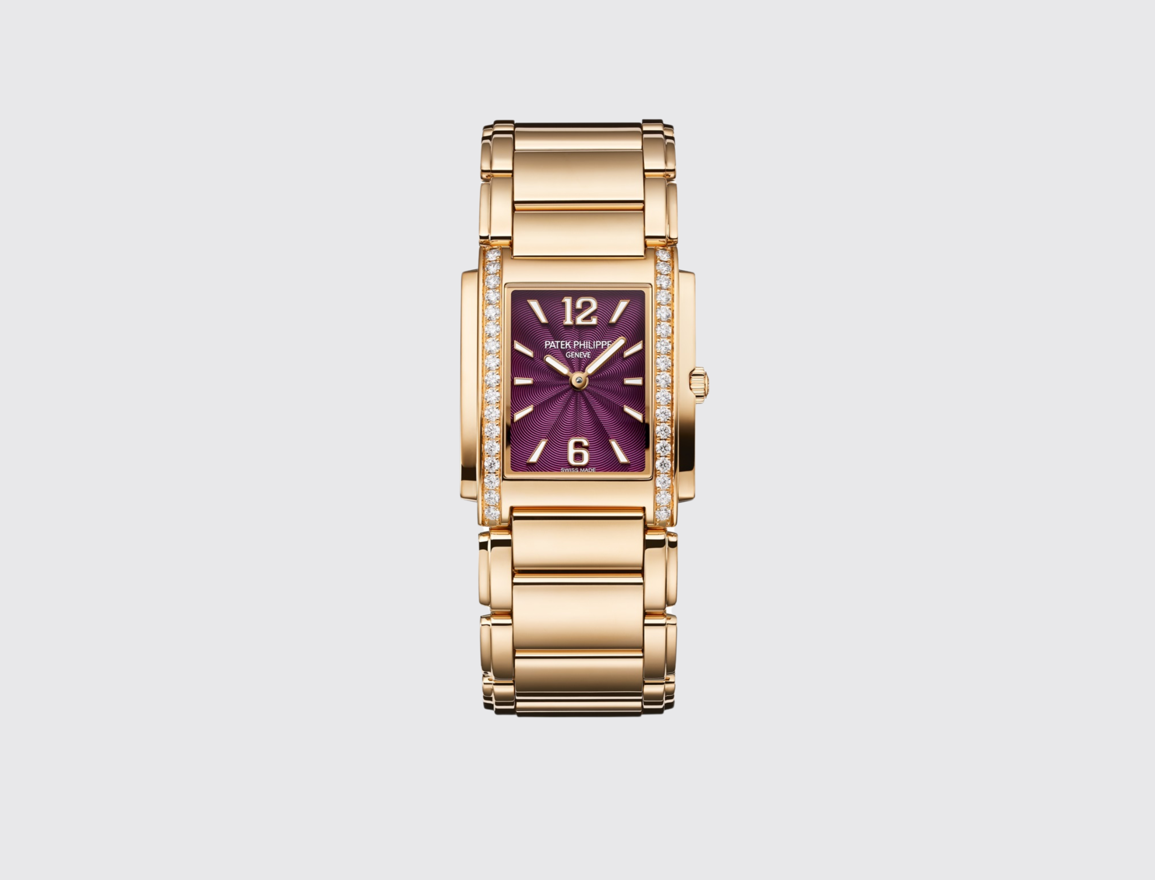 To celebrate the 25th anniversary of the Twenty~4 ladies' collection, which has become a classic of timeless elegance, Patek Philippe is introducing a new version of the quartz cuff-style model featuring a highly refined dial. The dial plate is first embossed with a concentric wave pattern, before being coated with dozens of successive layers of translucent purple lacquer and then transparent colorless lacquer which, once polished, create subtle plays on light and a beautiful depth effect.
