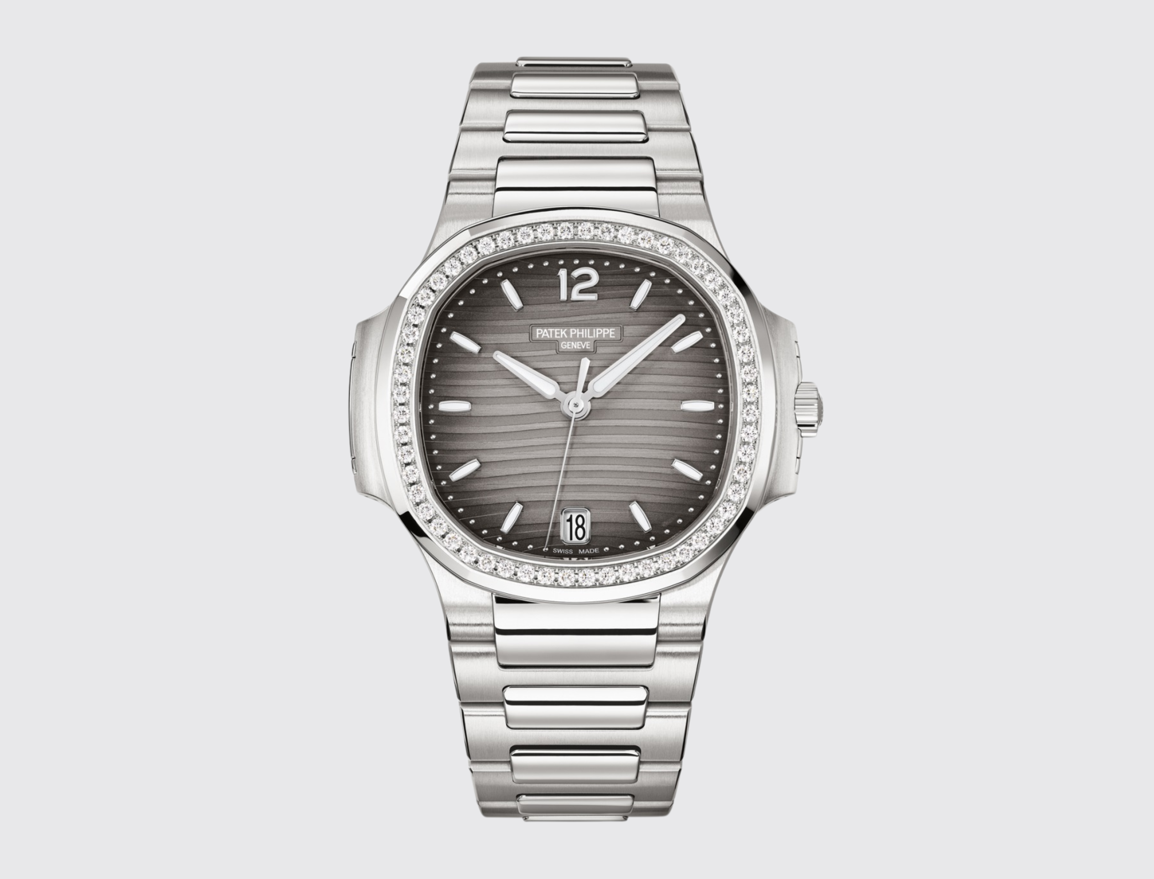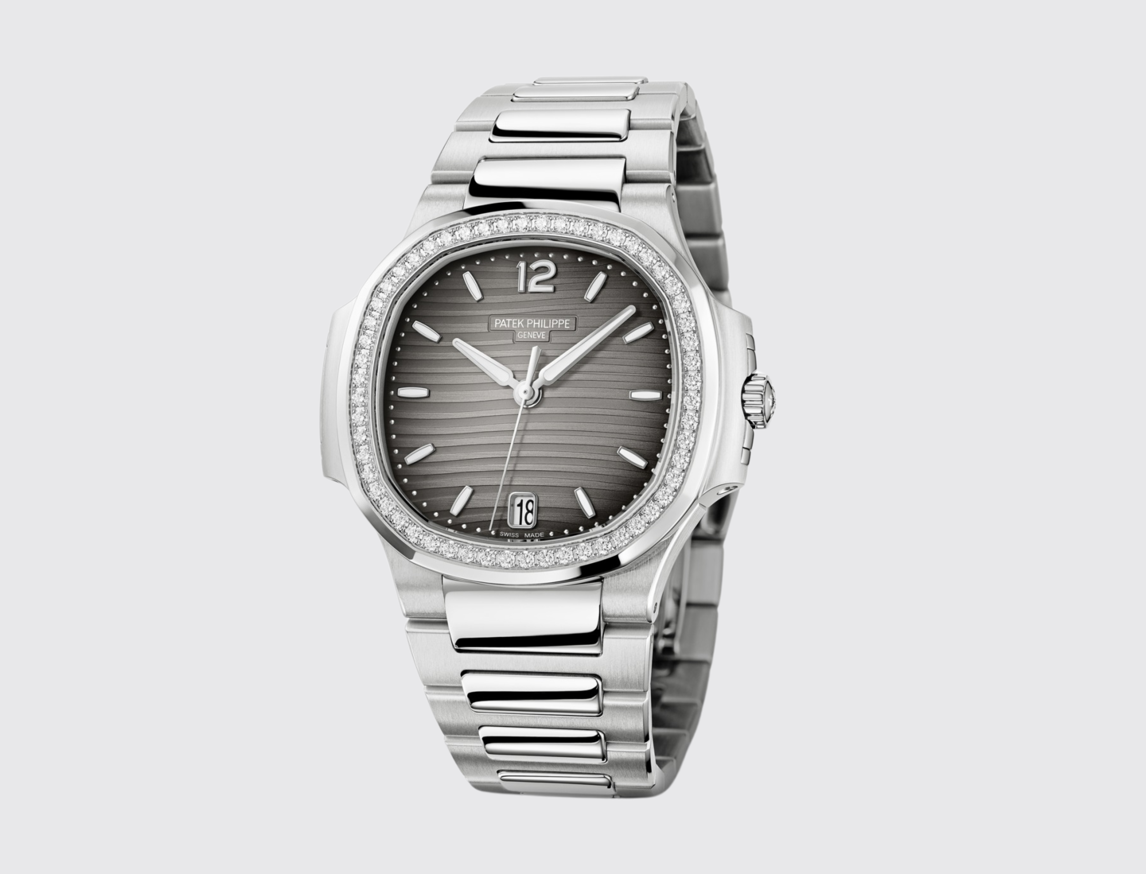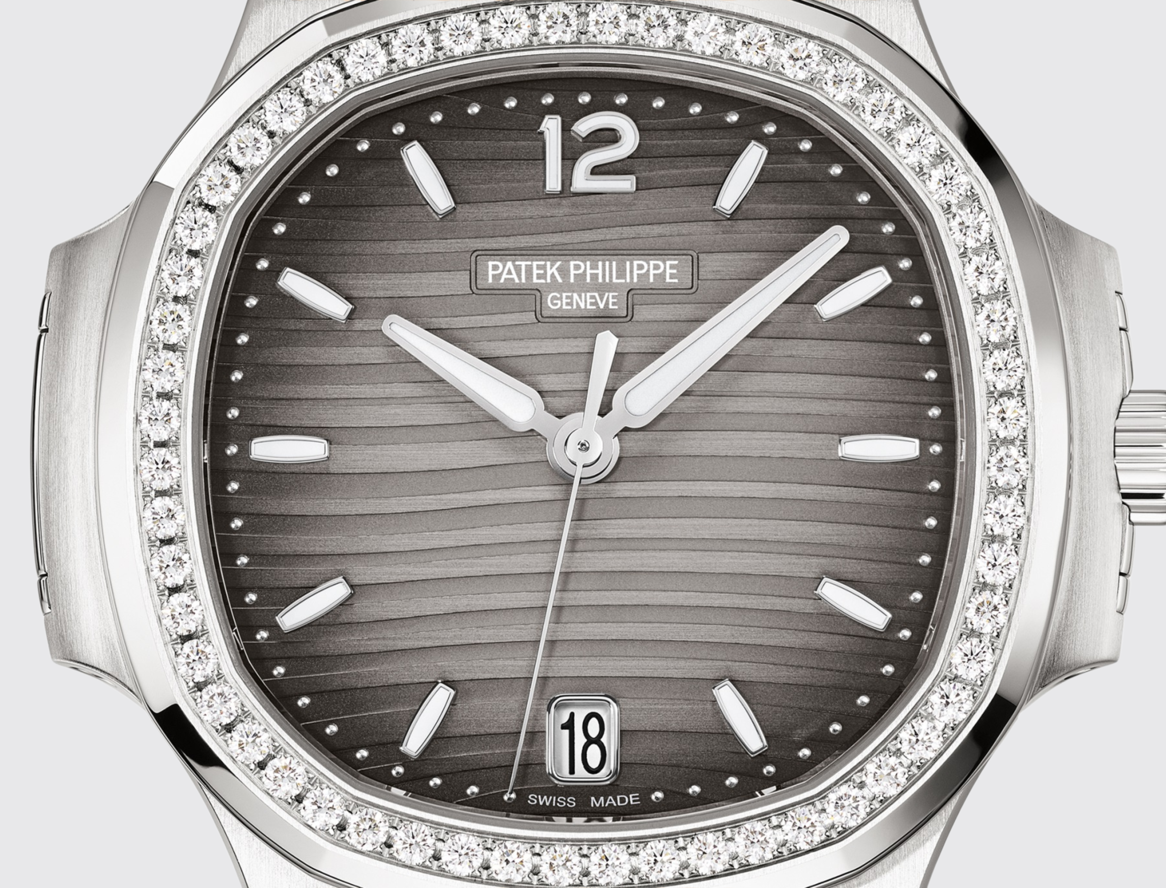 The Ladies Automatic Nautilus in steel with diamond-set bezel asserts its presence on the wrist with a slightly larger diameter (35.2 mm instead of 33.6 mm). Patek Philippe has also revised its range of dial colors, introducing blue opaline, silvery opaline or gray opaline, grading to black at the periphery.