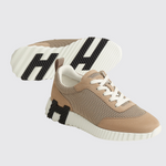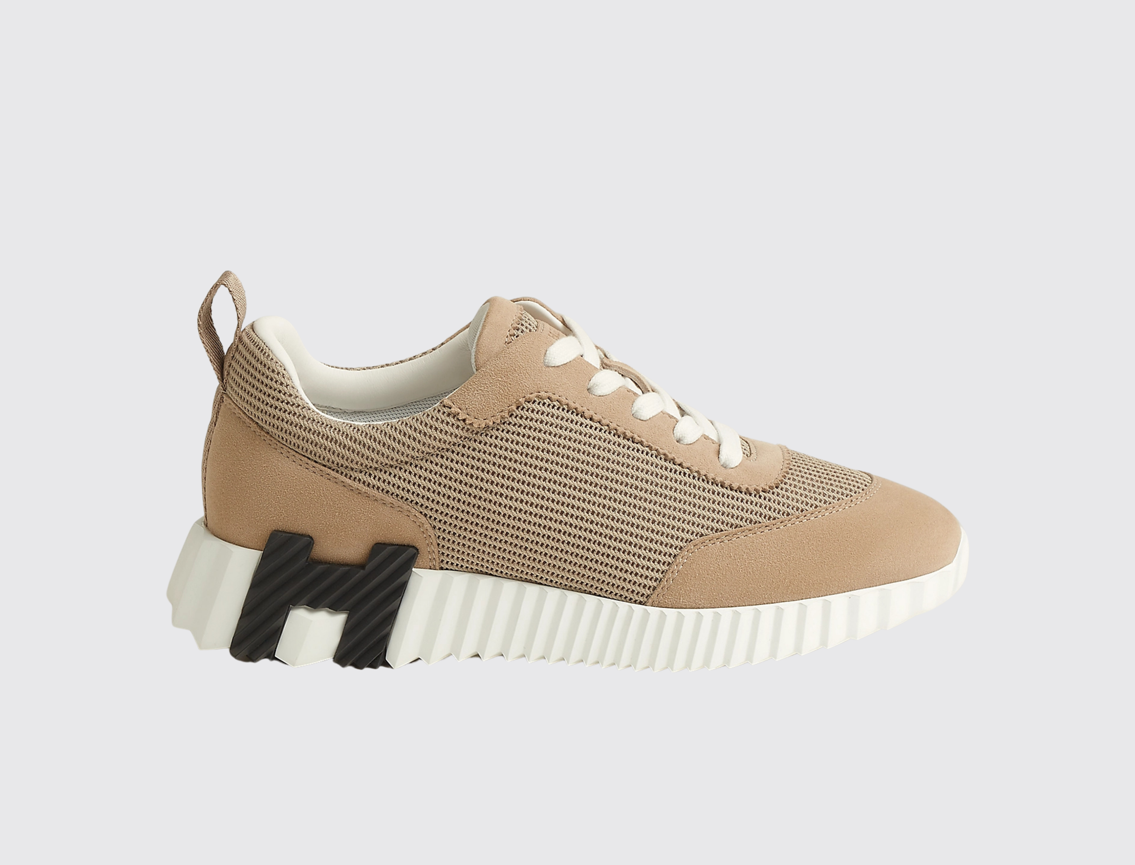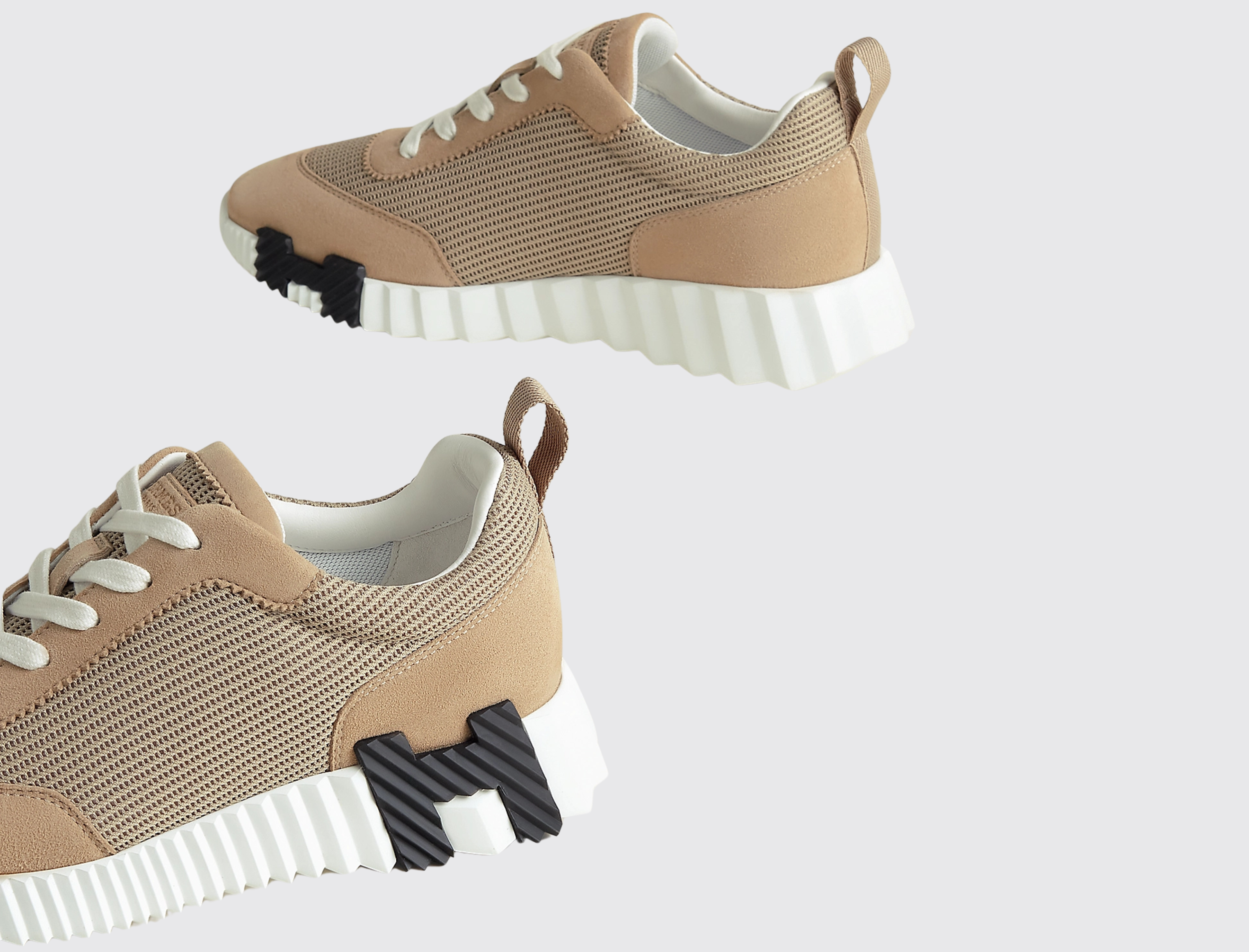 Showing a clean pair of heels, the Bouncing sneaker ventures into urban effervescence. So light that it no longer appears to touch the ground and full of untamed energy, it turns every moment into a high-speed adventure. Thinking big, it features a signature "H en biais" motif in a bold, oversized format.