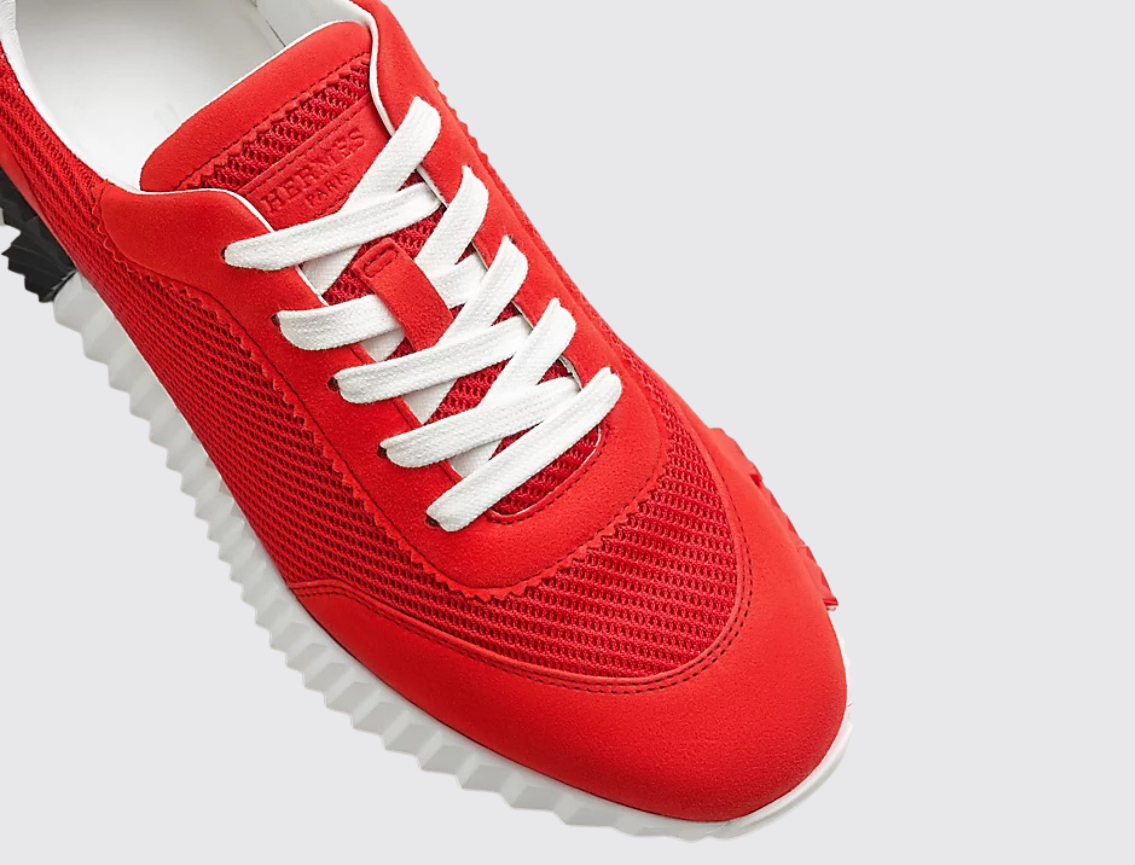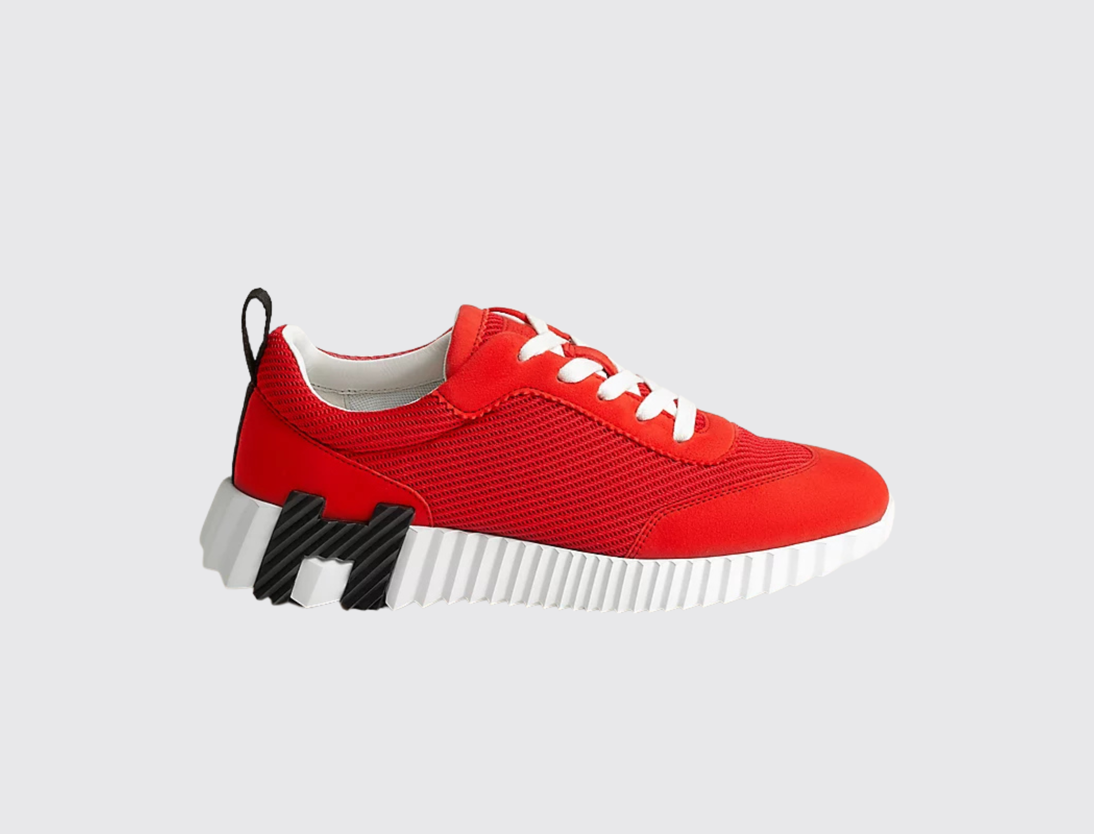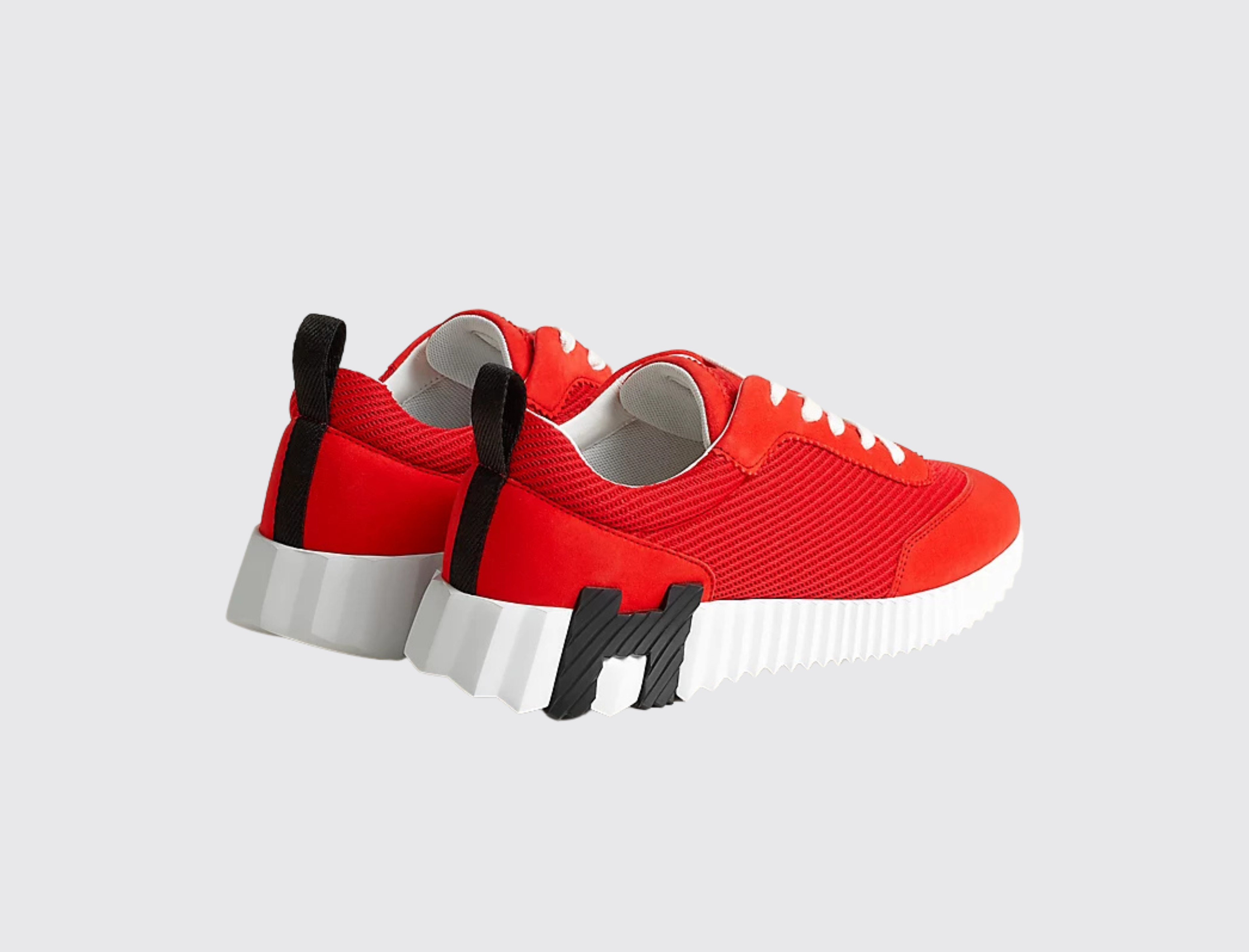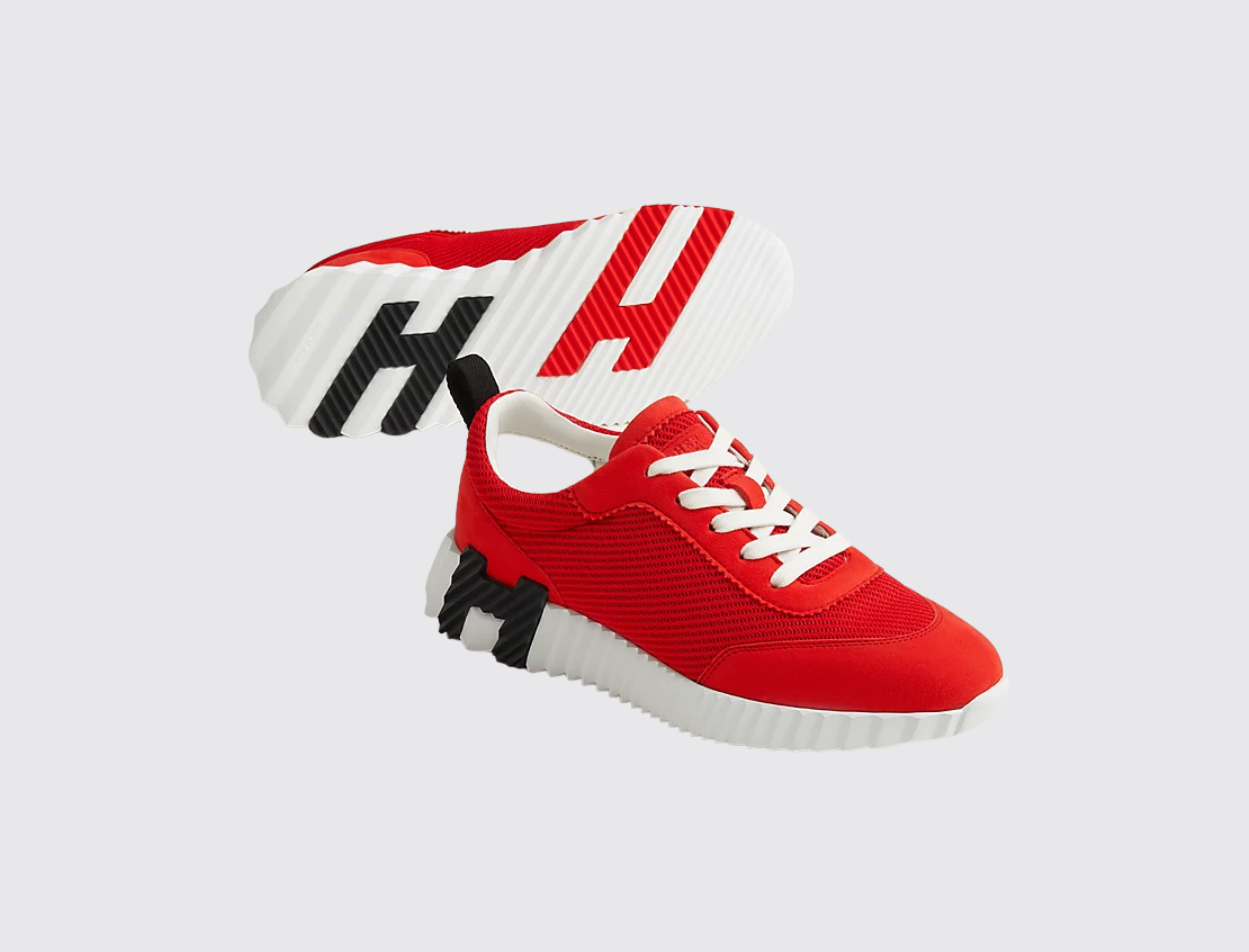 Showing a clean pair of heels, the Bouncing sneaker ventures into urban effervescence. So light that it no longer appears to touch the ground and full of untamed energy, it turns every moment into a high-speed adventure. Thinking big, it features a signature "H en biais" motif in a bold, oversized format.