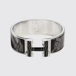 The Clic Clac H bracelet features a wide design with the classic Hermes H logo. It is adorned with unique printed enamel.