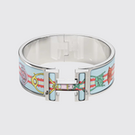 The Clic Clac H bracelet features a wide design with the classic Hermes H logo. It is adorned with unique printed enamel.