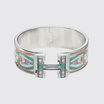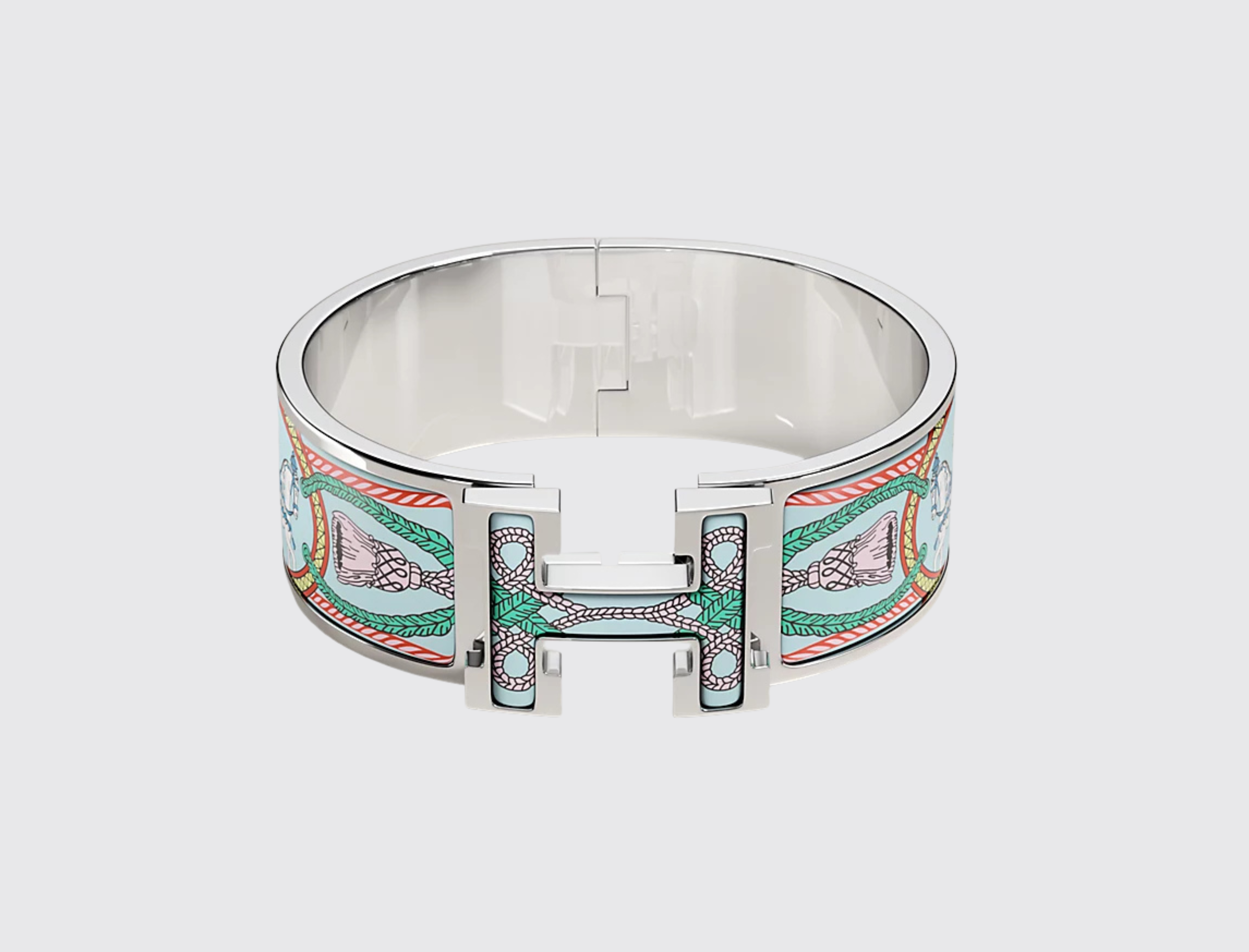The Clic Clac H bracelet features a wide design with the classic Hermes H logo. It is adorned with unique printed enamel.