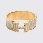 The Clic Clac H bracelet features a wide design with the classic Hermes H logo. It is adorned with unique printed enamel