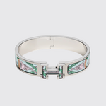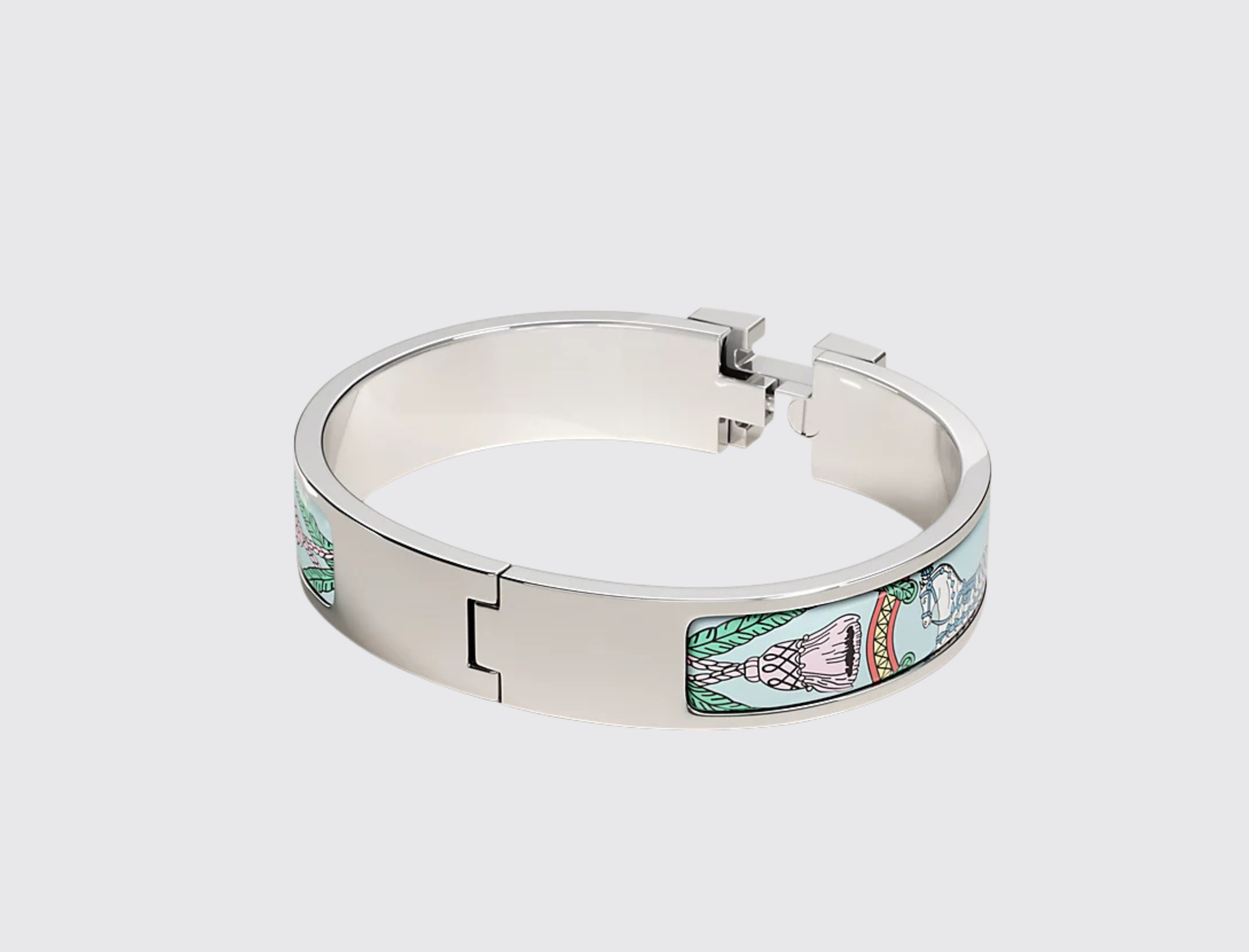 The Clic H Grand Apparat Bracelet features a narrow design adorned with the distinctive "Grand Apparat" printed enamel by Jacques Eudel. Its innovative toggle clasp, shaped as an "H," ensures secure and elegant closure, combining refined craftsmanship with a sophisticated aesthetic.