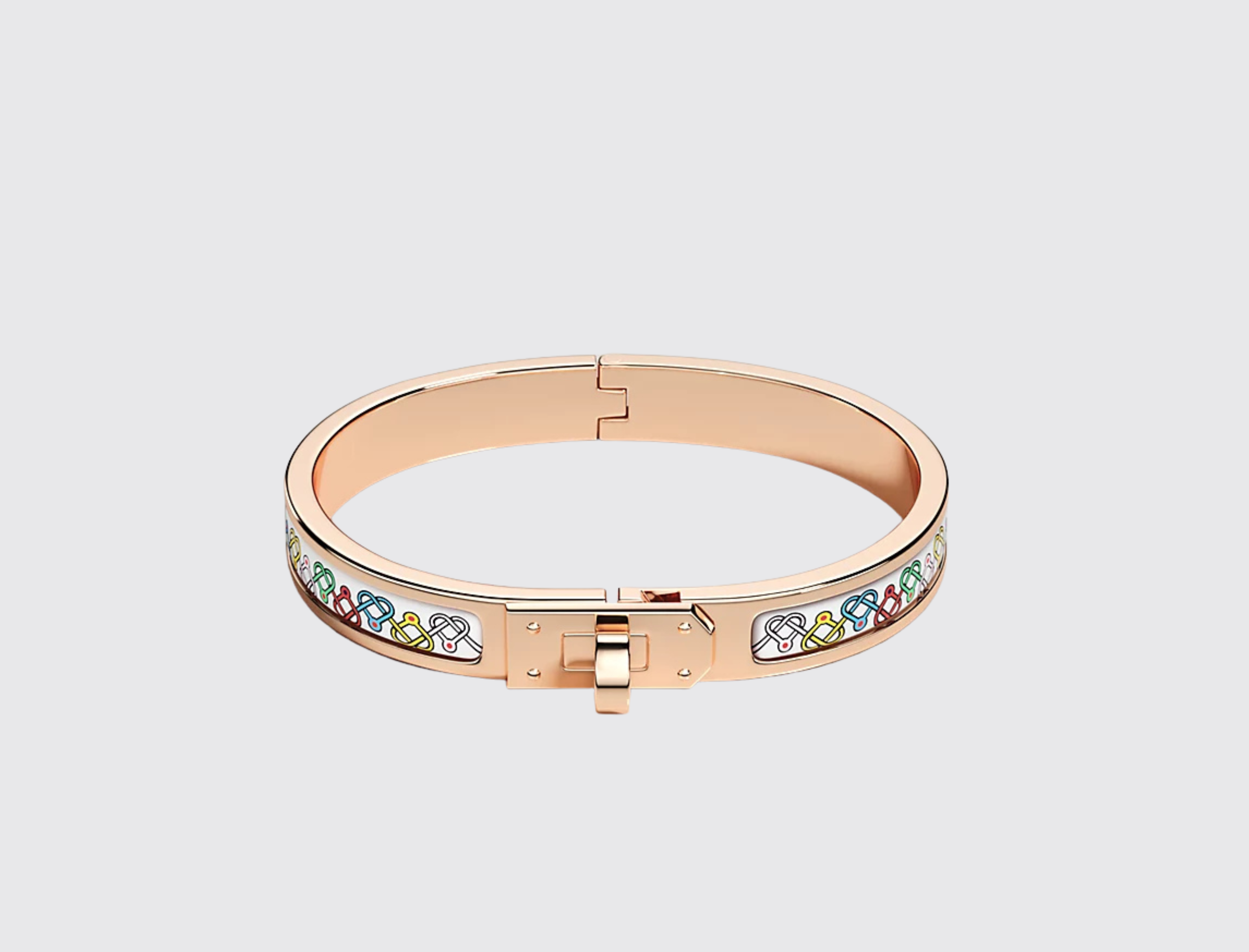 The Mini Clic Kelly bracelet features a slim design with the classic Hermes H logo. It is adorned with unique printed enamel.